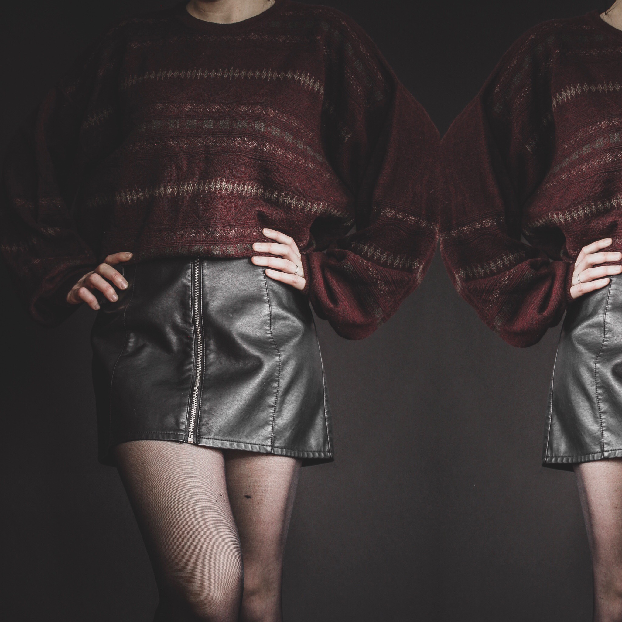 Vintage 90s signature slouchy sweater. All Last Rites signature sweaters are one-of-a-kind unisex vintage finds straight out of the 80s and 90s, with unique collars and patterns! This one is a light-to-medium weight cable knit with a folky fair isle pattern in burgundy with green and brown accents. Perfectly oversized, comfy and cozy. Crew neck, loose balloon sleeves and a boxy cut. 50-50 acrylic and wool blend. Feels soft to me but will definitely have a bit of itch factor to some people - if you're not sensitive to knits or like to layer long sleeves under your sweaters, you'll be fine!