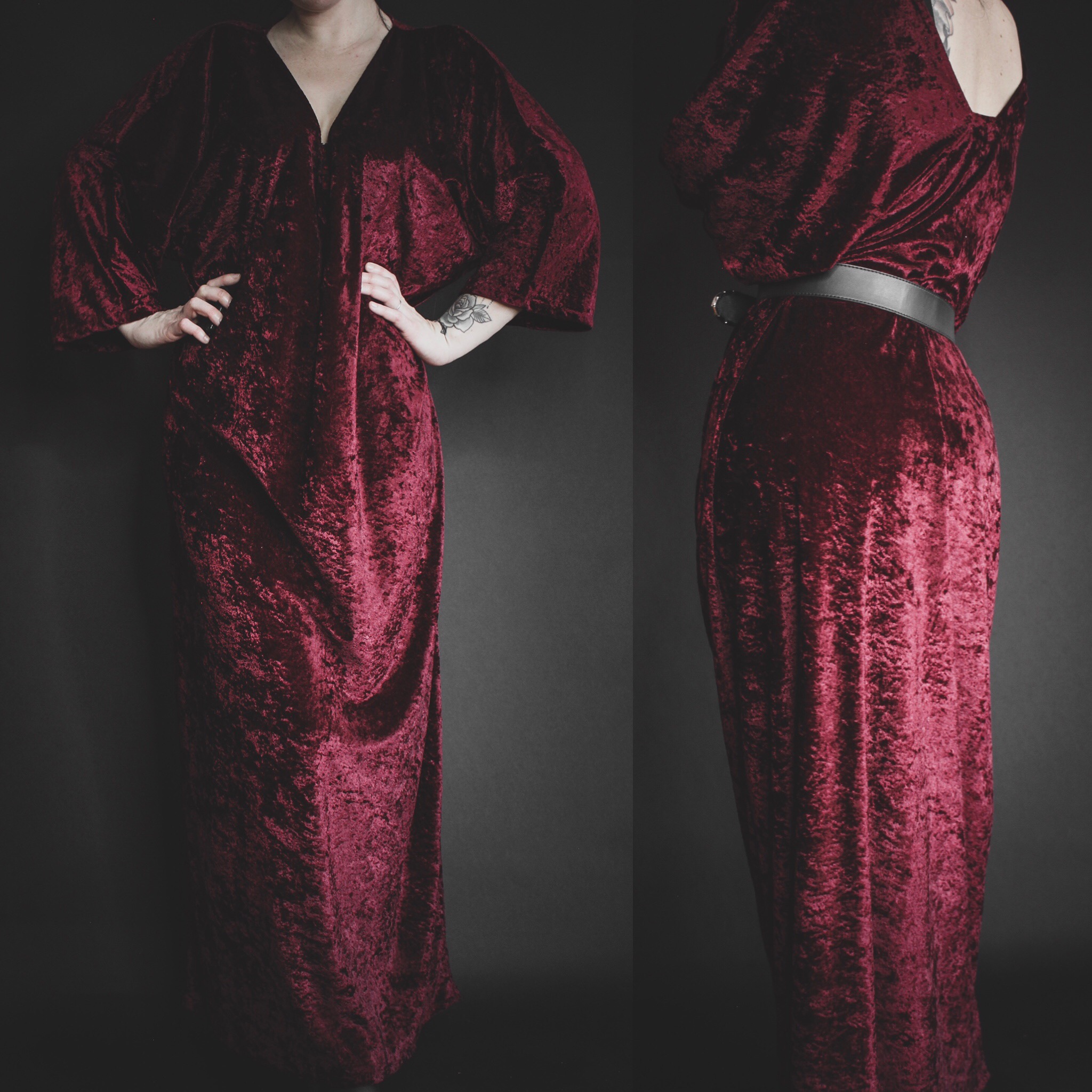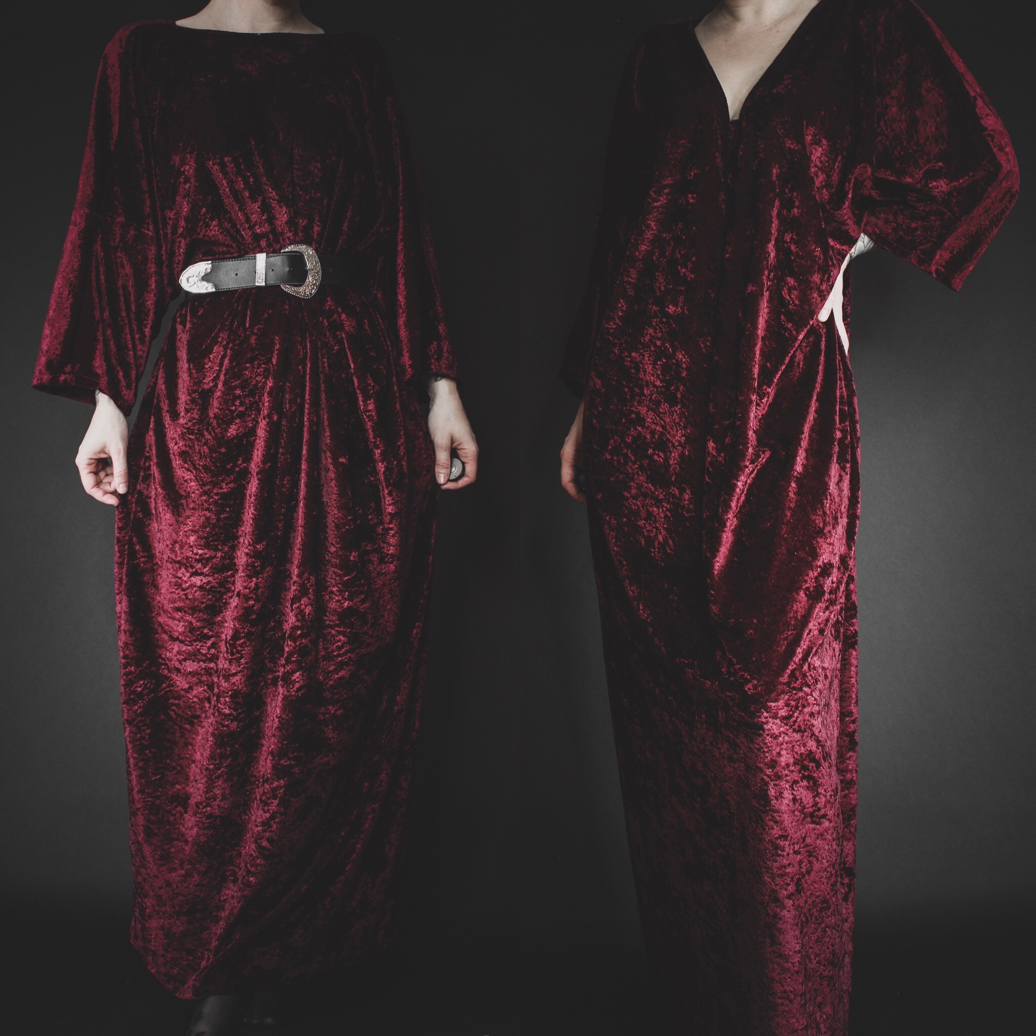Vintage 80s burgundy crushed velvet batwing gown. Super soft and drapey, roomy oversized cut with wide 3/4 length batwing sleeves and dropped shoulder seams. She's reversible! Deep v-neck can be worn in front or back. Endless styling possibilities - belt it to cinch the waist, wear it falling off the shoulder, pair with platforms and a leather jacket or your fanciest heels and a faux fur coat. This one is giving me major Olsen twins vibes. Unlined, pull-on style, slightly stretchy all over (though it is meant to drape loosely). Belt is not included.