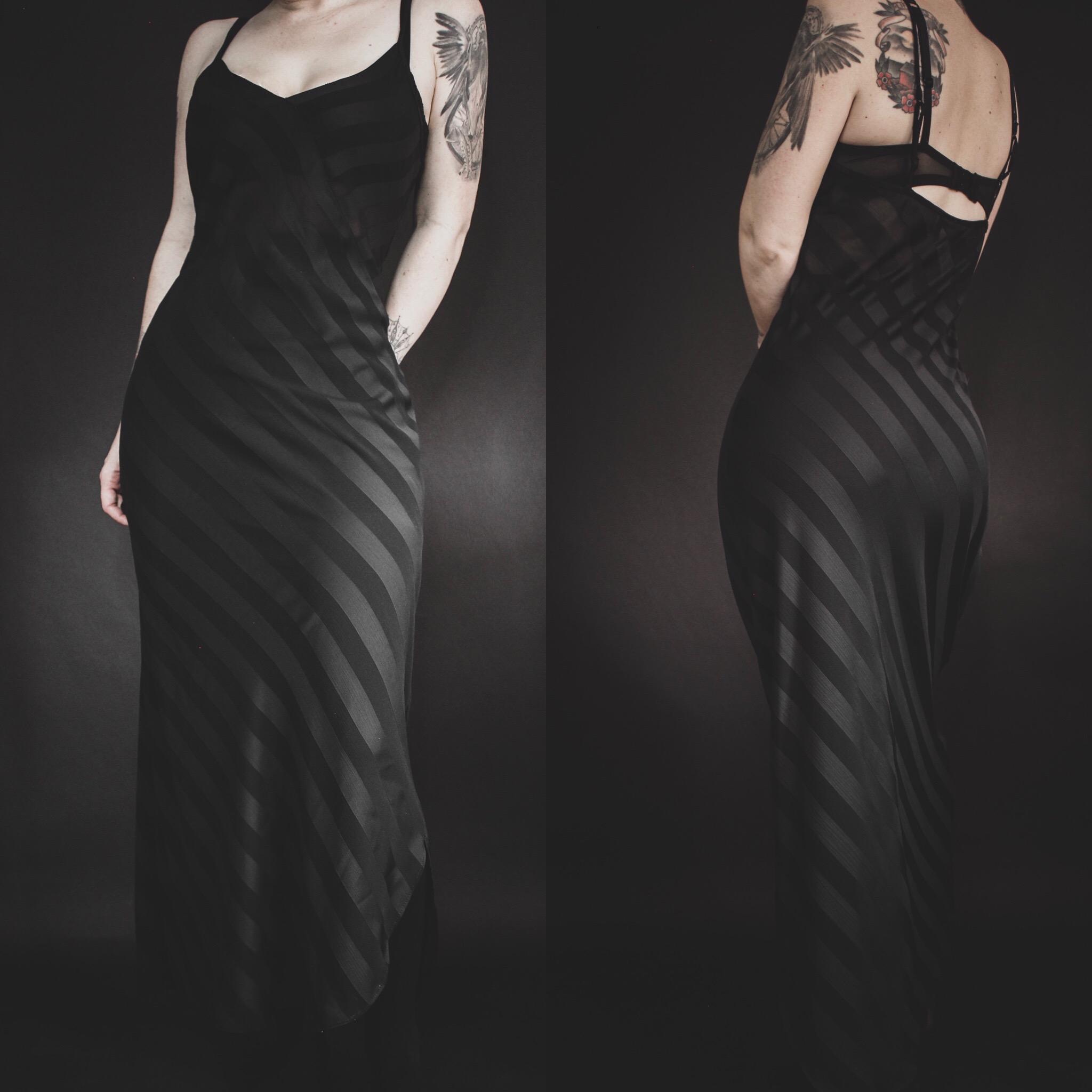 Vintage 90s Samhain dressing gown! Sheer black poly chiffon with a diagonal stripe situation all over. Partially adjustable straps, deep v-neck and a rounded hemline. Straight column cut with no defined waist or bust area, so it will fit a variety of body types. No stretch whatsoever. Pull-on style, unlined. She is technically a dressing gown (perfect for December evenings by the fireside) but I personally would pair with a slip and wear it out to a holiday event!
