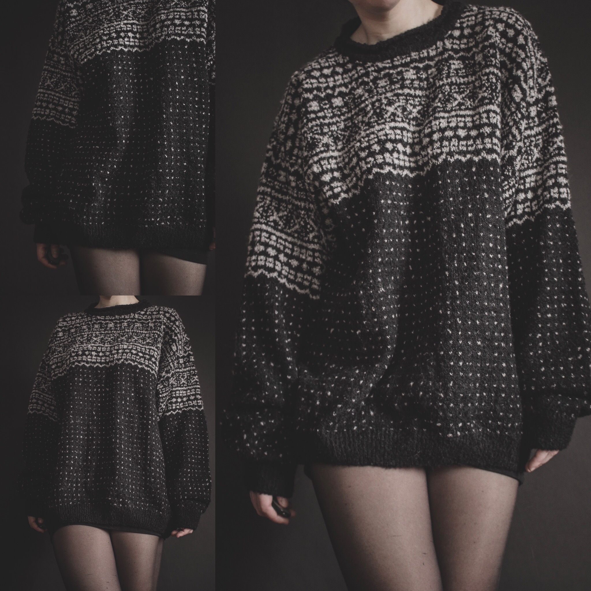 Vintage 90s signature slouchy sweater. All Last Rites signature sweaters are one-of-a-kind unisex vintage finds straight out of the 80s and 90s, with unique collars and patterns! This one is a heavyweight weight chunky, nubby knit with a folky fair isle pattern in black and gray. Perfectly oversized, comfy and cozy. Crew neck, loose balloon sleeves and a boxy cut. Acrylic, poly and wool blend. This will definitely have some itch factor to some people - if you're not sensitive to knits or like to layer long sleeves under your sweaters, you'll be fine! Has a bit of pilling and some tiny snags and loose threads here and there - this is normal for well-loved vintage sweaters and gives it the perfect touch of broken-in rustic vibes.