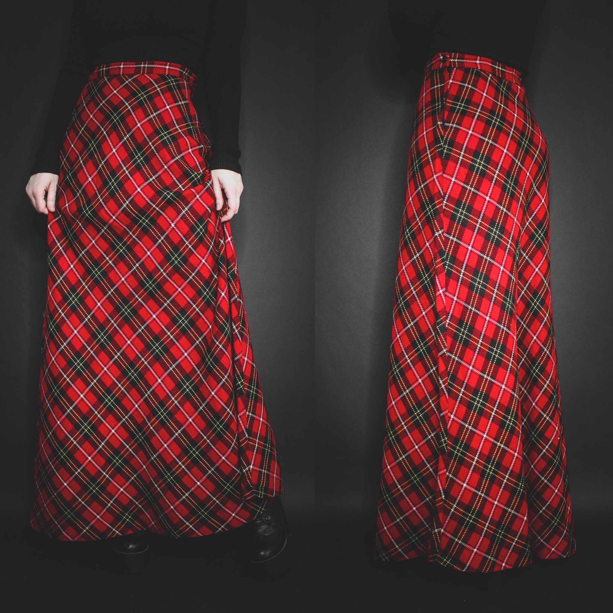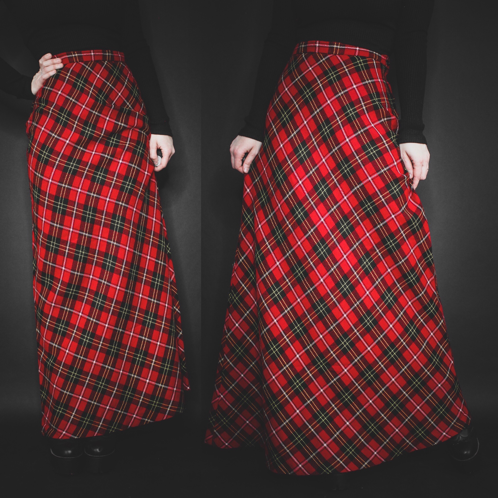 Vintage 90s holiday plaid maxi skirt. The ultimate cozy statement piece for all your wintertime looks! Warm, cozy 100% acrylic flannel. Classic plaid in bright red with black, gold and white accents. Side zip and button closure at the top. This one feels soft to me but will definitely have some itch factor to some people, so it would be most comfortable layered with tights or leggings underneath - helpful for extra warmth! Meant to be worn high waisted. May have a bit of pilling here ad there. Unlined, no stretch.