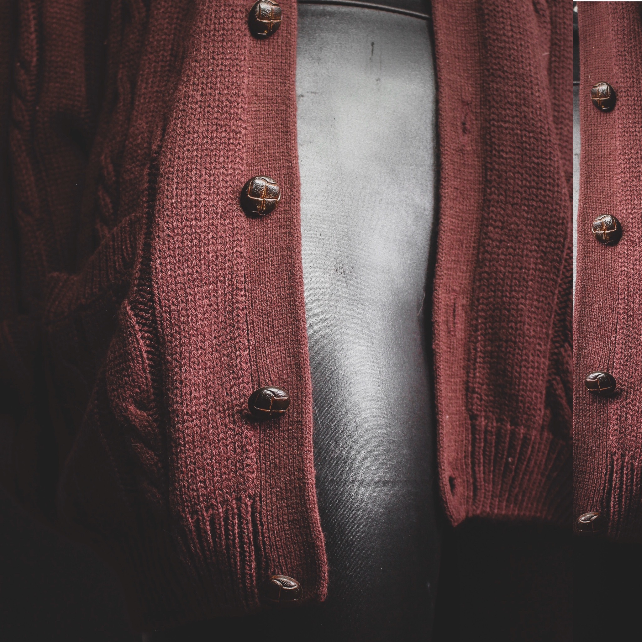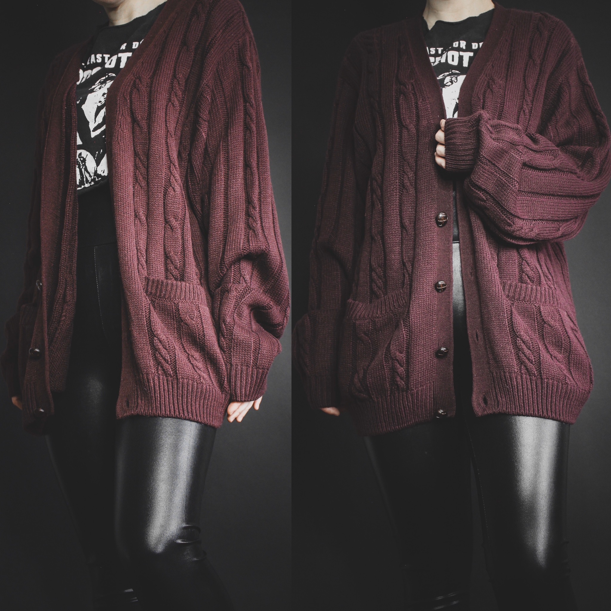 Vintage 90s signature slouchy cardigan. All Last Rites signature sweaters are one-of-a-kind unisex vintage finds straight out of the 80s and 90s, with unique collars and patterns! This one is a midweight cable knit in a deep burgundy shade. V-neck, cool 3D tortoiseshell buttons down the front, loose balloon sleeves and a boxy cut. 100% acrylic, feels nice and soft to me but might have a bit of itch factor to some people - if you're not sensitive to knits or like to layer long sleeves under your sweaters, you'll be fine! Wonderfully slouchy, cozy and comfy.