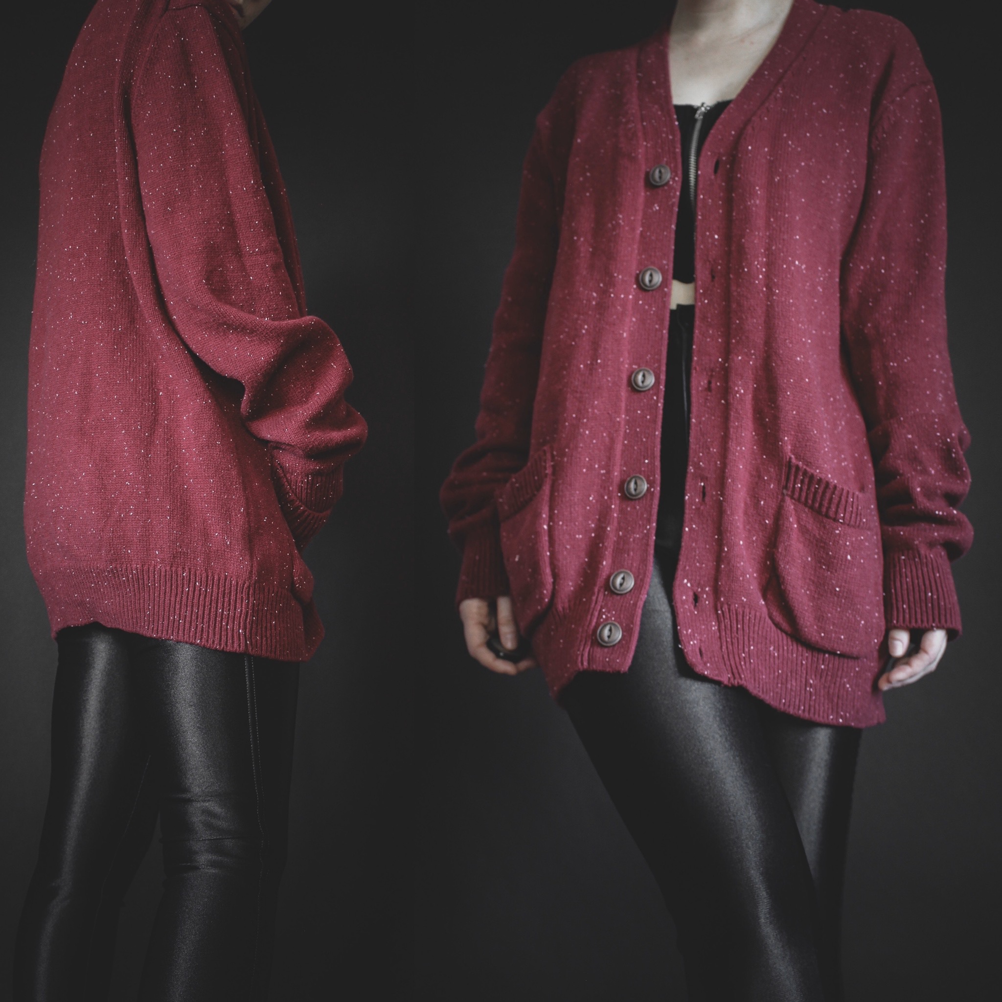 Vintage 90s signature slouchy cardigan. All Last Rites signature sweaters are one-of-a-kind unisex vintage finds straight out of the 80s and 90s, with unique collars and patterns! This one is a midweight chunky knit in a light burgundy shade (more pink than red) with little white accents all over that look like snow! V-neck, buttons down the front, loose balloon sleeves and a boxy cut - and the best part, pockets! Cotton-wool-nylon blend, feels nice and soft to me but might have a bit of itch factor to some people - if you're not sensitive to knits or like to layer long sleeves under your sweaters, you'll be fine! Wonderfully slouchy, cozy and comfy and guaranteed to keep you warm due to the cotton and wool blend!