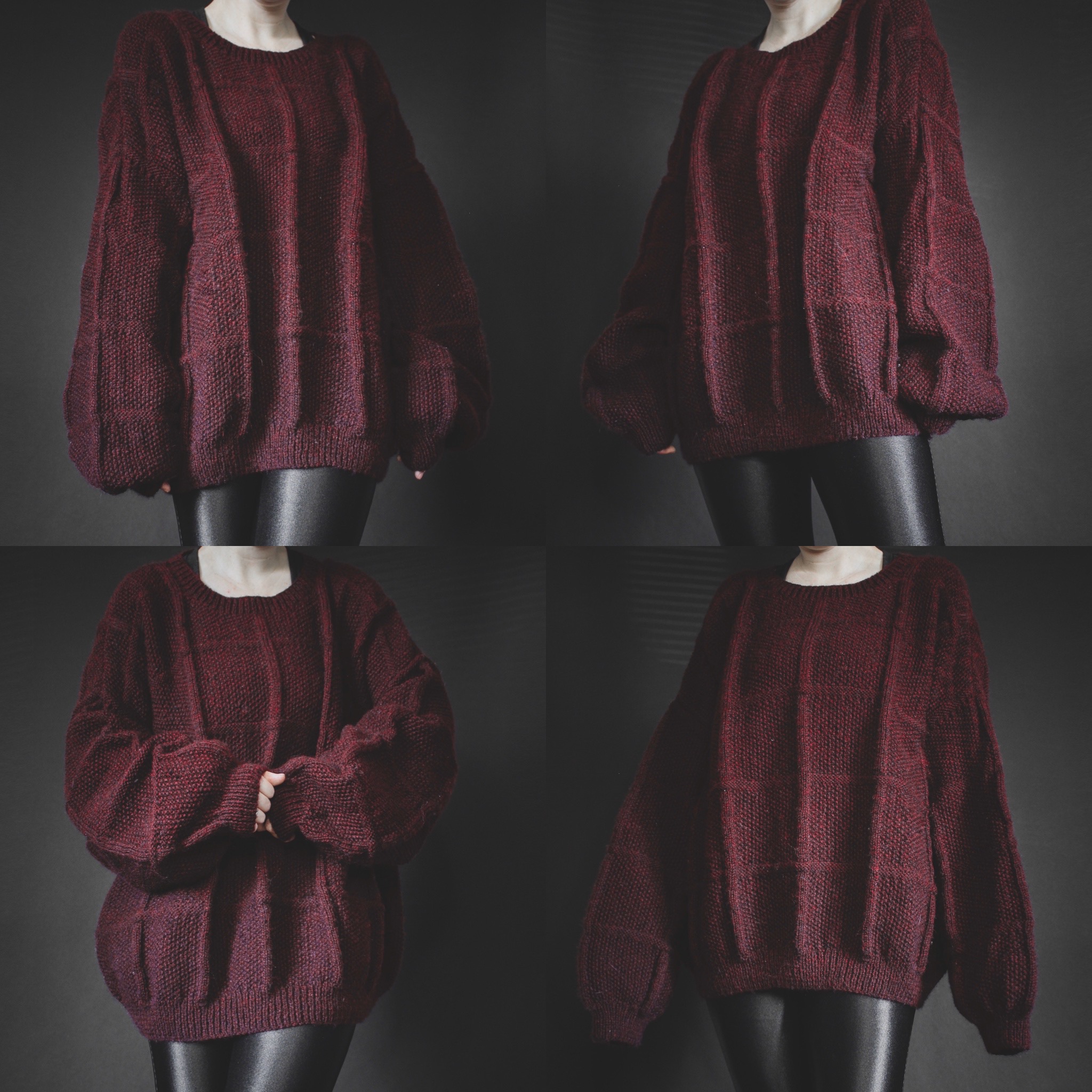 Vintage 90s signature slouchy sweater. All Last Rites signature sweaters are one-of-a-kind unisex vintage finds straight out of the 80s and 90s, with unique collars and patterns! This one is a suuuuper heavyweight marled knit in a deep burgundy shade. This is the chunkiest, comfiest, most dramatic cozy sweater I've ever seen! Perfectly oversized and comfy. Crew neck, super big loose balloon sleeves (almost into statement sleeve territory!) and a slouchy boxy cut. Acrylic and nylon blend. This one feels soft to me but may have a tiny bit of itch factor to some people - if you're not sensitive to knits or like to layer long sleeves under your sweaters, you'll be fine!