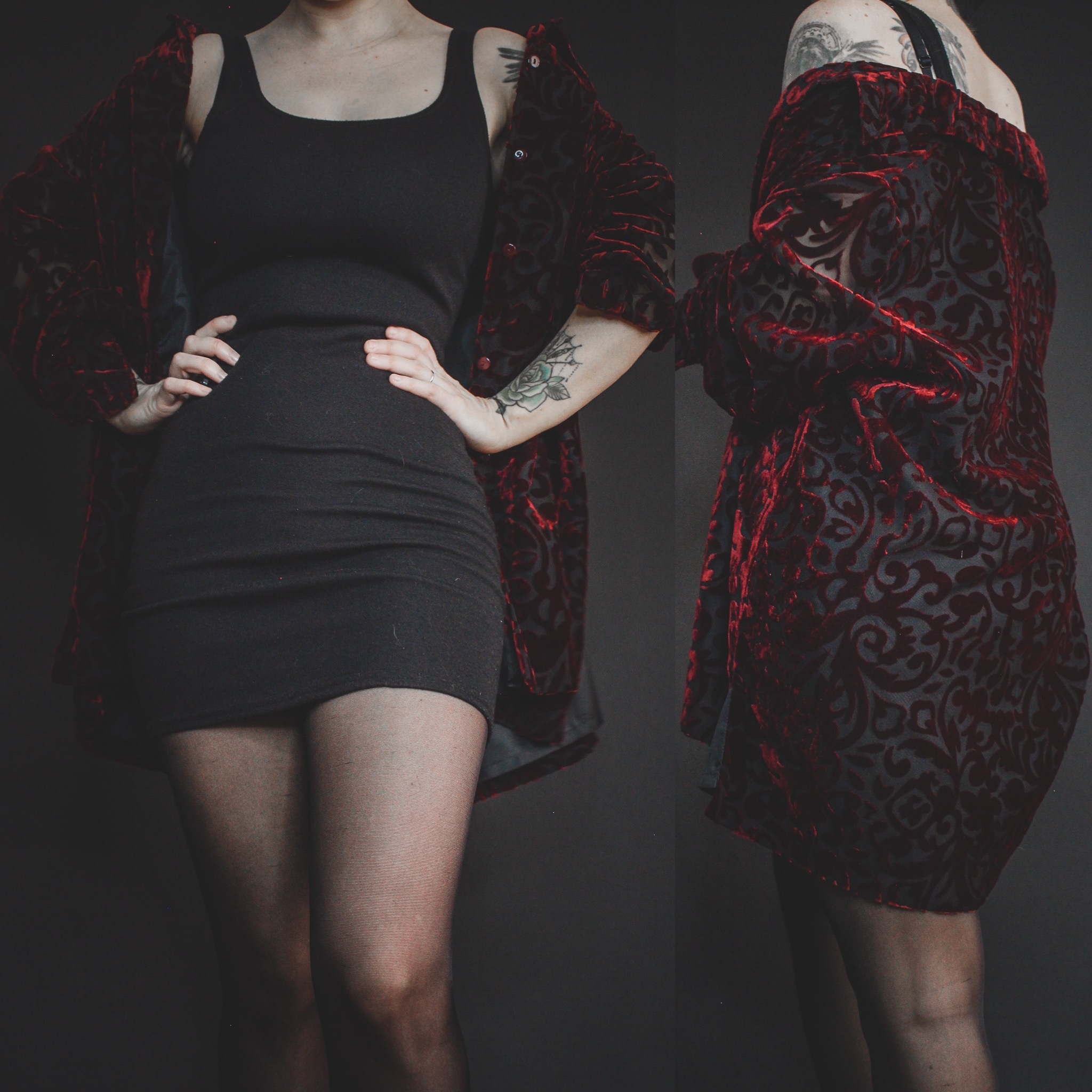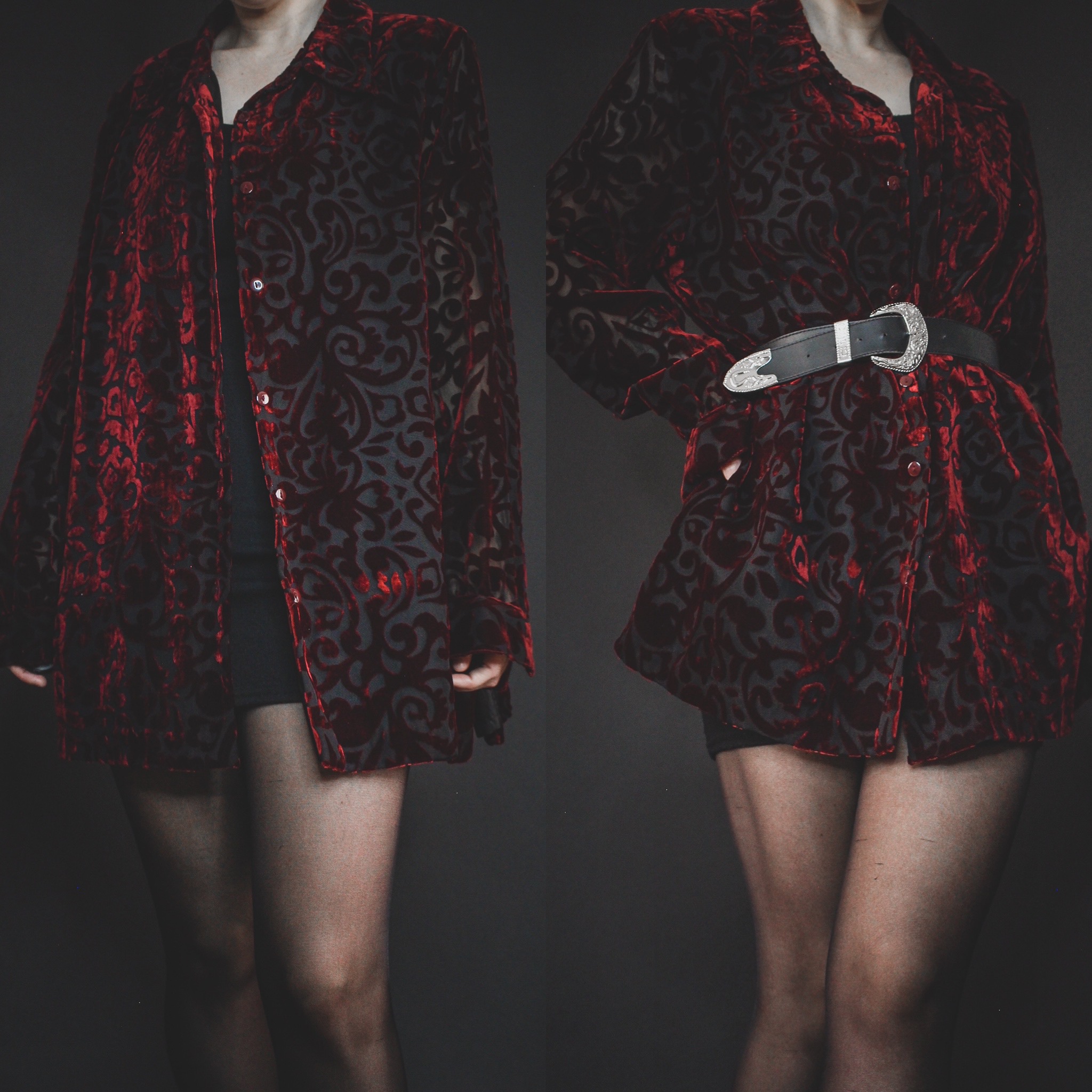 Vintage 90s signature button down. Sheer black burnout fabric with a 3D deep wine red velvet floral pattern all over. Fully lined in black poly satin. Lightweight and flowy, easy to dress up or down. Buttons down the front and at the cuffs. Classic collar, boxy cut. No stretch. Pair with jeans, faux leather pants or leggings, just about any skirt or dress. Can be knotted up at the waist, tucked in to anything high waisted, or as a throwover piece as a substitute for a jacket or cardigan. If you are very petite you may be able to wear it as a shirt dress! Liner and belt are not included.
