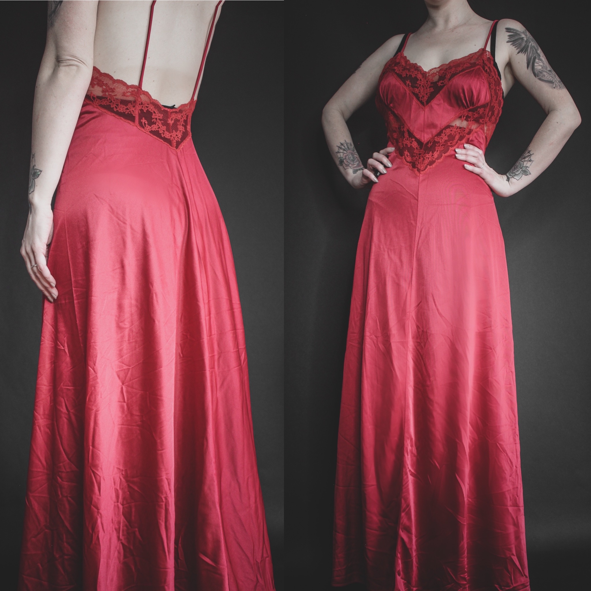 Vintage 80s satin and lace dressing gown. I am obsessed with his one. This is a Last Rites signature piece! Gorgeous, rich satin in a bright raspberry red (leans a bit more pink/burgundy rather than true red). A line shape flares out slightly through the hem. No defined waist or bust area, so she'll fit a variety of body types! Sheer lace cutout detailing at the bust. Has a bit of stretch all over. Pull-on style, unlined. Straps are non-adjustable but long enough to be shortened to your liking. She is technically a dressing gown (perfect for winter evenings by the fireside) but I personally would pair with a slip and wear it out!