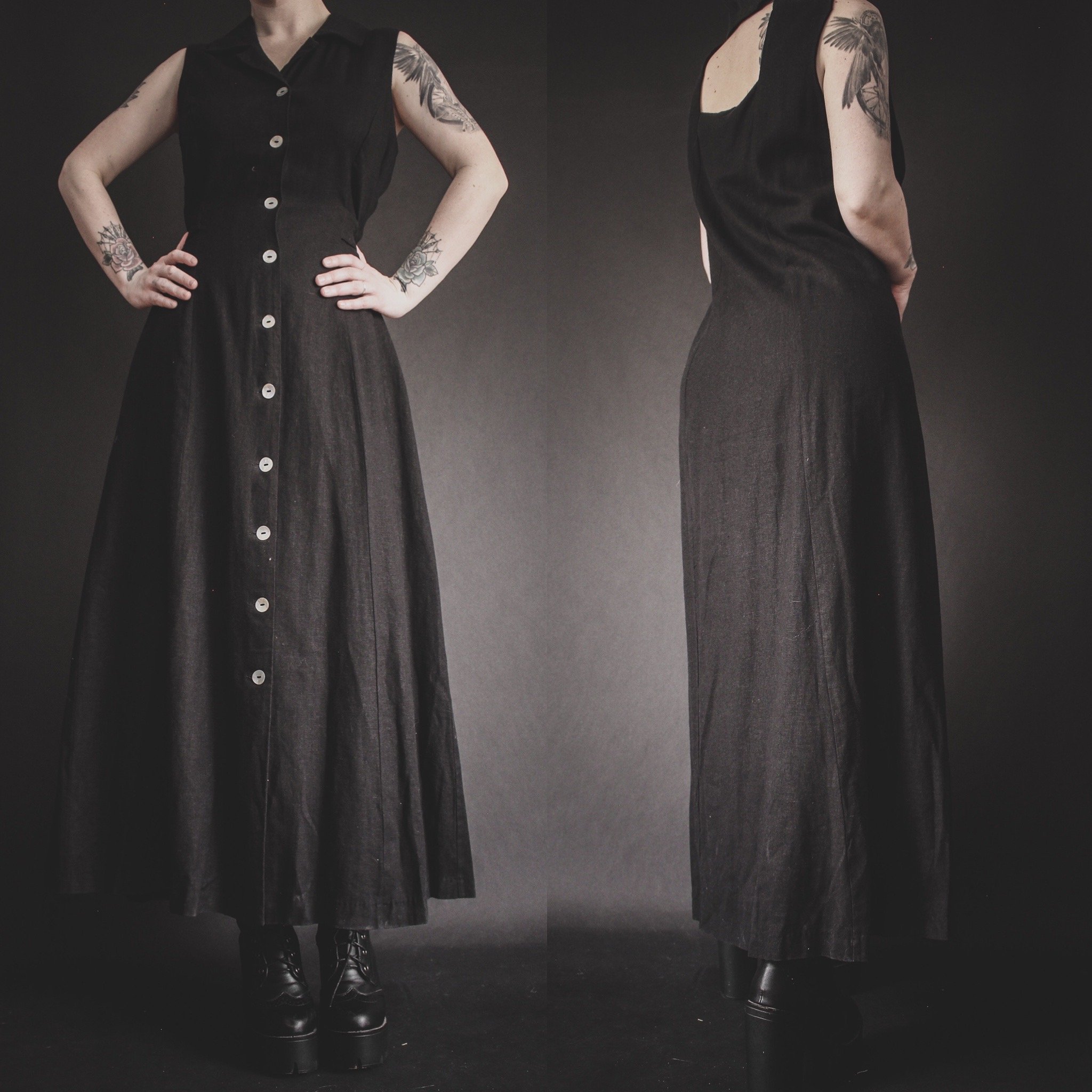 Vintage 90s button-down halter dress. This is a rare find and so fun to dress up or down! Functional mother-of-pearl buttons all down the front with tab detailing at the waist. Sleeveless cut with a collared neckline and back cutout that gives it a halter effect.