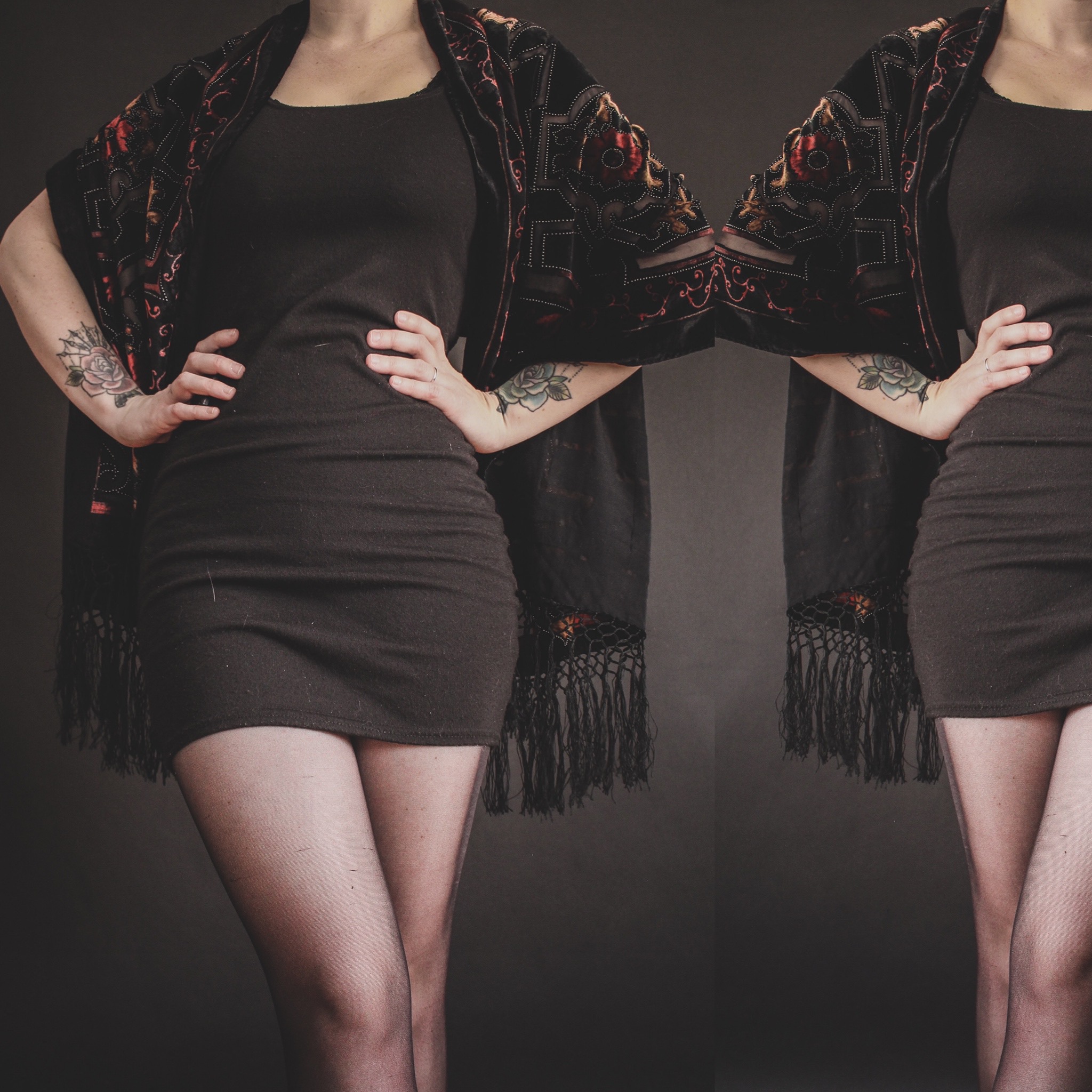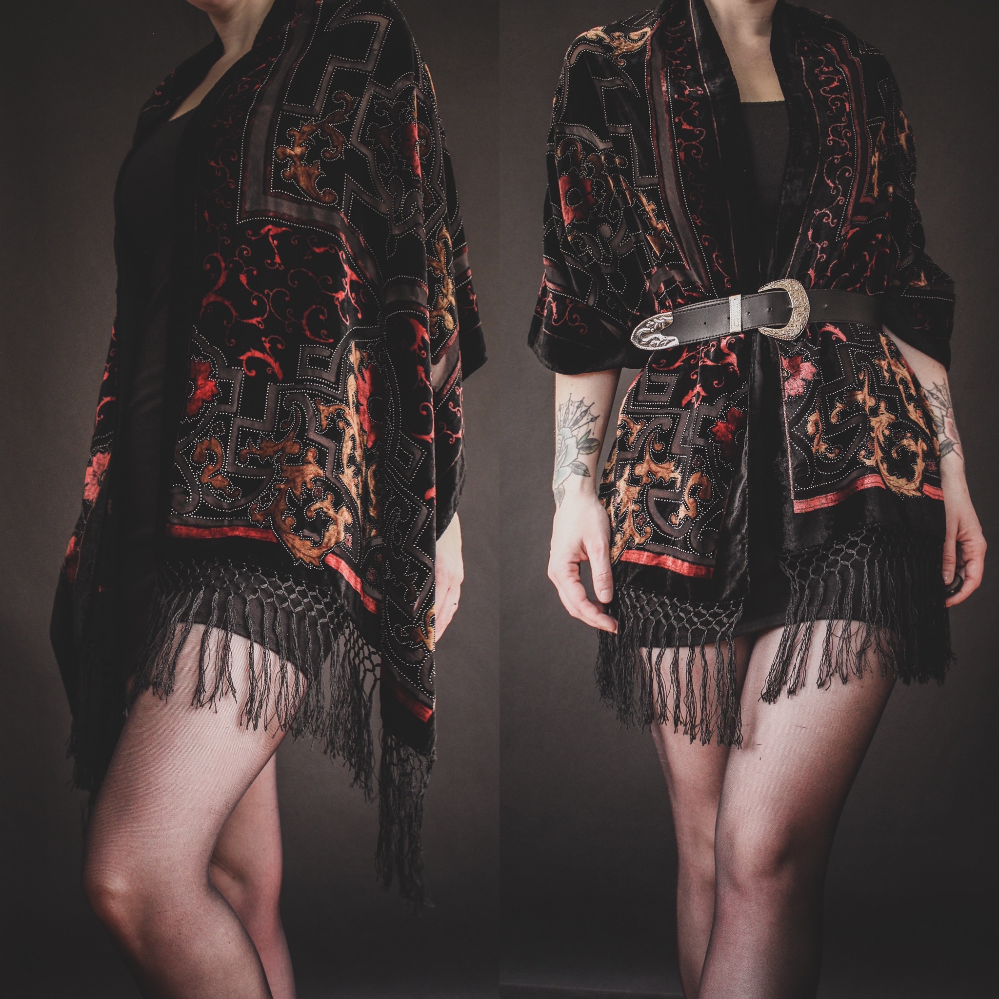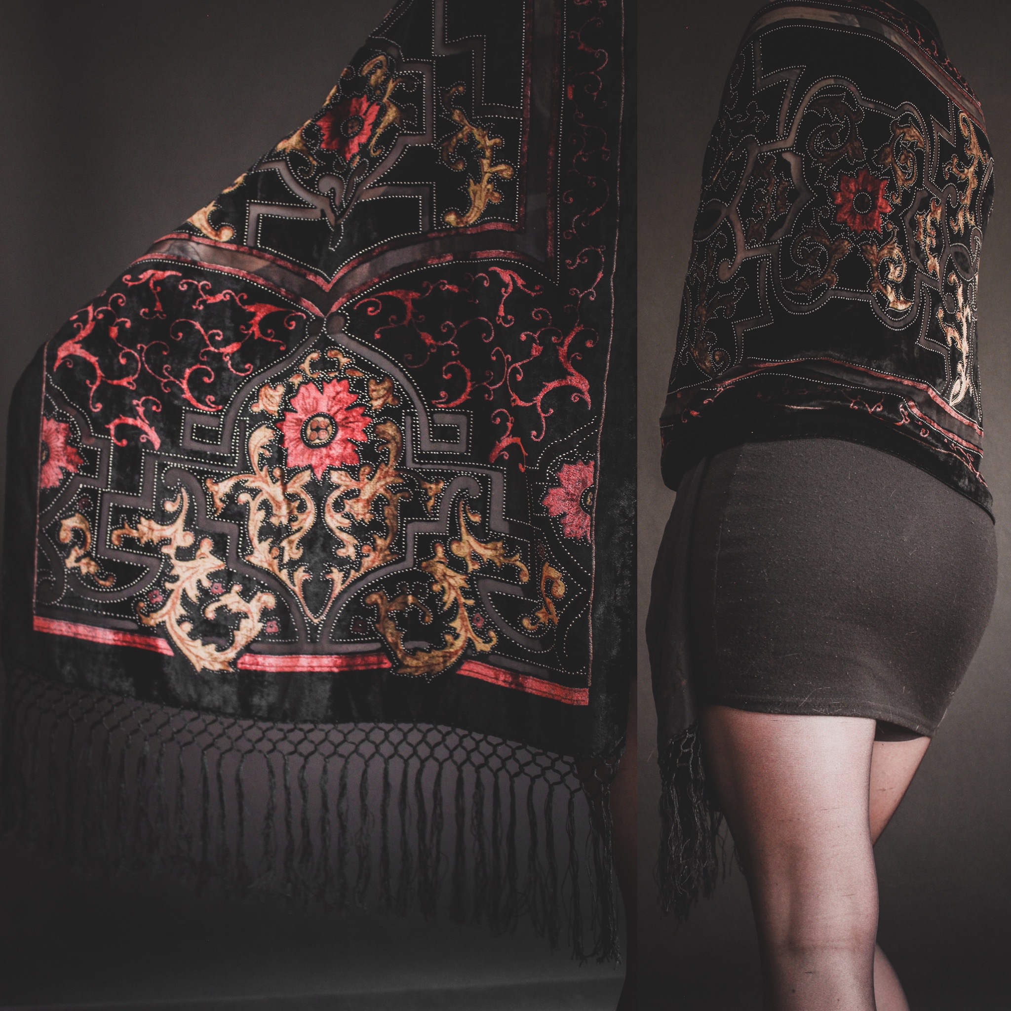 Vintage 80s velvet burnout shawl. All Last Rites signature velvet shawls are one of a kind with unique colors and patterns! This one is an extra-luxe version inspired by fire magick! It has sheer black backing with a gorgeous velvet floral pattern and swirled detailing in shades of bright blood red and orange-y gold. Black velvet trim and luxe fringe on both ends. Rectangular, measures 62" by 22". This is a perfect throwover piece for chilly nights and can be layered for all seasons as a scarf or substitute for a jacket or cardigan, draped over your shoulders, or even as a wrap skirt or swim cover up! You can even belt it and wear it as a top as shown. Or style it as home decor or an altar covering. Stevie Nicks would be proud. One size fits most.