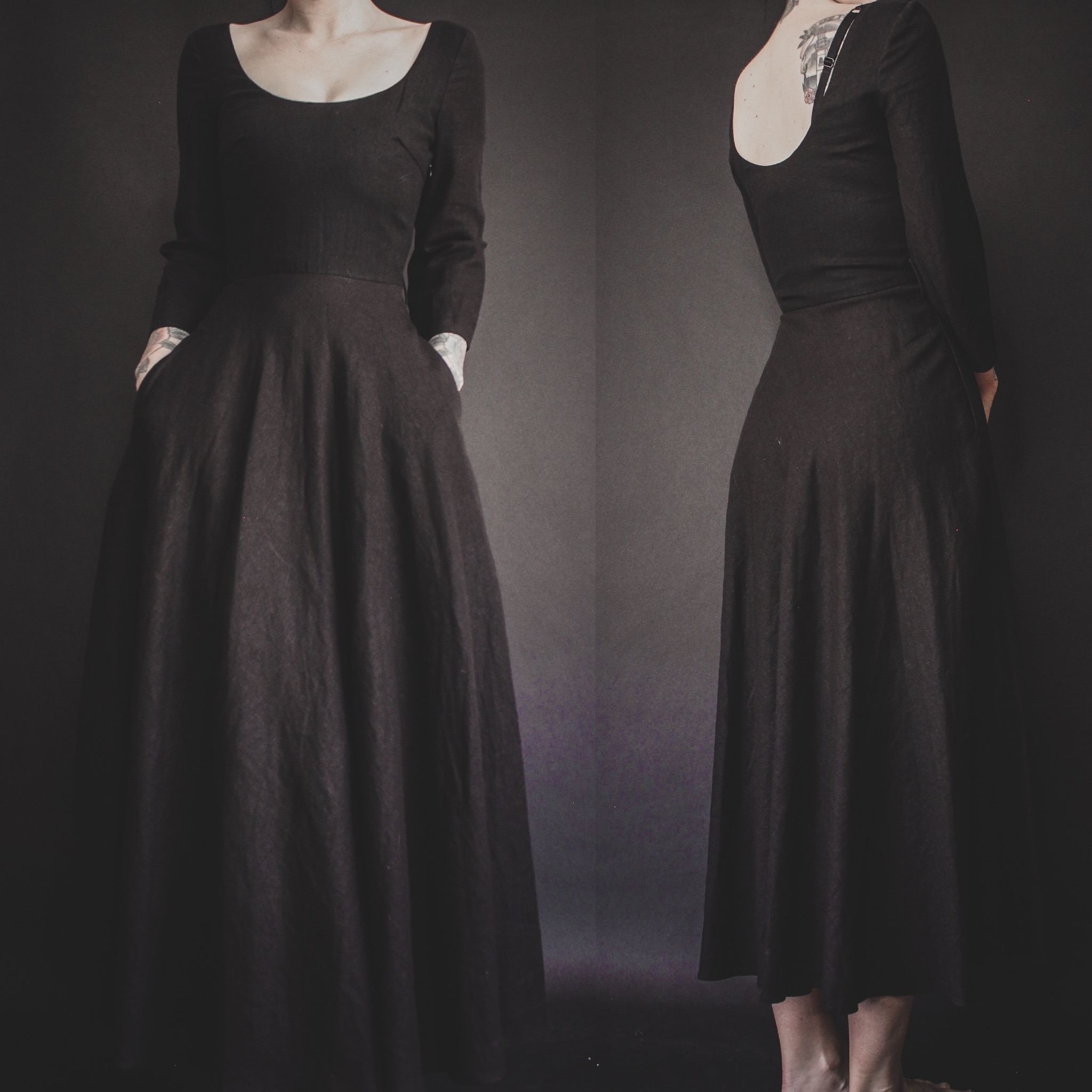 Vintage 90s classic black witchy dress. She has POCKETS! Full skirt, empire waist with belt loops, fitted 3/4 sleeves and a wide scoop neck and back. Hidden side zipper. No stretch, midweight material, feels like a linen-based blend or possibly 100% linen.