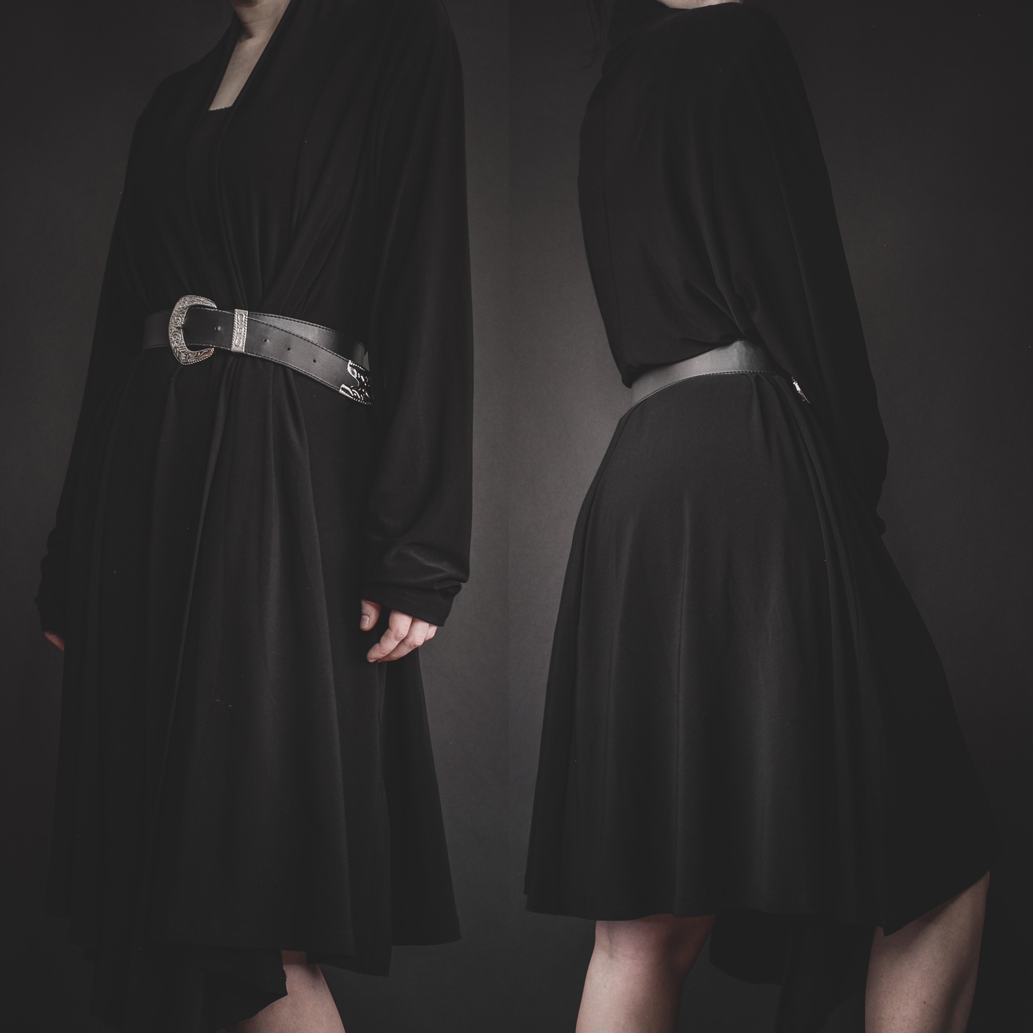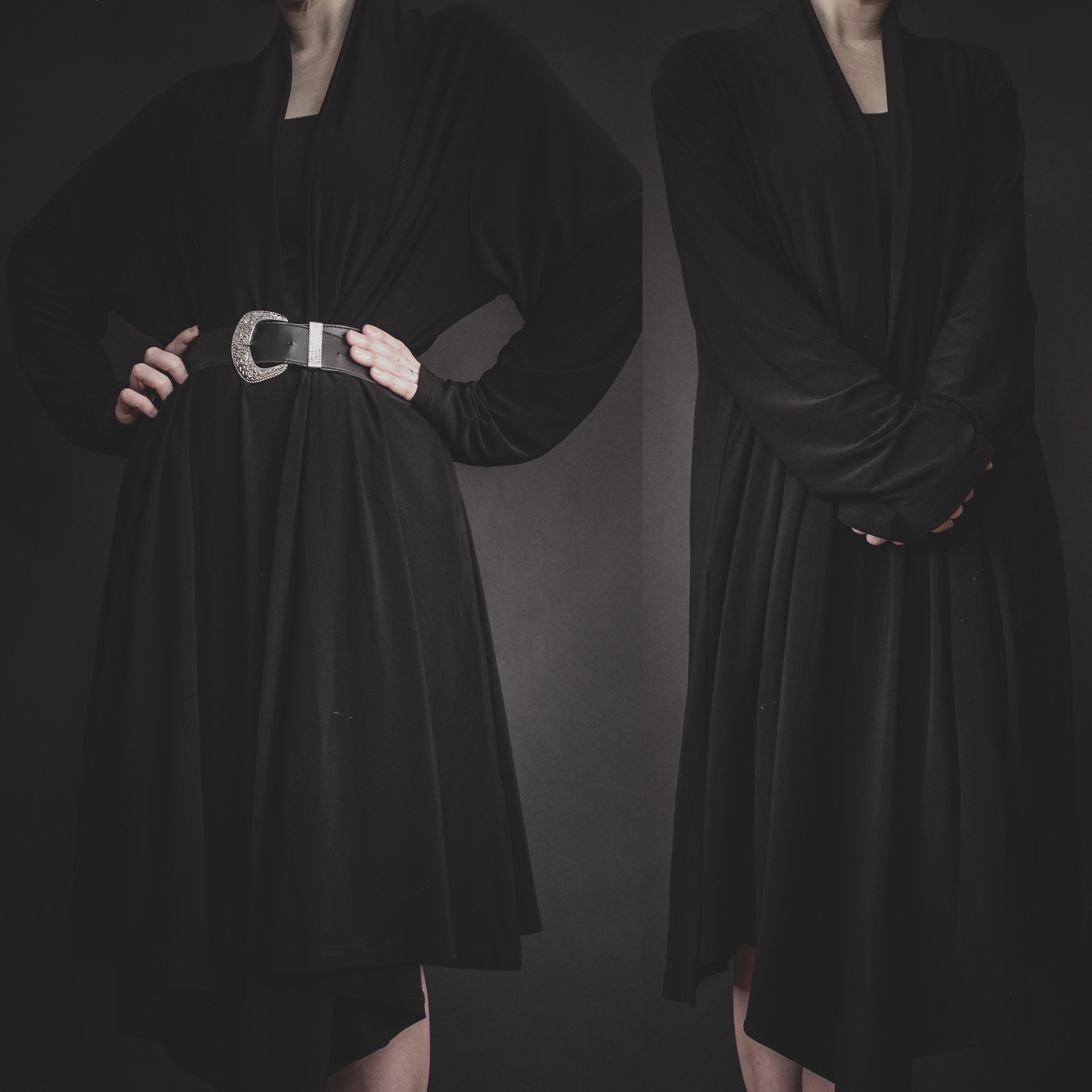 Early 00s draped asymmetrical cardigan. Open front, waterfall style with loose sleeves. Soft, slinky poly spandex blend fabric. Belt is not included. No itch factor. Wear it loose and flowy or cinch the waist and wear it as a wrap dress!