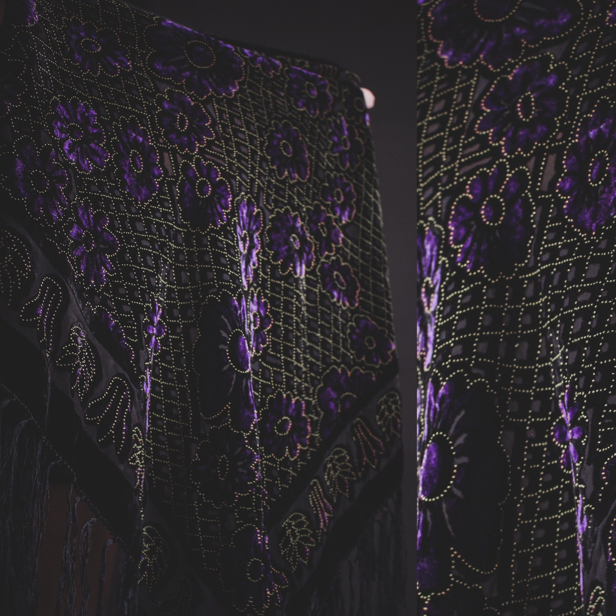 Vintage 80s velvet burnout shawl. All Last Rites signature velvet shawls are one of a kind with unique colors and patterns! This one has sheer black backing with a gorgeous bright purple velvet floral design and yellow-gold painted accents all over. Black velvet trim and luxe fringe on two ends. Triangular, measures 27" by 55", not including fringe. This is a perfect throwover piece for chilly nights and can be layered for all seasons as a scarf or substitute for a jacket or cardigan, draped over your shoulders, or even as a wrap skirt or swim cover up! You can even belt it and wear it as a top as shown. Or style it as home decor or an altar covering. Stevie Nicks would be proud. One size fits most. This is a smaller shawl than the ones I usually list so I have her listed at a discounted price!