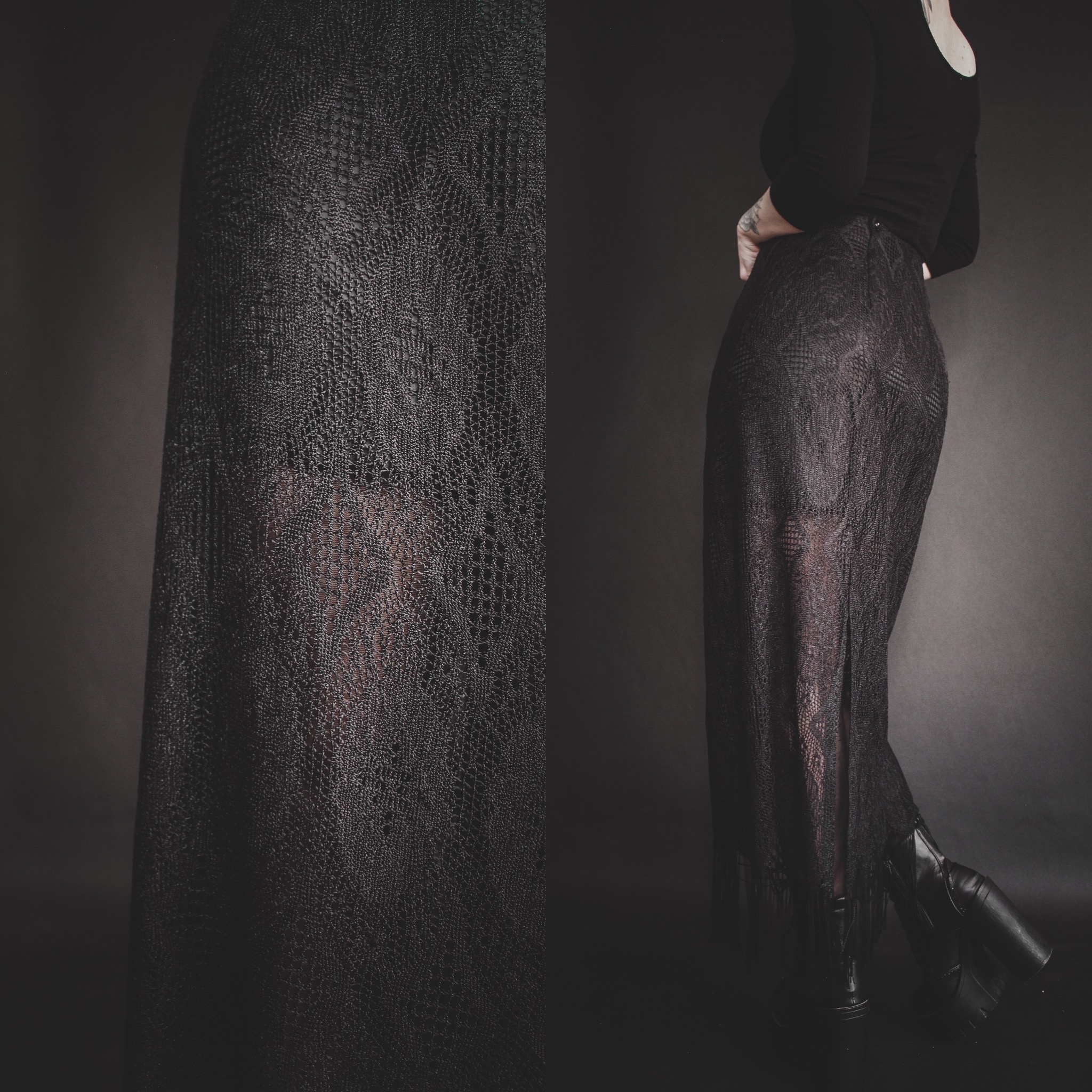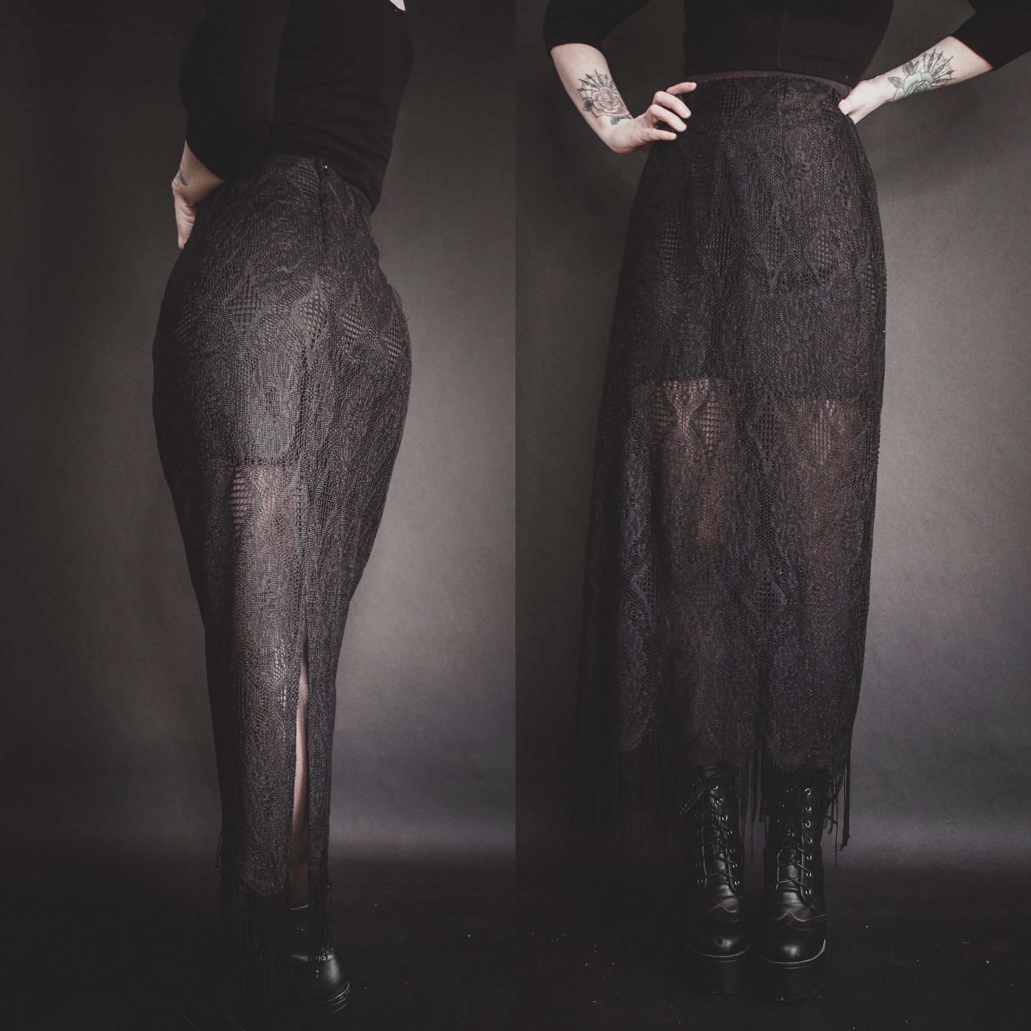 Vintage 90s black lace shawl skirt. This is a very unique find! Delicate black lace with fringe at the hem. Will hit between knee and ankle on most people (I am 5'2" for reference). Back zip, no stretch whatsoever, meant to be worn high waisted. Fully lined in black poly satin. Nice high back slit for comfort and movement.