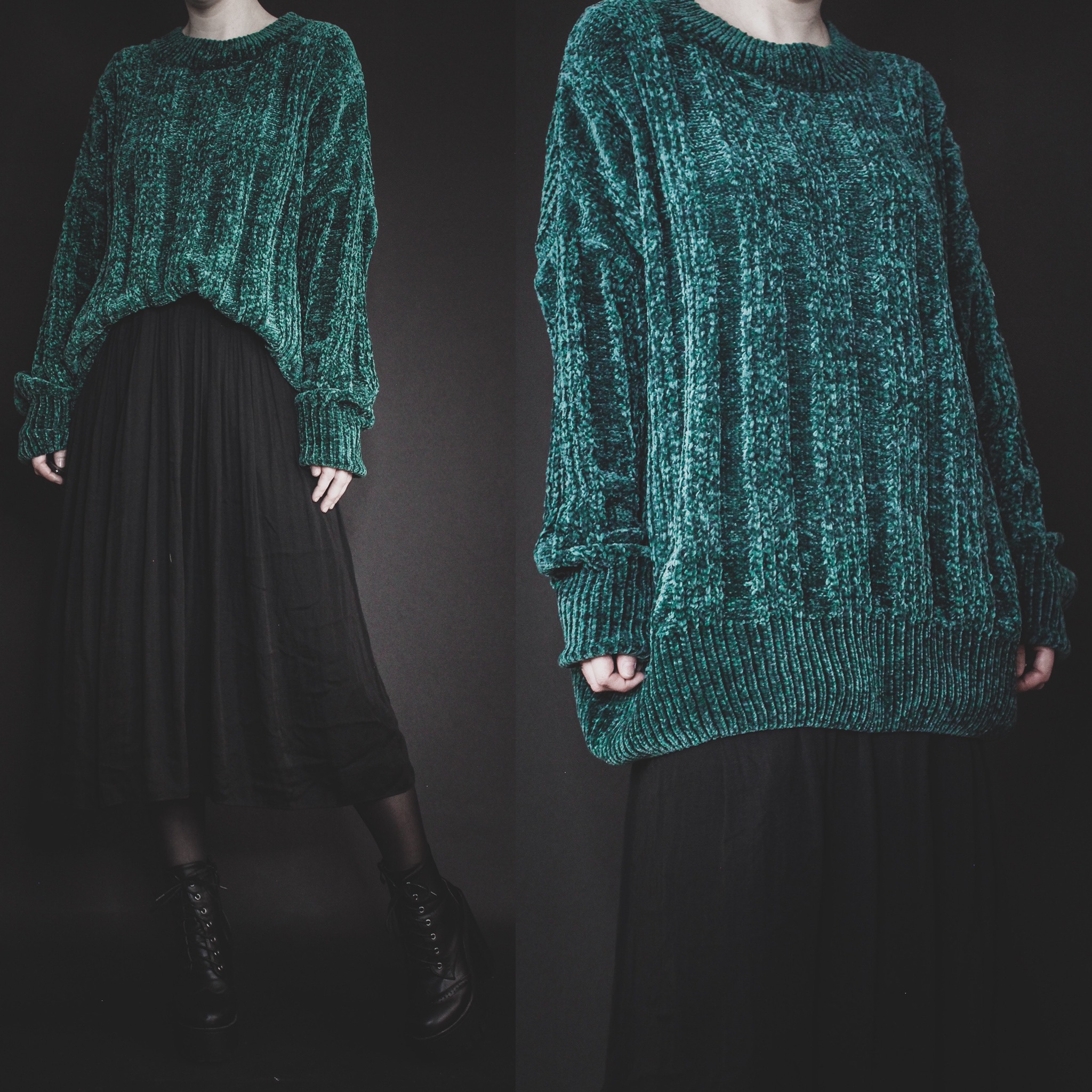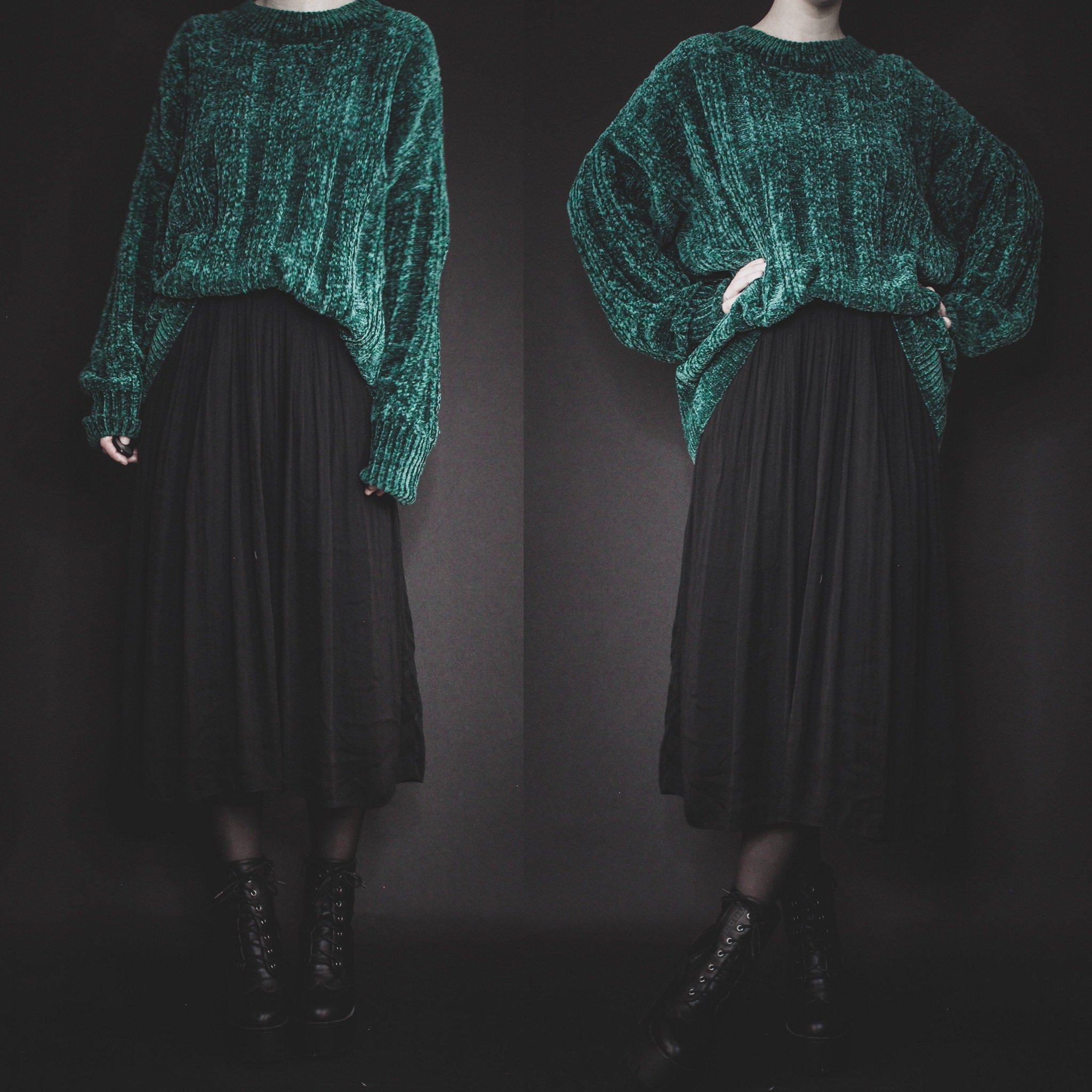 Vintage 90s signature slouchy sweater. Cozy art teacher vibes! All Last Rites signature sweaters are one-of-a-kind unisex vintage finds straight out of the 80s and 90s, with unique collars and patterns! This one is an ultra-soft mid-weight chenille cable knit in a bright jade green - and a mock neck. It may look more blue on some of your screens but it is definitely a cool-toned almost-teal green!!
