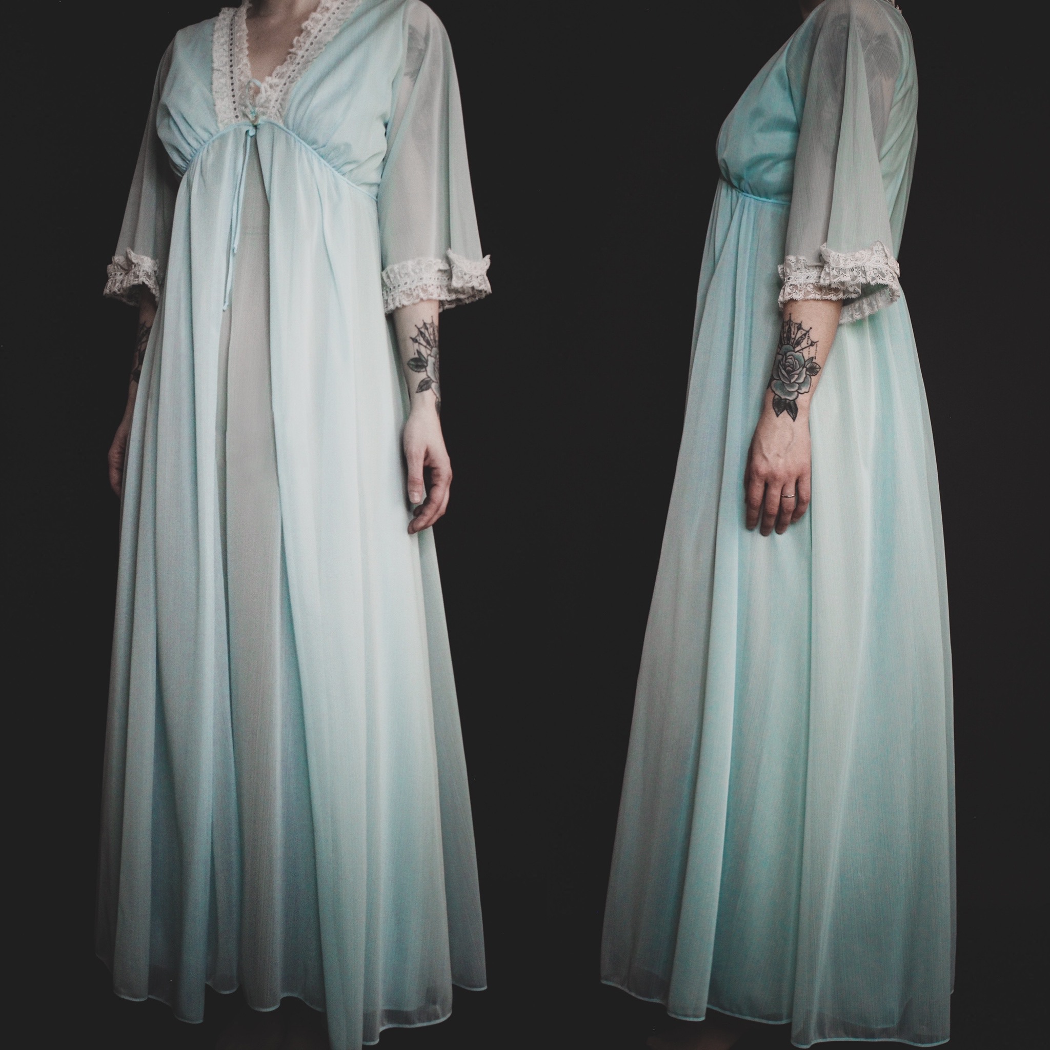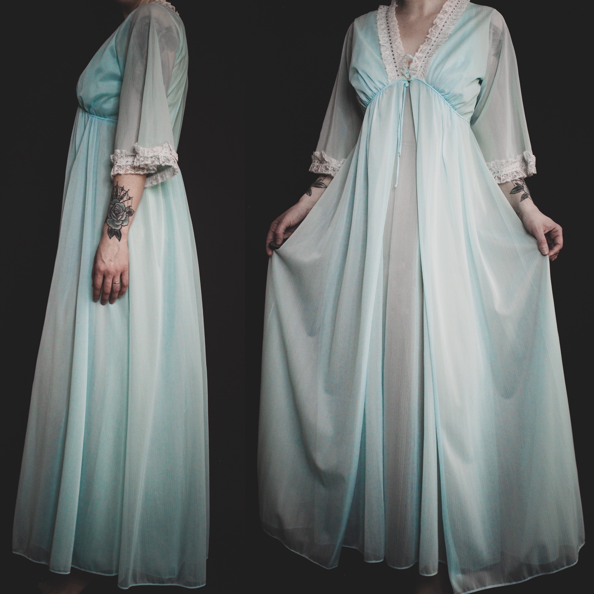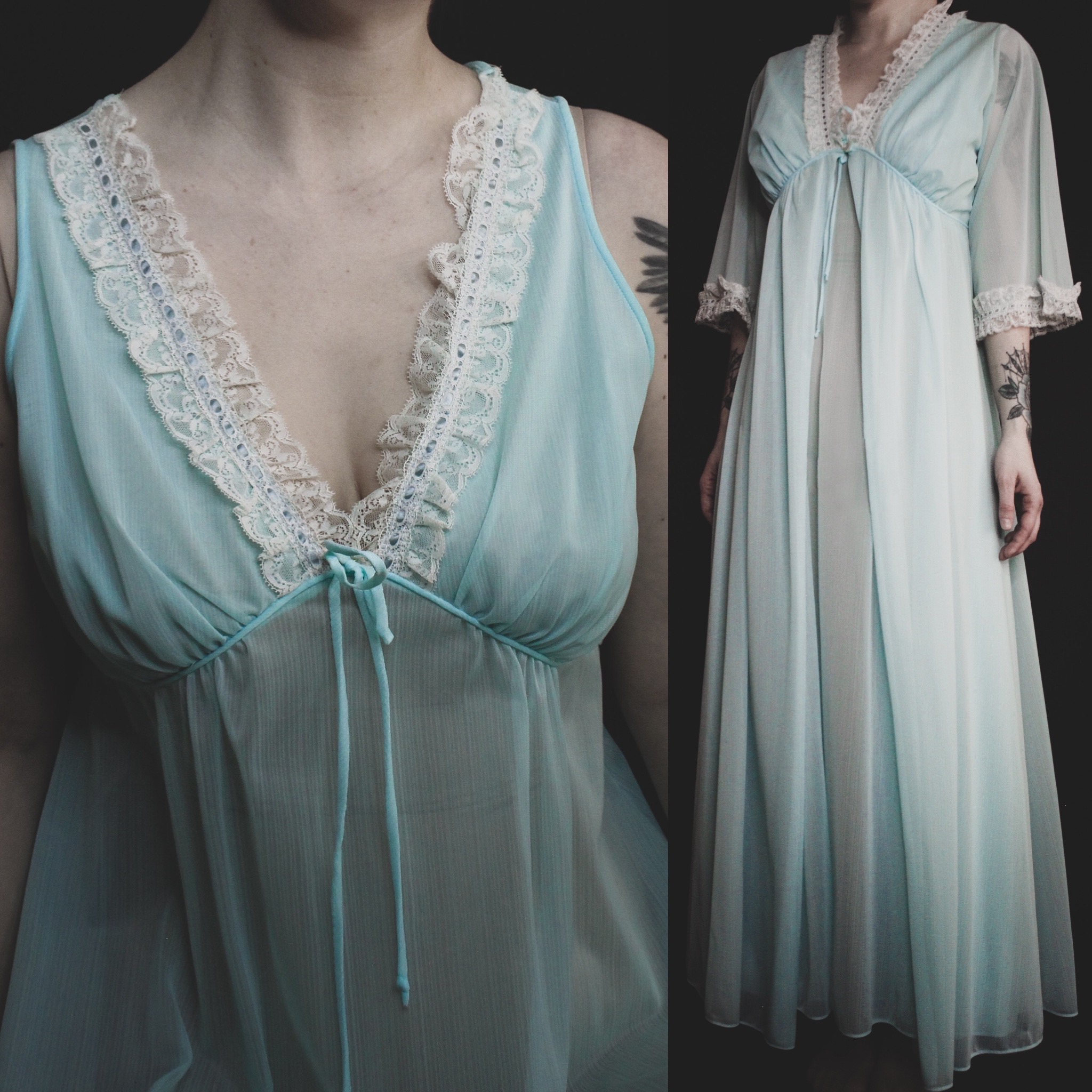 The color is a true robin's egg blue. Both pieces are sheer chiffon with intricate ivory lace detailing. Both the nightgown and robe have an flattering empire waist, super comfortable for lounging around. Both pieces are unlined, lightweight, breezy and breathable.