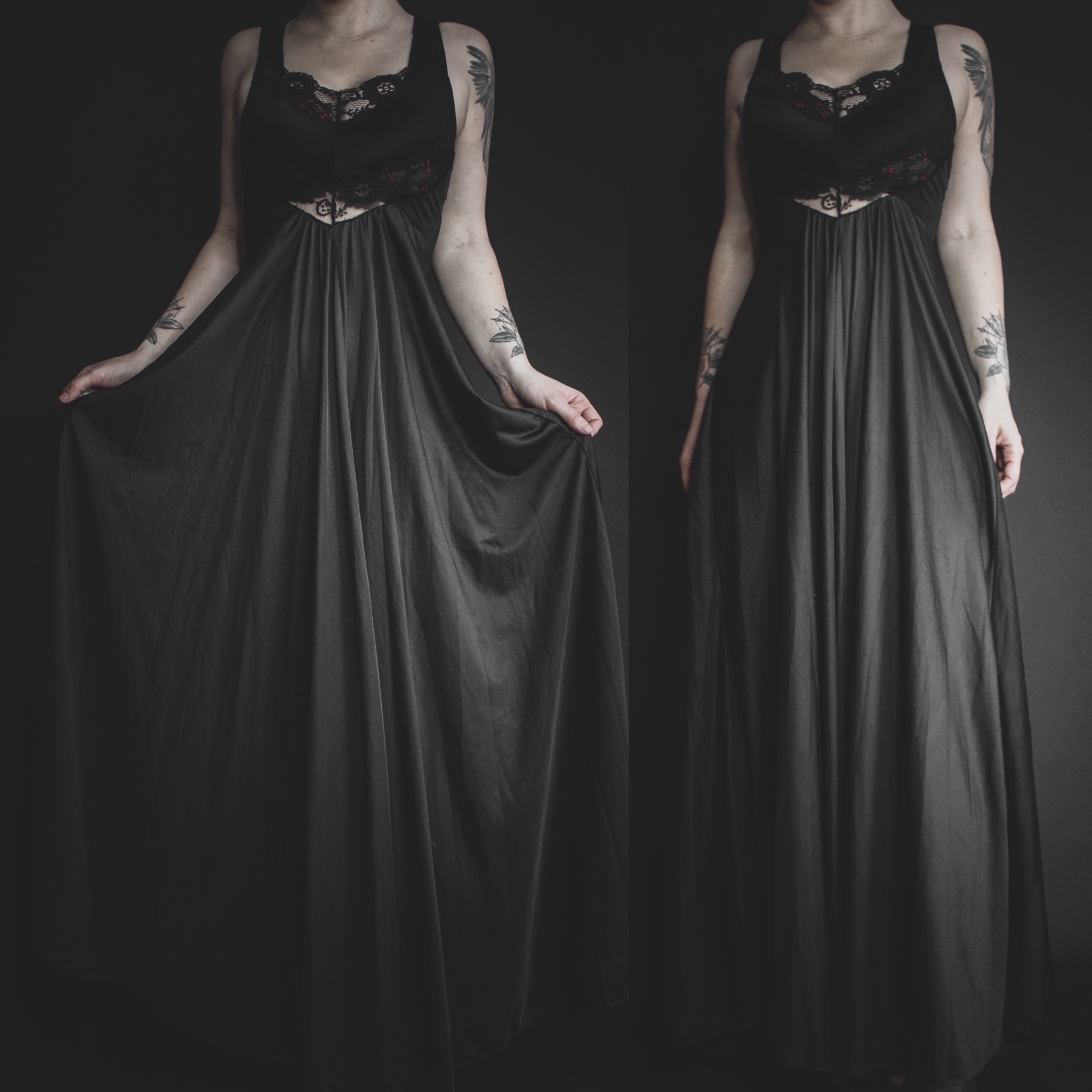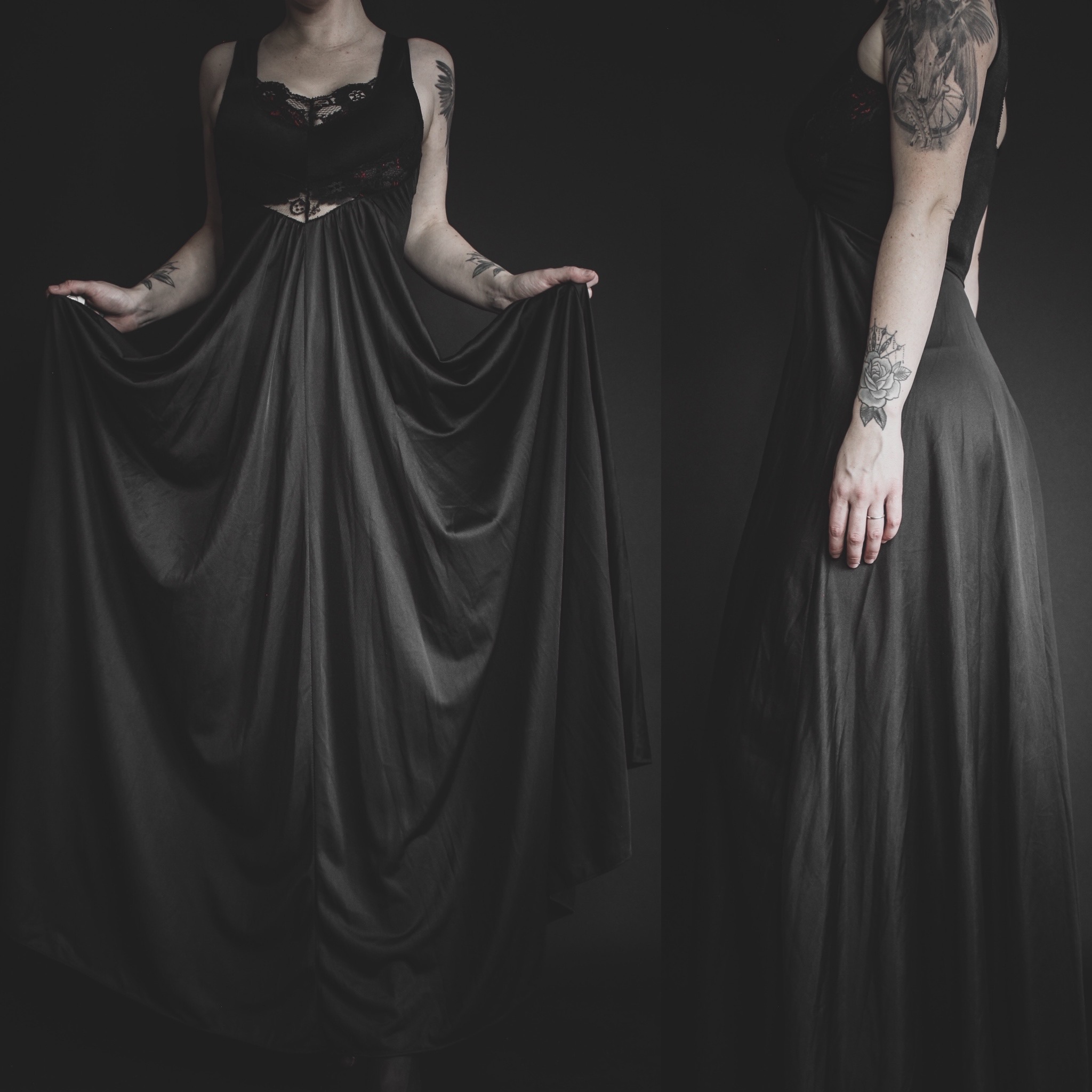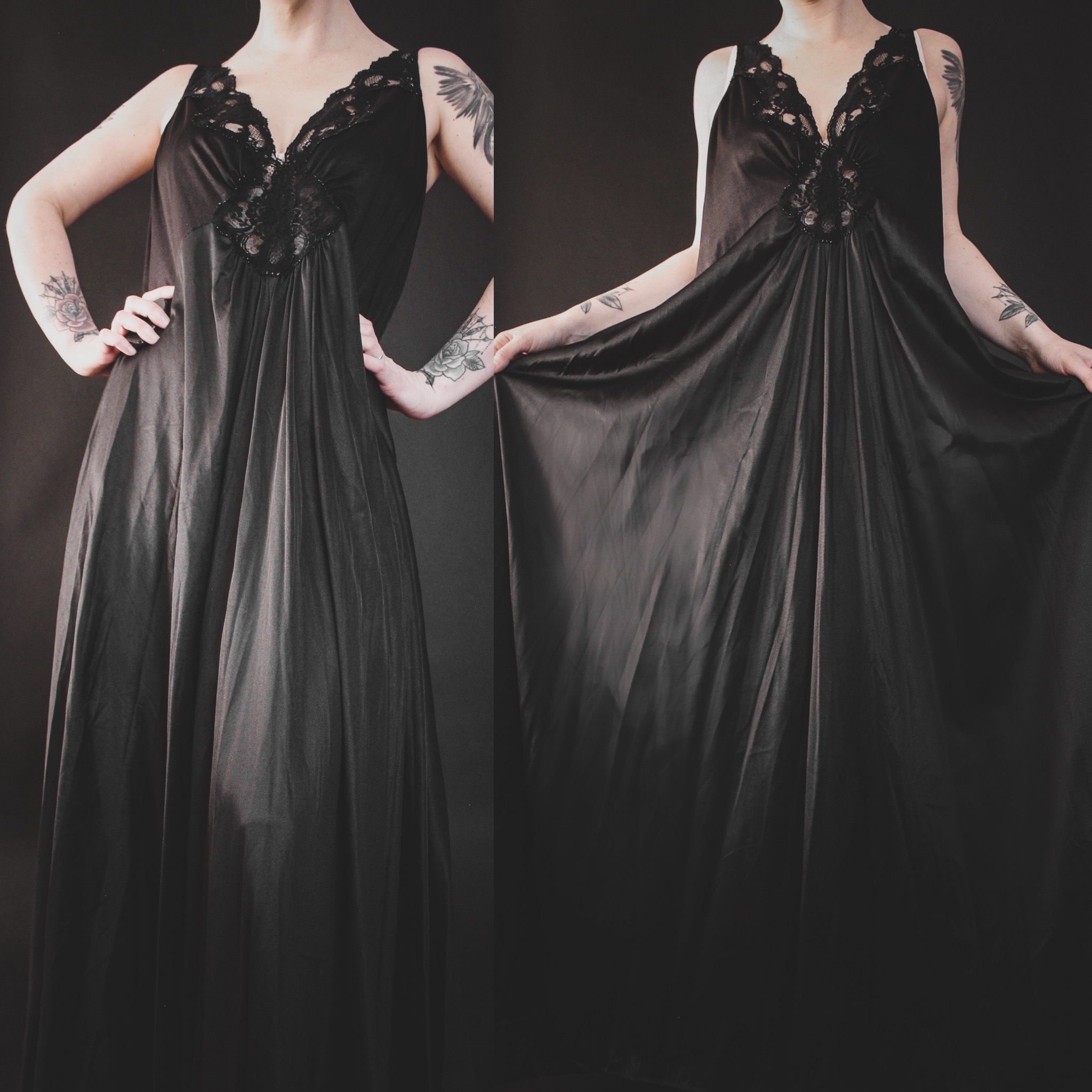 Vintage 80s black satin dressing gown. This is a Last Rites signature piece! Super full, flowy circle skirt flows beautifully when you walk. Empire waist. Sheer lace cutout detailing at the shoulders and bust. V-neck, scoop back. Has a bit of stretch all over. Pull-on style. Unlined.