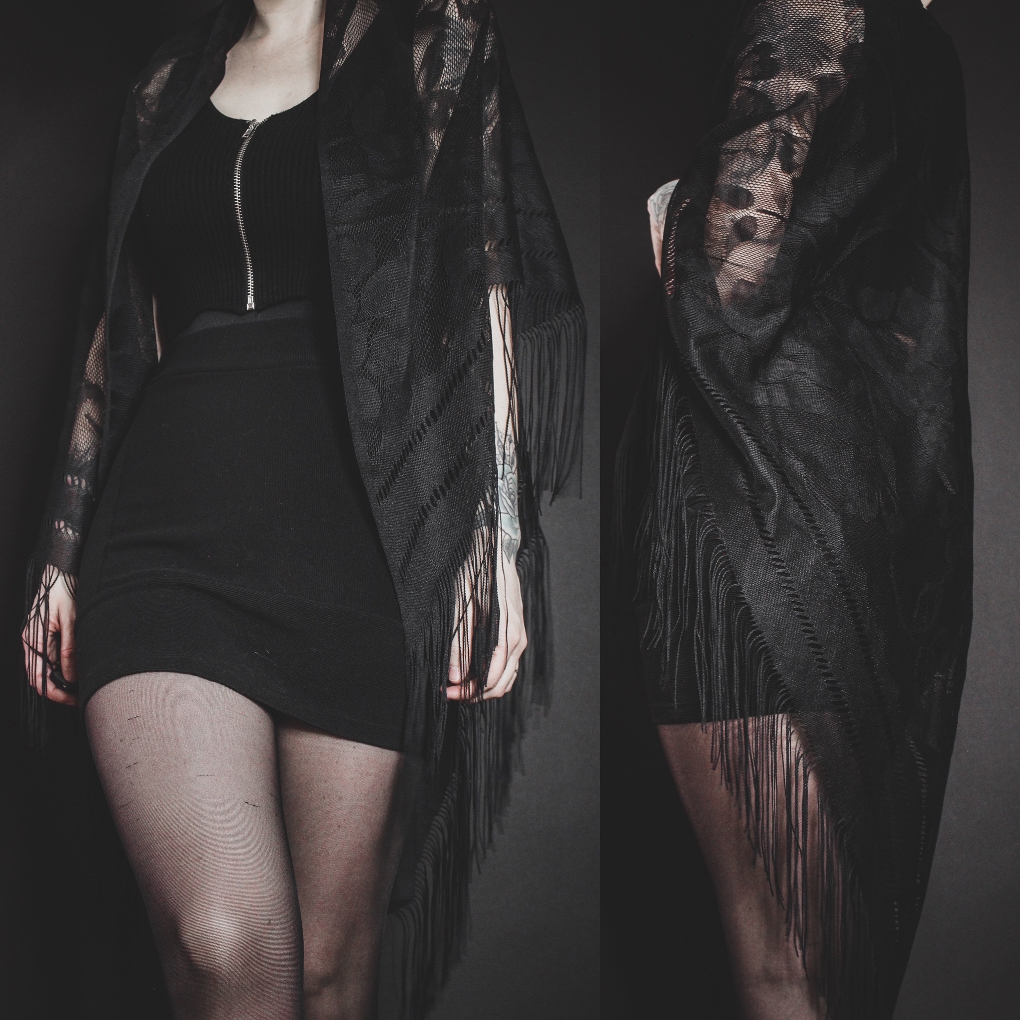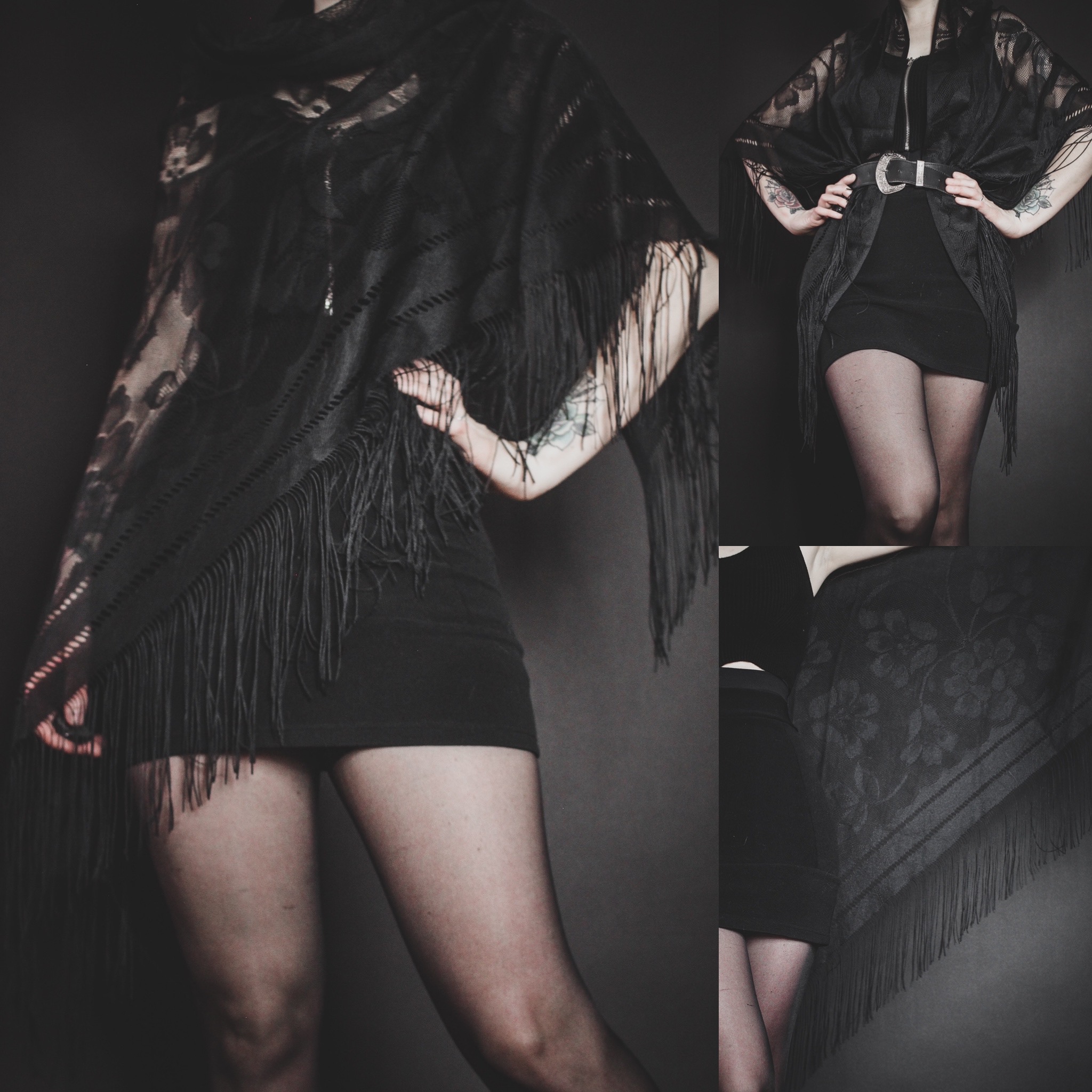 intage 70s black lace fringed shawl. This is a Last Rites signature piece in an oversized style for extra drama. All Last Rites signature shawls are one of a kind with unique colors, patterns and lace! No two are alike! This one is triangular in a beautiful black mesh lace featuring a bohemian floral motif and long delicate fringe. Can be worn over the shoulders in place of a cardigan or jacket, or as a classic scarf, or belted and worn as a top, or tied as a wrap skirt! It even works as a swim coverup, home decor, or altar covering - the options are endless! Perfect throwover piece, especially for transitional weather. Works for all seasons and can be dressed up or down. The perfect staple piece for all your witchy looks. Stevie Nicks would be proud.