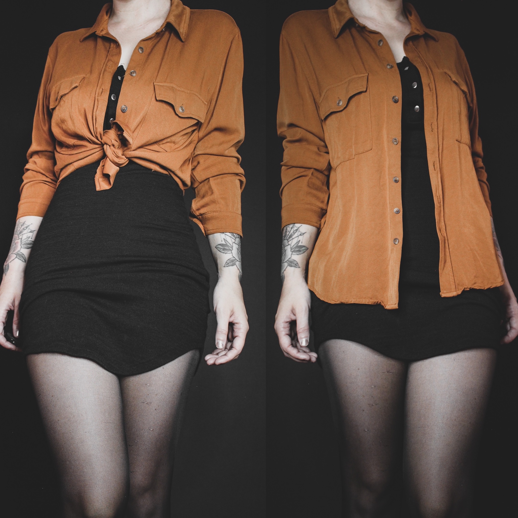 Vintage 90s mustard-orange blouse. Not quite cropped but not quite standard length. Super cute tucked into high waisted bottoms or knotted at the waist. Super soft, flowy, lightweight and perfect for warm weather. Functional buttons down the front and functional breast pockets. Boxy cut, no stretch but the fabric does have a bit of give.