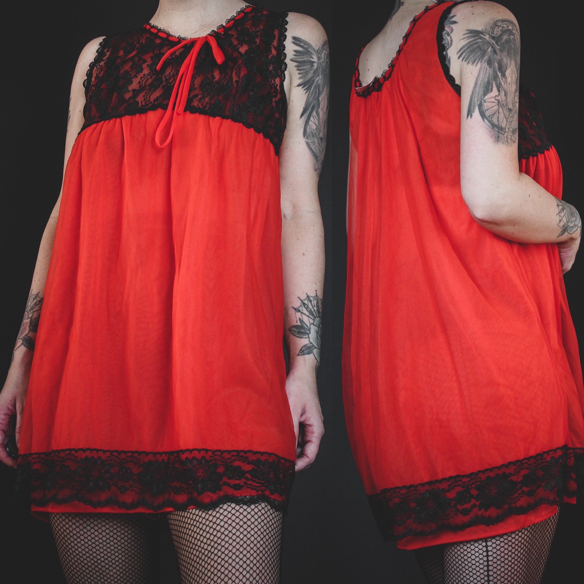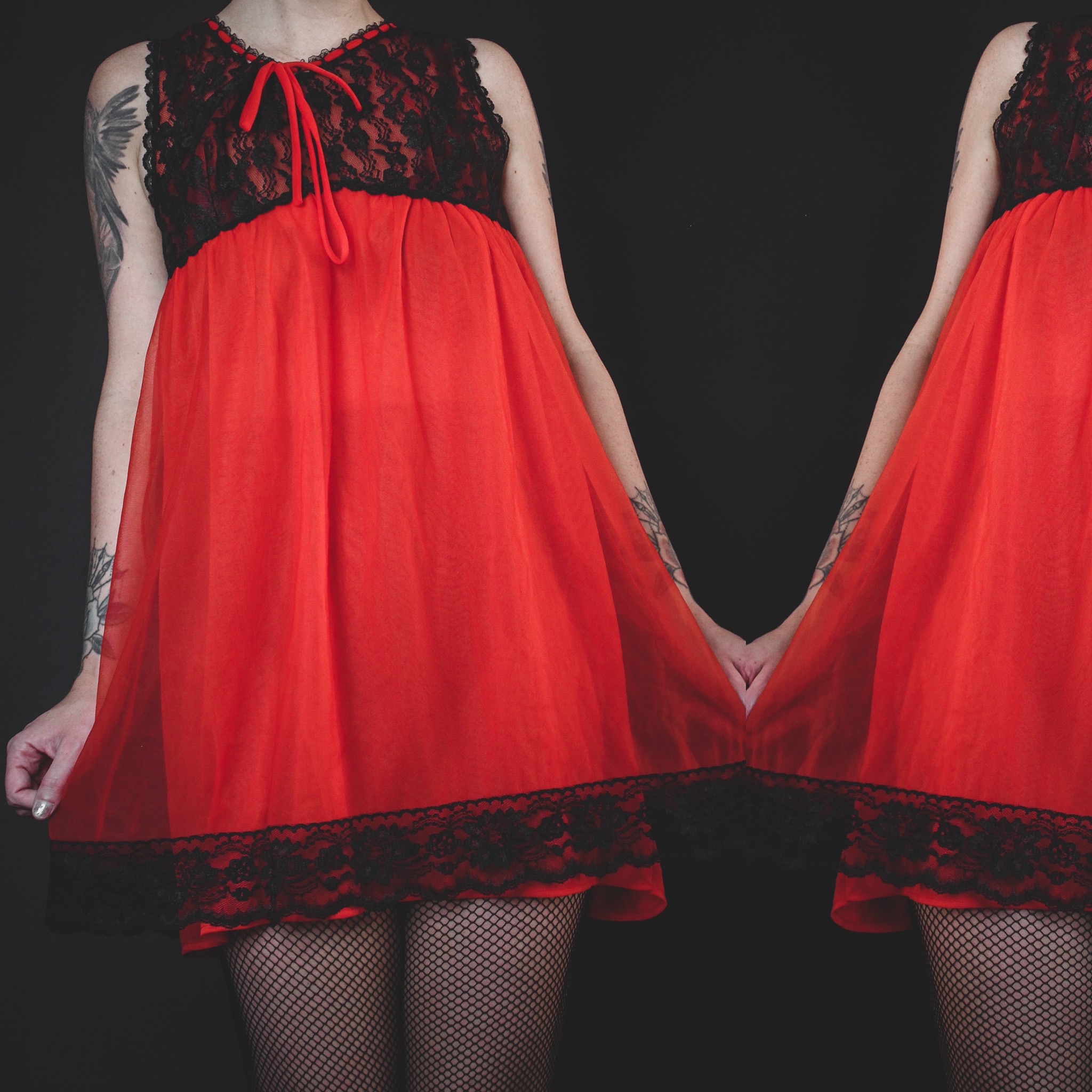 Vintage 60s red chiffon babydoll nightie. Sleeveless super-short nightgown with black trim at the bust and hem. Semi-adjustable ribbon woven around the neckline. Pull-on style. No stretch whatsoever. Flowy fit, flares out slightly from the shoulders down - true babydoll cut. Fully lined in a separate layer of red poly satin, chiffon overlay is sheer.