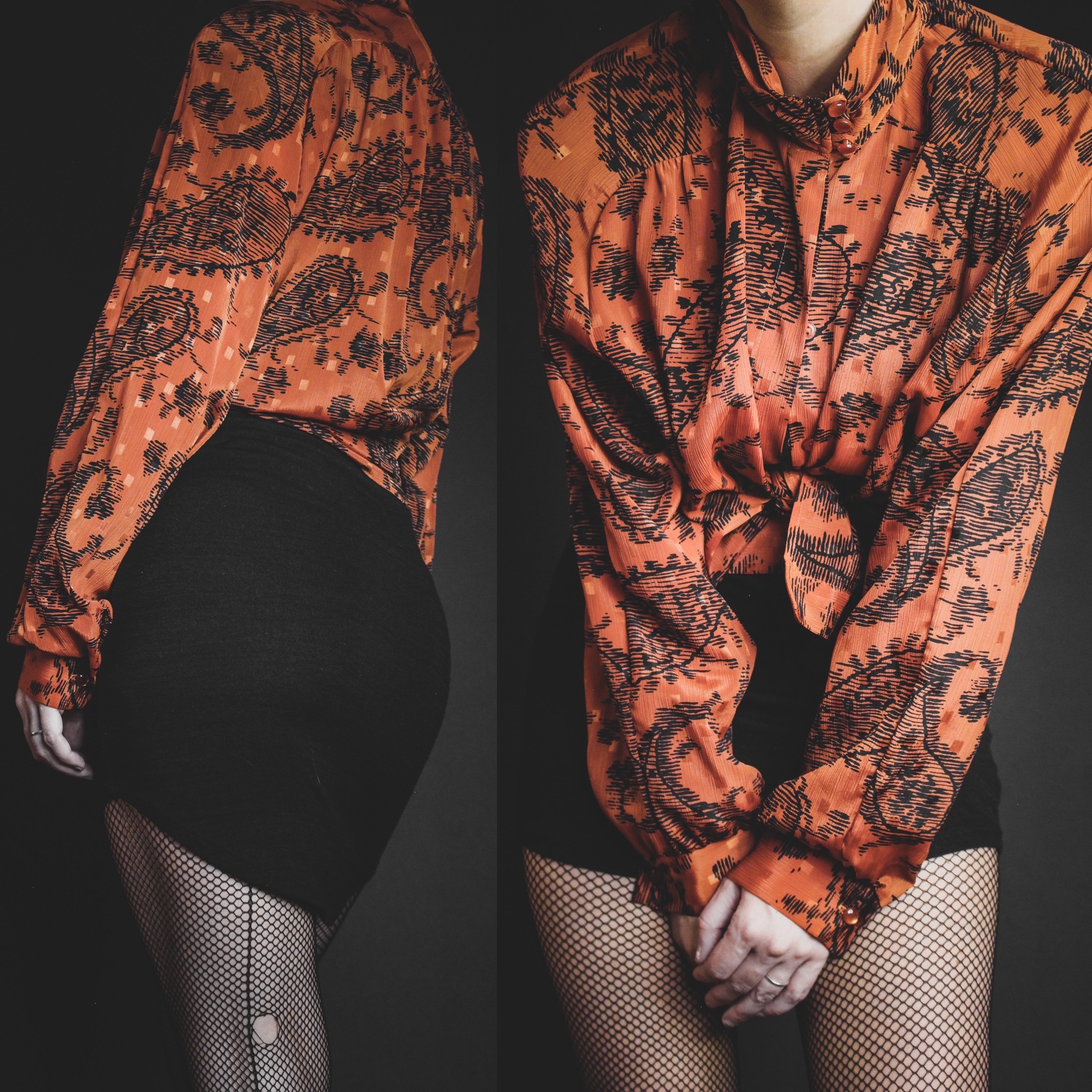 Vintage 90s pumpkin orange blouse with shiny detail and a black paisley print. Lightweight, breezy crepe-chiffon fabric. Unlined, no stretch. Shoulder pads are intact but can be easily removed without damaging the top. High collar, no lapels. Buttons at the cuffs, down the front and 3 buttons with loop closure at the neckline. Boxy cut and standard length, not cropped but not longline. Looks super cute knotted at the waist or tucked into high waisted bottoms. Can be dressed up or down.