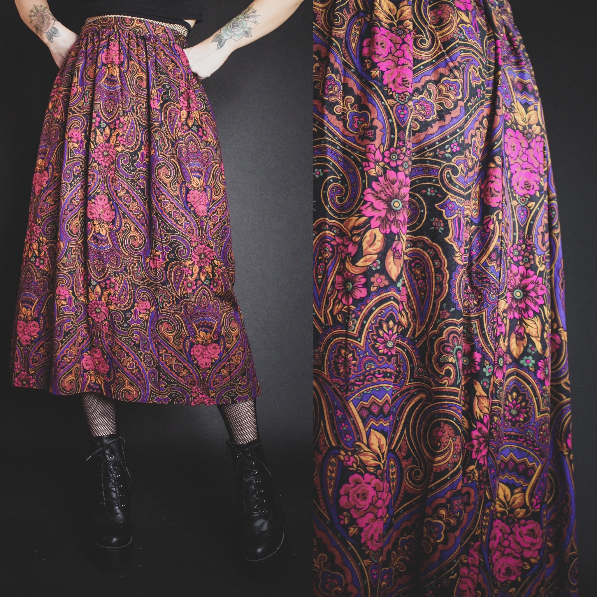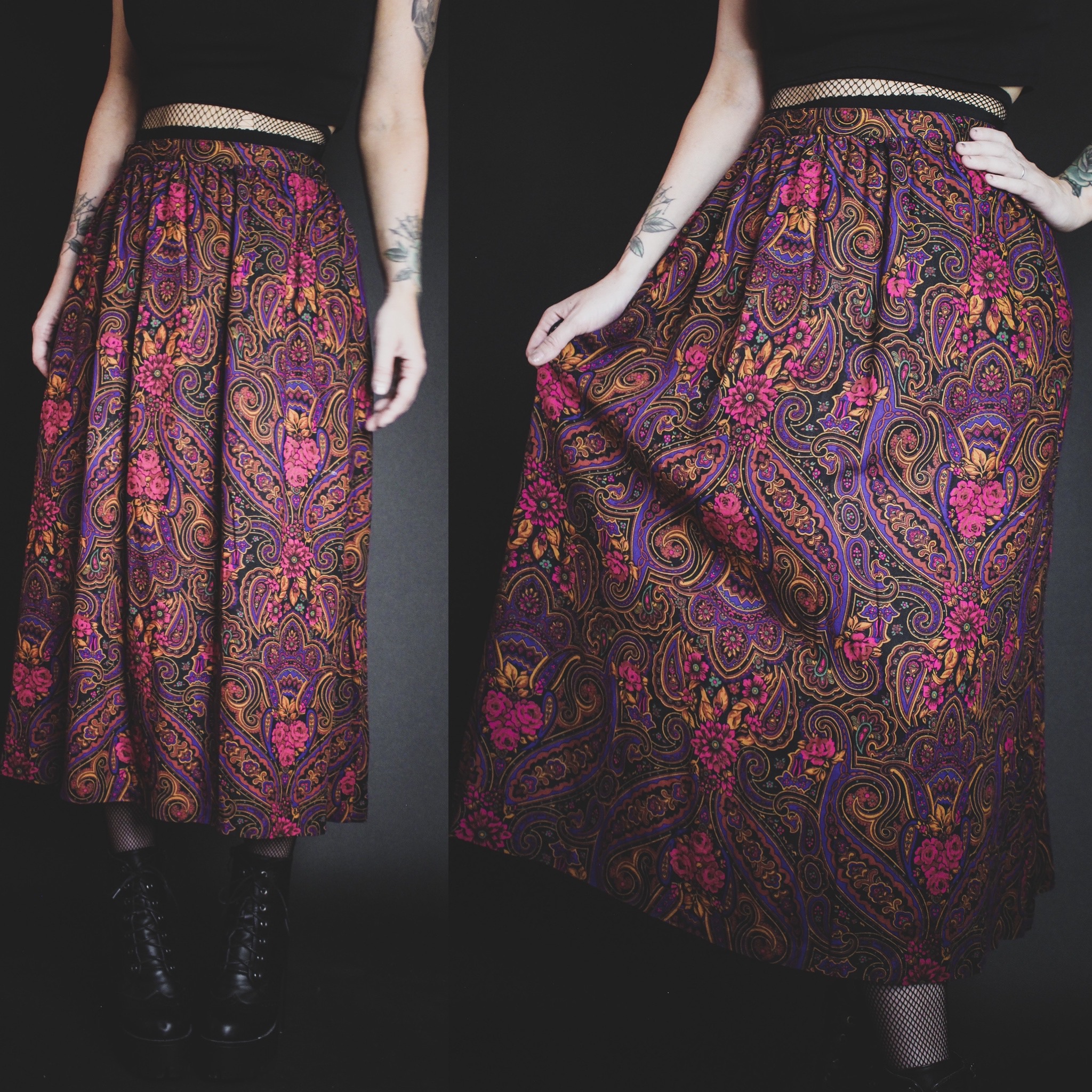 Vintage 90s colorful paisley midi skirt. Gorgeous unique print in shades of purple, pumpkin orange, gold green, fuschia and black. Double-button closure at the side of the waist, waistband is ruched and slightly elasticized in the back. A-line cut, midi length will hit between the knee and ankle on most people. Can be worn high or mid-waisted depending on your measurements. Super soft and breathable, no fabric tag but feels like a cotton-rayon blend. Unlined. I am 5'2" for reference. Beautifully made, very luxe feeling. Full length is 30".
