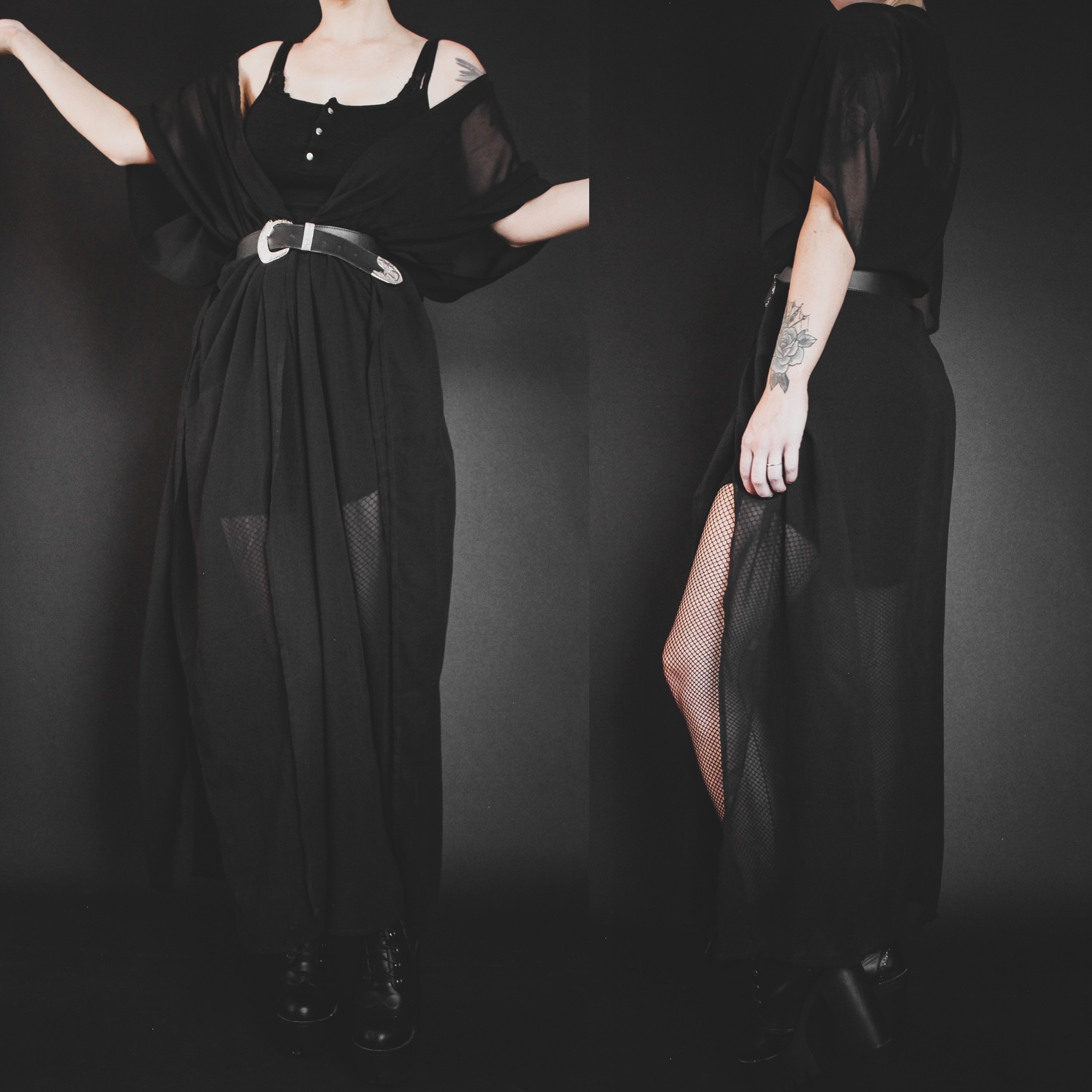 Vintage 80s black sheer batwing duster. Can be worn as robe or dressing gown, as a throwover jacket, belted and worn like a dress, the options are endless! Hidden belt loop holes near the waist so you can weave a skinny belt, ribbon or cord through and cinch the waist. Super easy to dress up for a night out or dress down for daytime. This is the ultimate witchy layering piece and works for all seasons! Also works perfectly as a swim cover up. Belt and liner not included.