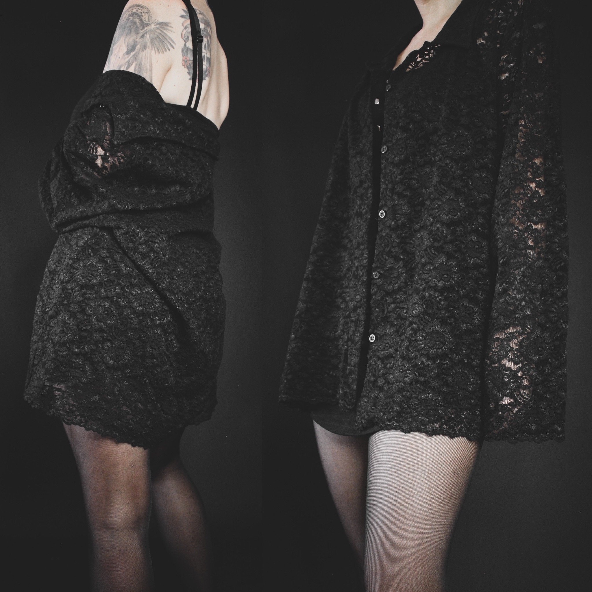 Vintage 90s black sheer lace blouse. Fran Fine who?? Soft black lace button down with scalloped trim at the hem and sleeves. Boxy cut and standard length, if you are veeery petite this may work as a short tunic dress on you! Looks super cute knotted at the waist or tucked into high waisted bottoms. Can be dressed up or down. Belt not included. Fully sheer, liner dress is not included.