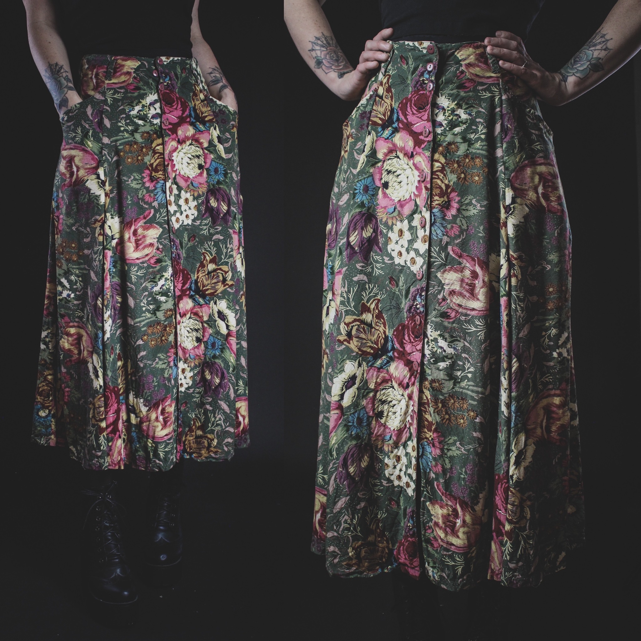 Vintage 90s floral midi skirt. She has everything you could ever want in a year-round staple skirt! Easily styled for warm weather and can be layered up with cozy tights for colder temps. Soft cotton blend, roomy pockets, functional buttons all the way down the front, and belt loops at the waist. Meant to be worn high waisted. Unlined, no stretch.