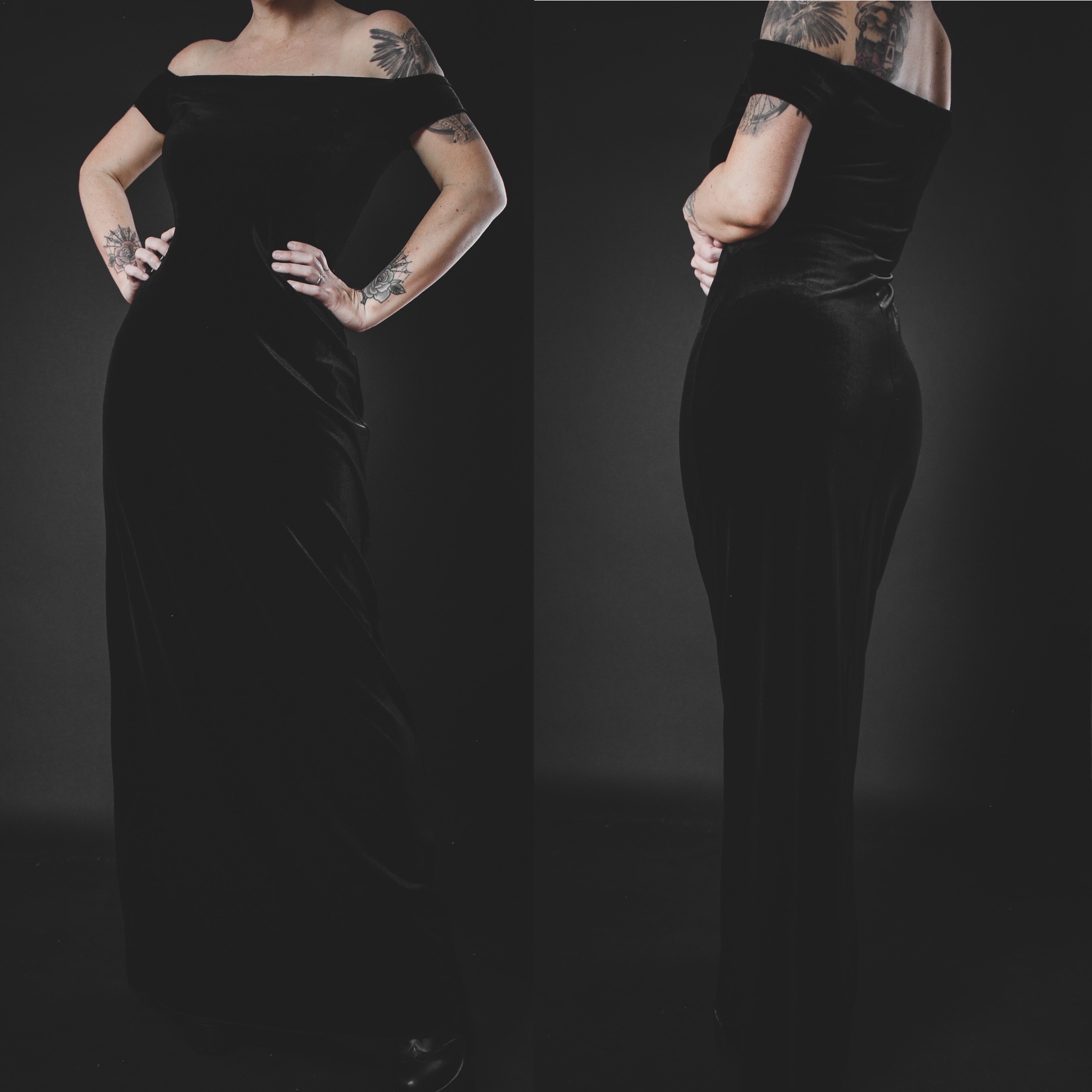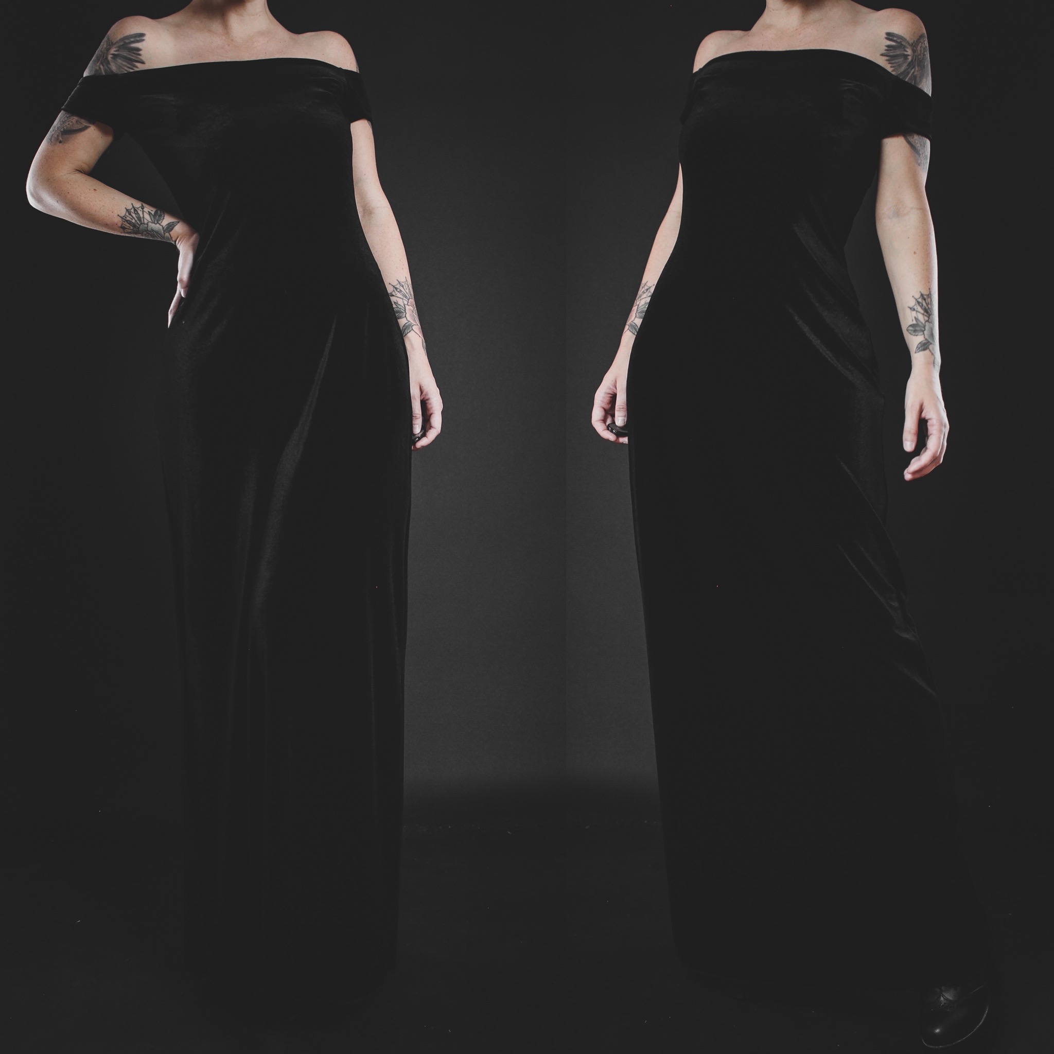 Vintage 80s black velvet gown. This is a Last Rites signature piece and such a gorgeous cut! Super soft and cozy fabric, unlined, no itch factor. Plenty of stretch all over. Pull-on style, off-the-shoulder neckline. Very comfortable and flattering and great for dressing up in the fall. Would look amazing belted to cinch the waist!
