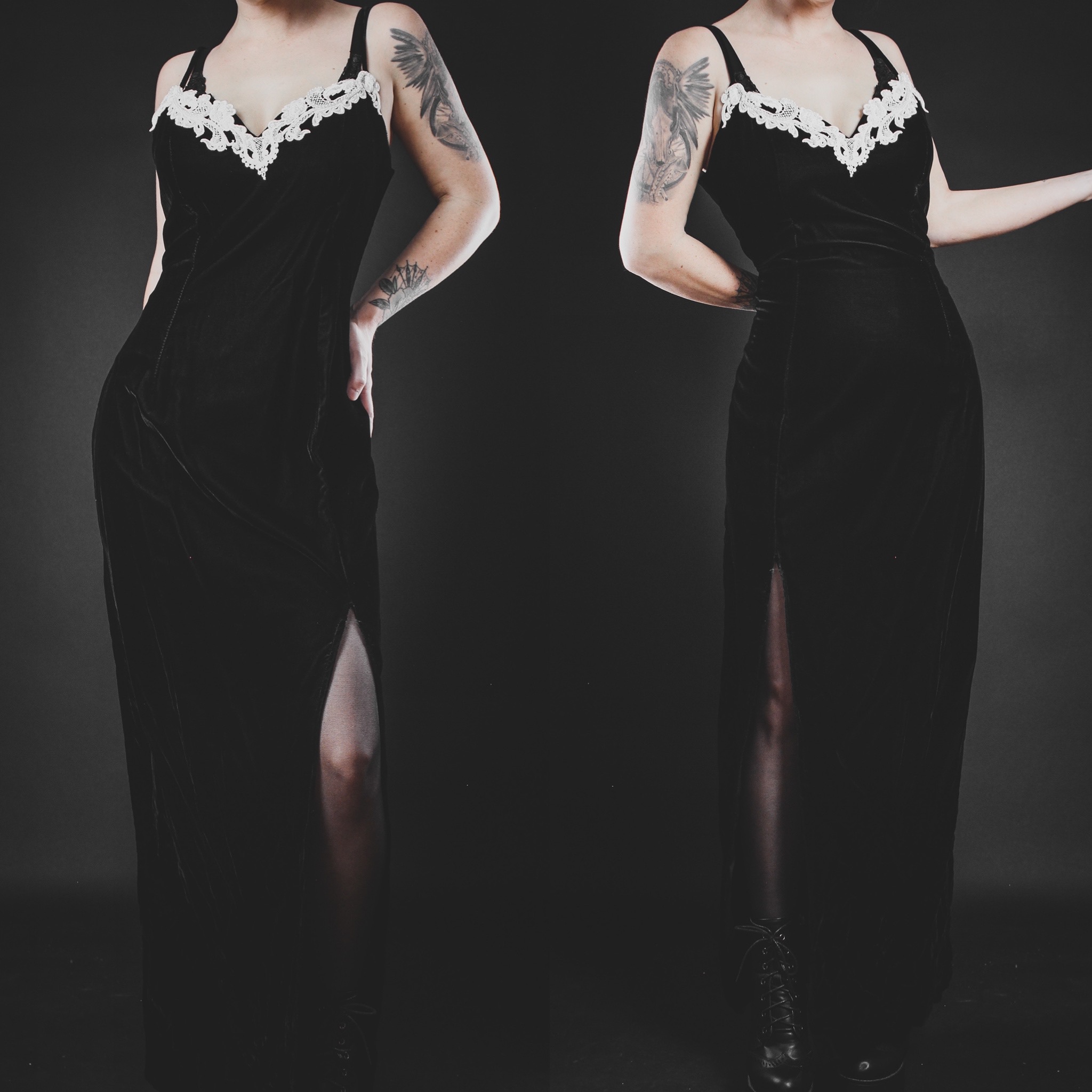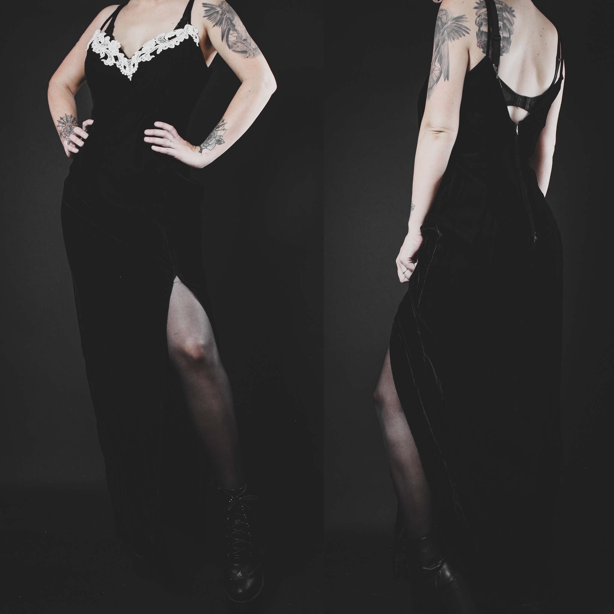 Vintage 80s black velvet gown with ivory crochet lace trim and tiny pearl beading. Wednesday Addams goes to prom!!! Super high side slit, v-neck and back, non-adjustable velvet straps, zips up the back. No stretch whatsoever.