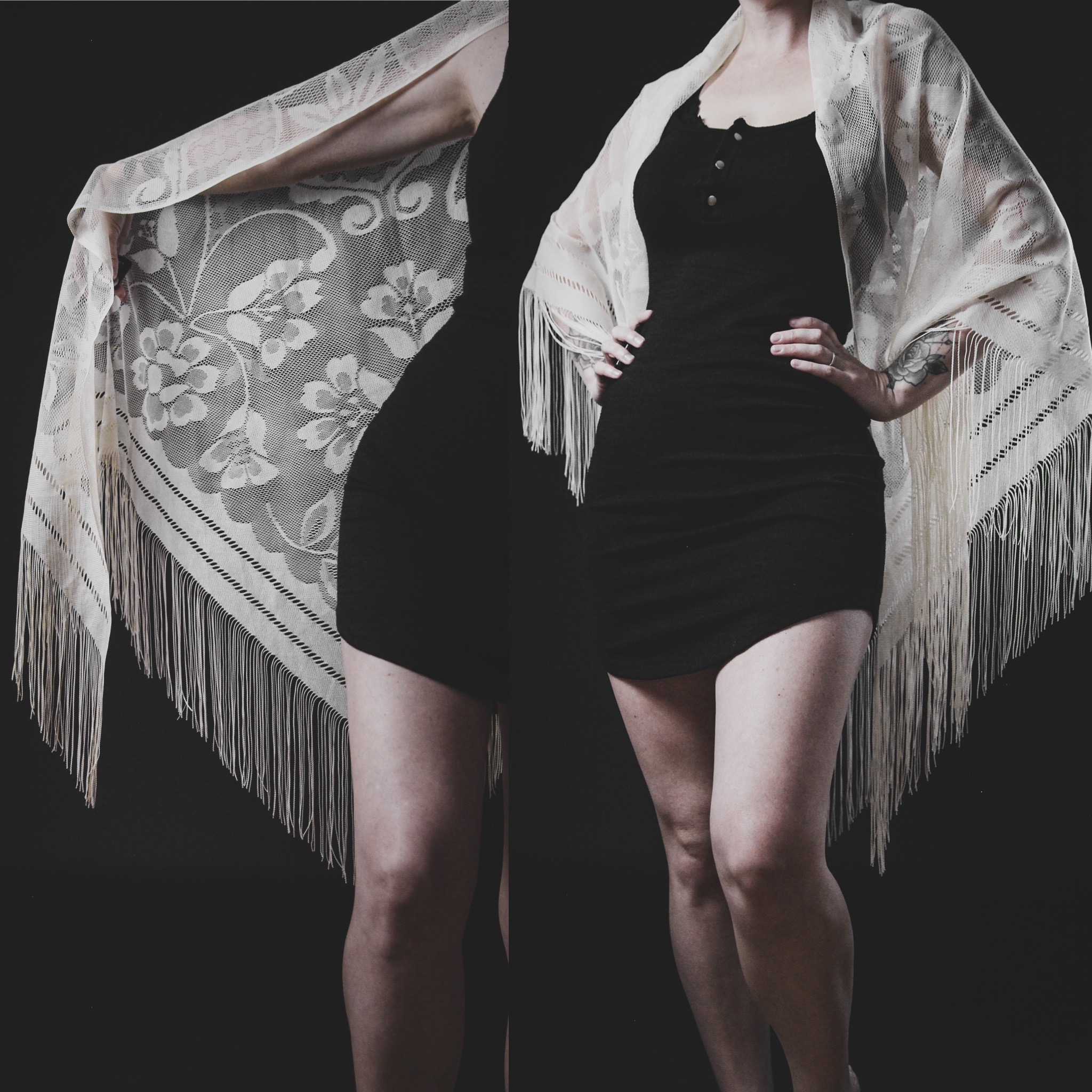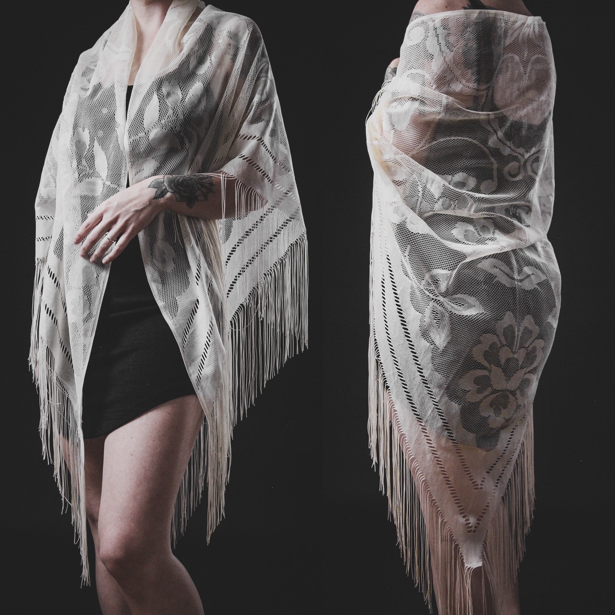Vintage 70s cream lace fringed shawl. This is a Last Rites signature piece in a XXL oversize style for extra drama. All Last Rites signature shawls are one of a kind with unique colors, patterns and lace! No two are alike. This one is triangular in a classic cream shade (falls between ivory and butter yellow) with beautiful floral lace and long delicate fringe on two sides. Can be worn over the shoulders in place of a cardigan or jacket, styled as a scarf, belted as a top, tied as a wrap skirt or swim coverup, or even used for home decor - the options are endless! Perfect throwover piece, especially for transitional or warm weather. Works for all seasons and can be dressed up or down. Stevie Nicks would be proud.