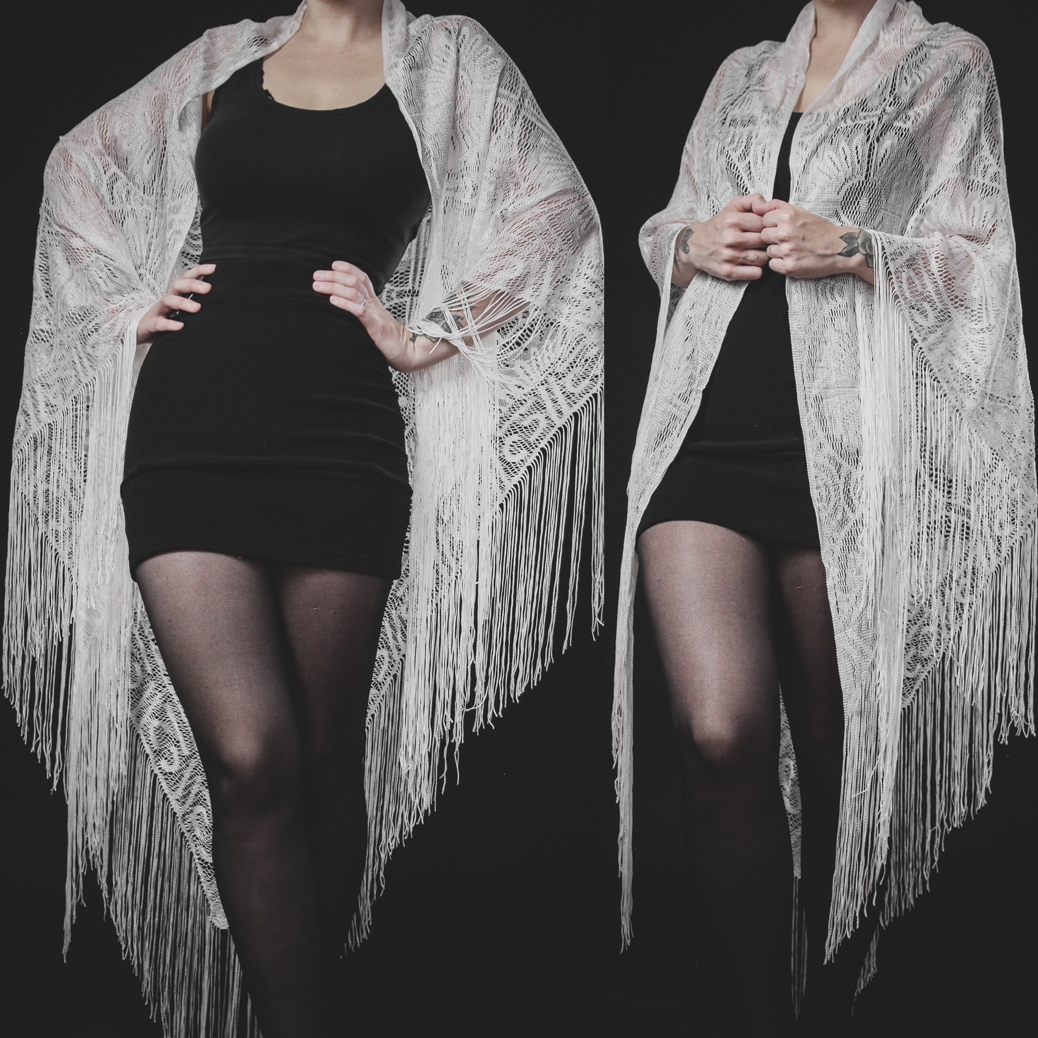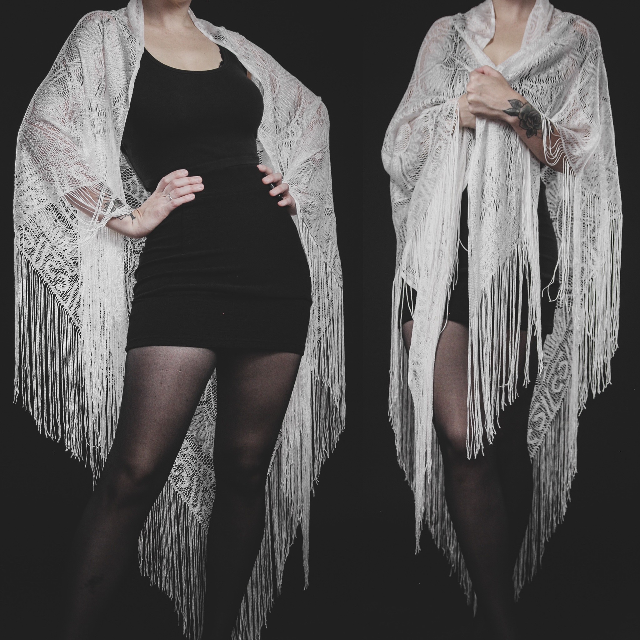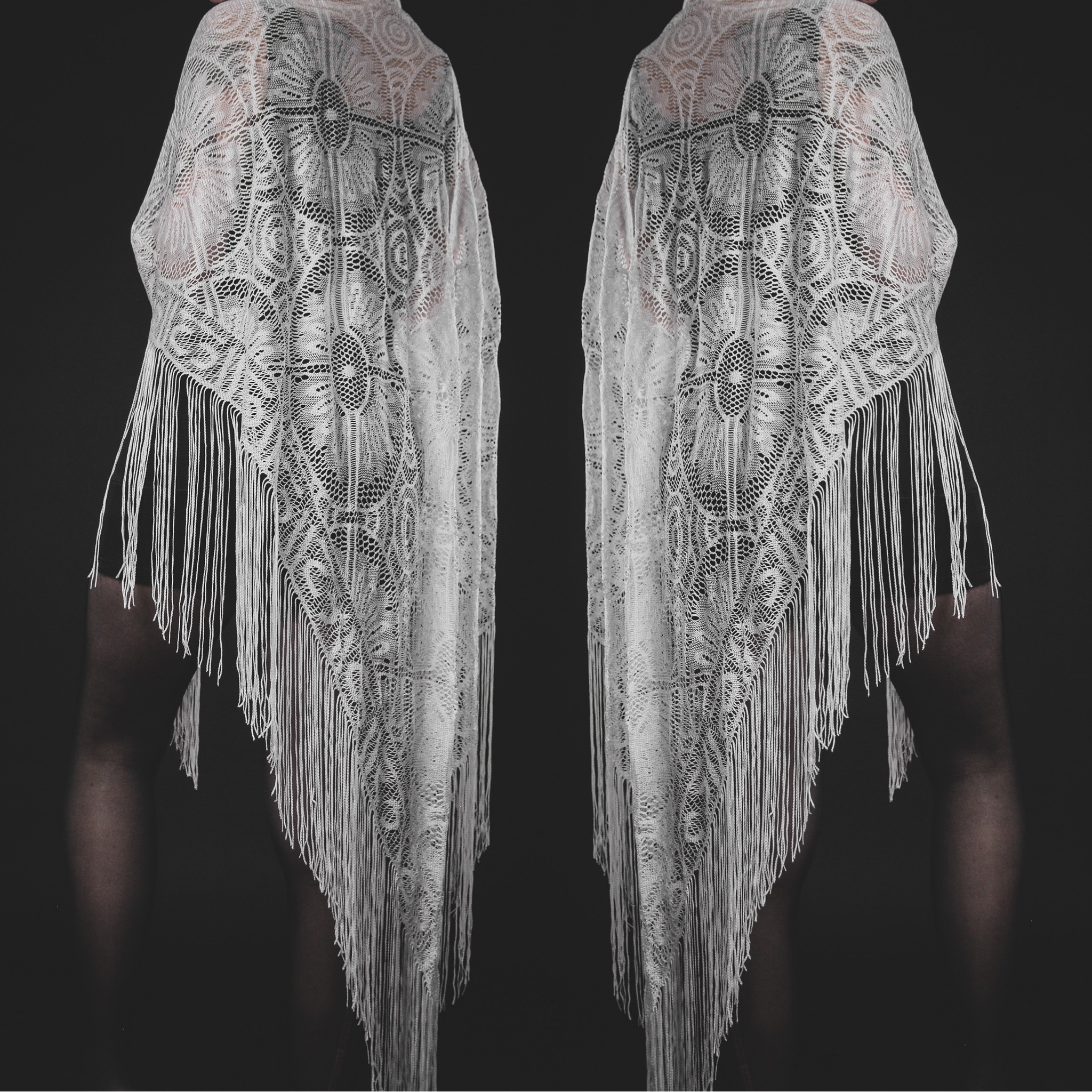 Vintage 70s ivory lace fringed shawl. This is a Last Rites signature piece in a XXL oversize style for extra drama - definitely one of the largest shawls I've ever listed! All Last Rites signature shawls are one of a kind with unique colors, patterns and lace! No two are alike. This one is triangular in a classic off-white shade with a beautiful lace medallion motif and long luxe fringe on two sides. Can be worn over the shoulders in place of a cardigan or jacket, styled as a scarf, belted as a top, tied as a wrap skirt or swim coverup, or even used for home decor - the options are endless! Perfect throwover piece, especially for transitional or warm weather. Works for all seasons and can be dressed up or down. Stevie Nicks would be proud.