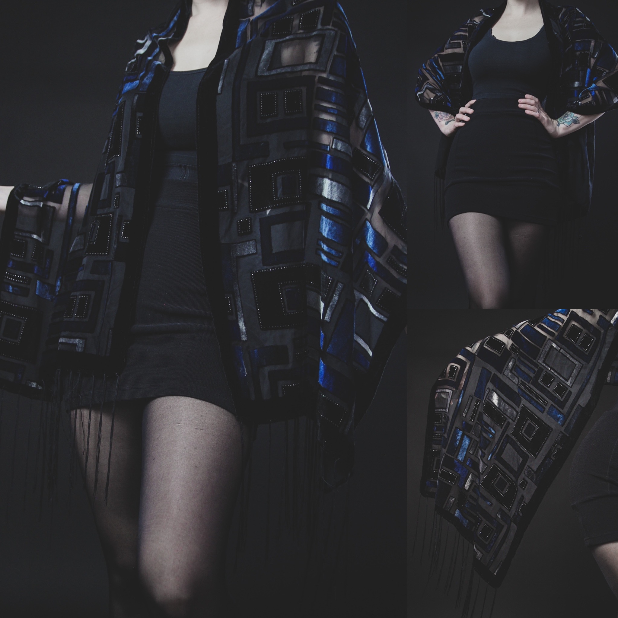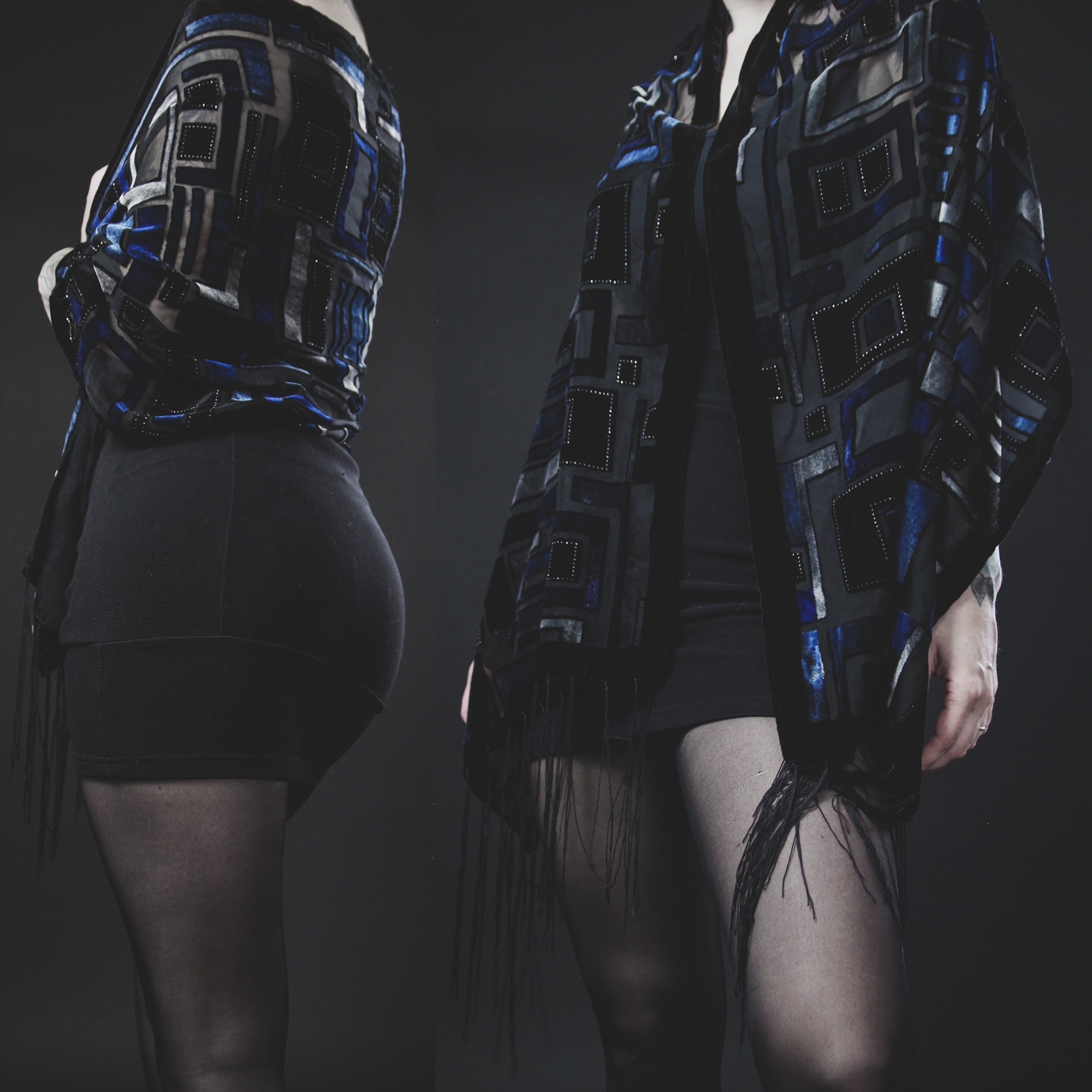 Vintage 80s velvet burnout shawl. All Last Rites signature velvet shawls are one of a kind with unique colors and patterns! This one has sheer black backing with a geometric patter in shades of blue and silver. Long delicate fringe on both ends. Black trim and silver glitter detailing all over.