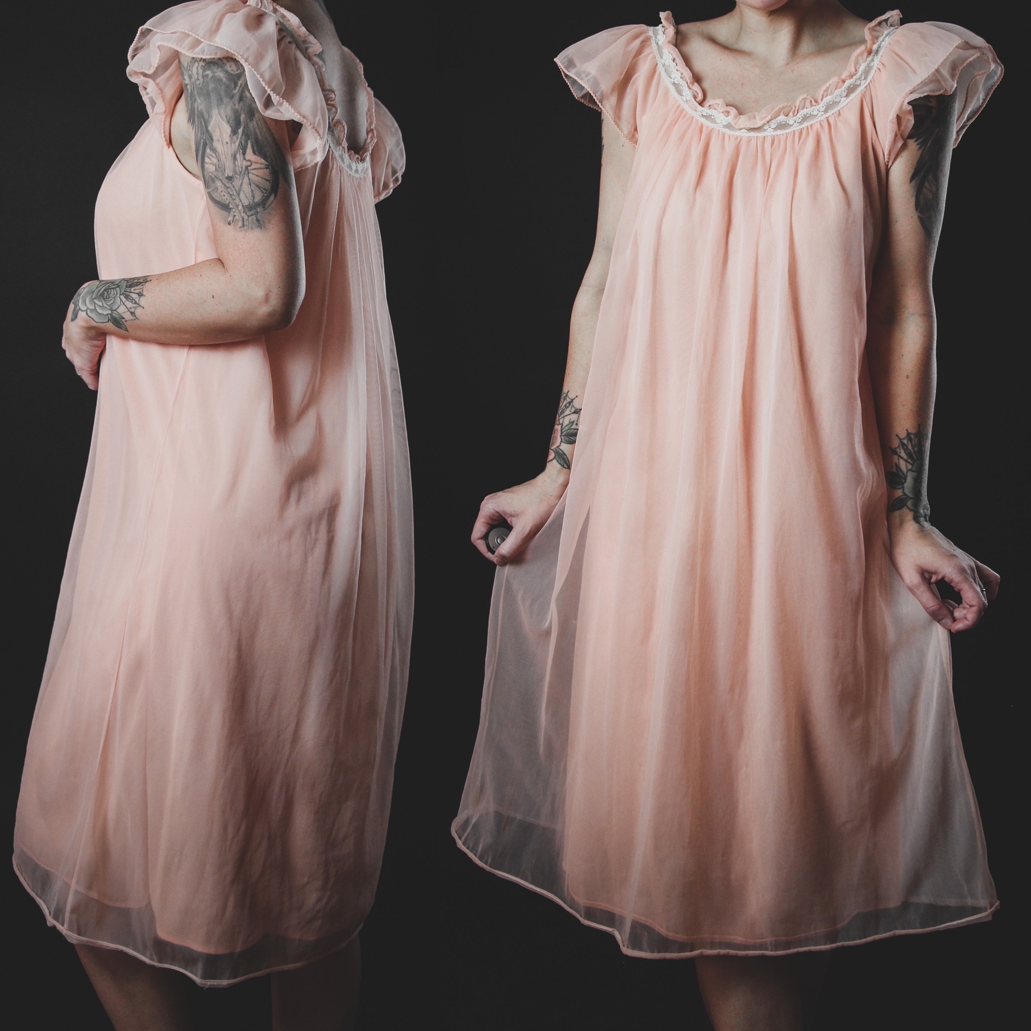 Vintage 60s peach peignoir nightie. Babydoll cut with ruffled cap sleeves and lace trim. Double-layered chiffon and nylon. No stretch. Flowy fit, flares out slightly from the shoulders. Extra spooky, haunted doll vibes and the color is perfect for fall! Pull-on style, black liner dress in photo is not included.