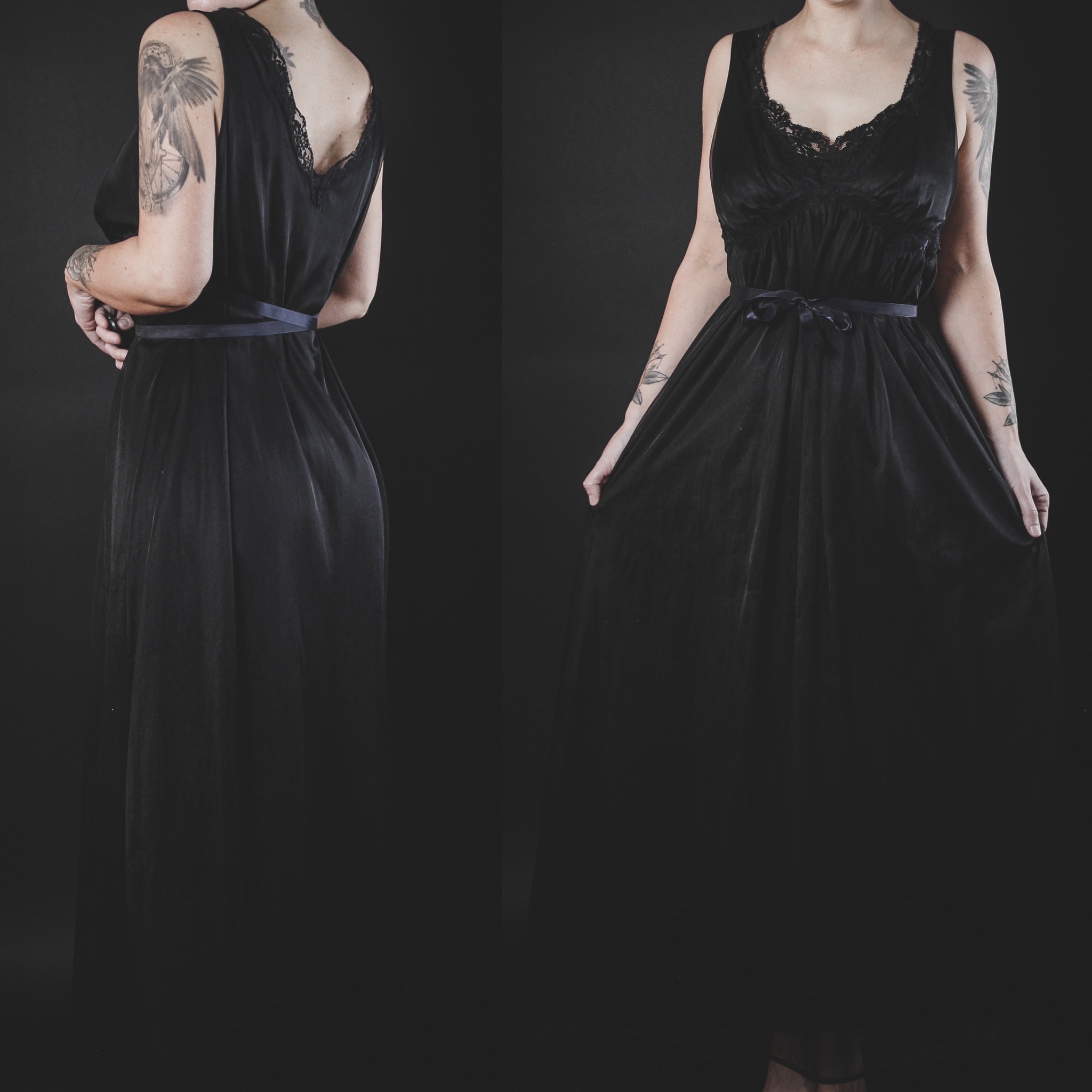 Vintage 60s black nylon and lace negligee. Sleeveless cut with plunging v-neck, empire waist, ruched sweetheart bust, lace detailing and a long navy blue ribbon tie to cinch the waist. Double layered, nylon base with chiffon overlay. Pull-on style, no stretch.