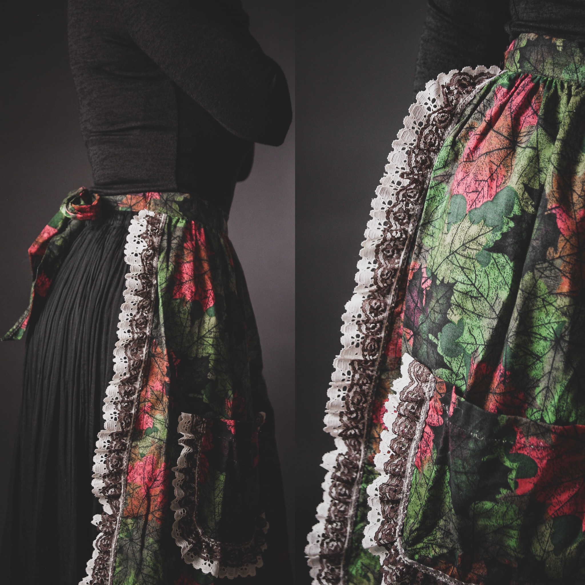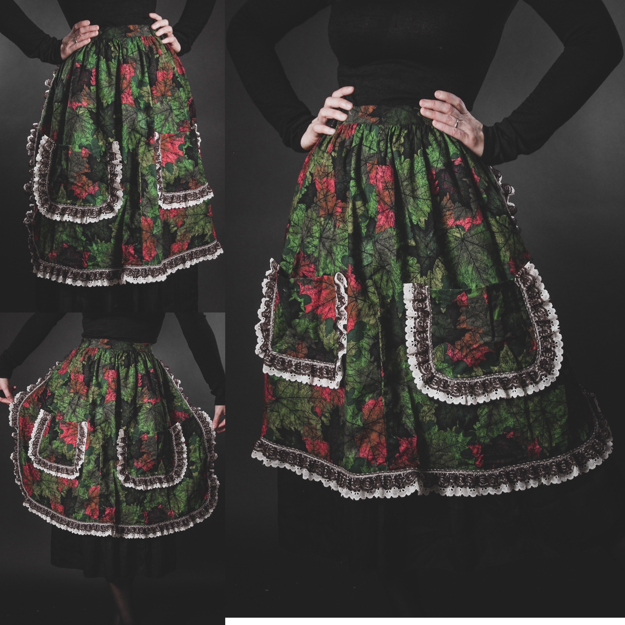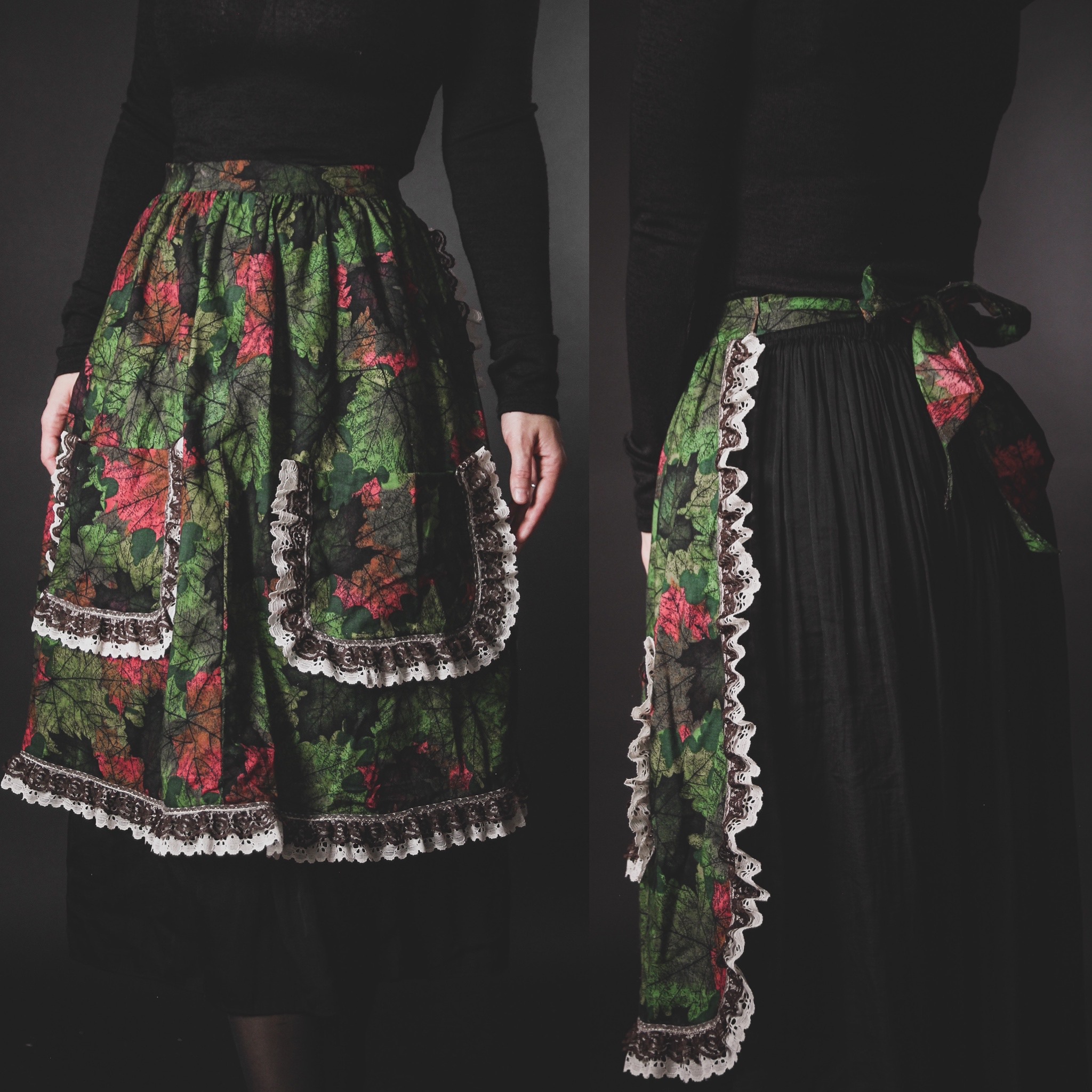 Vintage handmade fall apron. IT'S AN APRON! This is by far one of my favorite finds ever. I am dying to meet the fabulous kitschy cottage queen who made this. Gorgeous green, pink, brown and black fall leaves cotton fabric with layers of ivory and brown lace trim. Deep front pockets and fully adjustable ties for your waist. Obviously you can wear this in the kitchen or garden, but I would 10000% style it every single day and layer it over all my favorite skirts and dresses. A cottagecore DREAM. 24" long by 33" wide, and thanks to the adjustable ties it will fit up to a 47" waist max! Unlined, no stretch.
