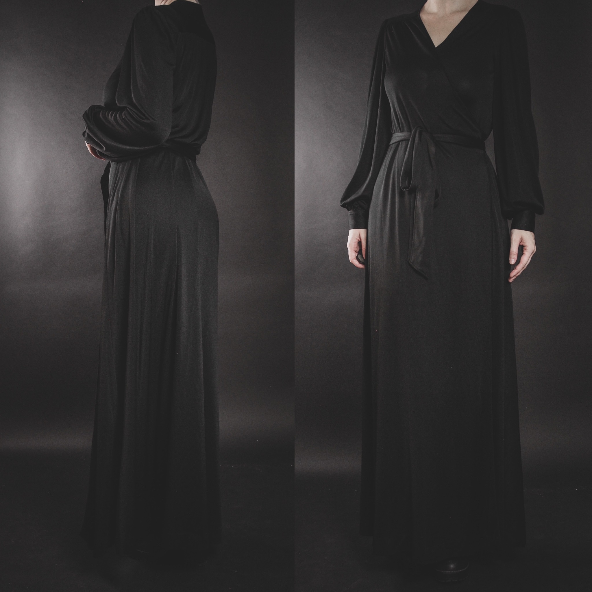 Gorgeous flowy dressing gown in smooth black polyester with puffed shoulders, bishop sleeves and buttons at the cuffs. No stretch but it does have a bit of give. Wrap style with looong belt ties, v-neck and a hidden belt loop. Best fits a size Small or Medium. 20" across under the arms laying flat (max 40" bust), shoulder seams are 14" apart on the hanger, sleeves are 24" from shoulder seam. Full length to hem is 55". Best for someone average height or taller, otherwise it will drag!