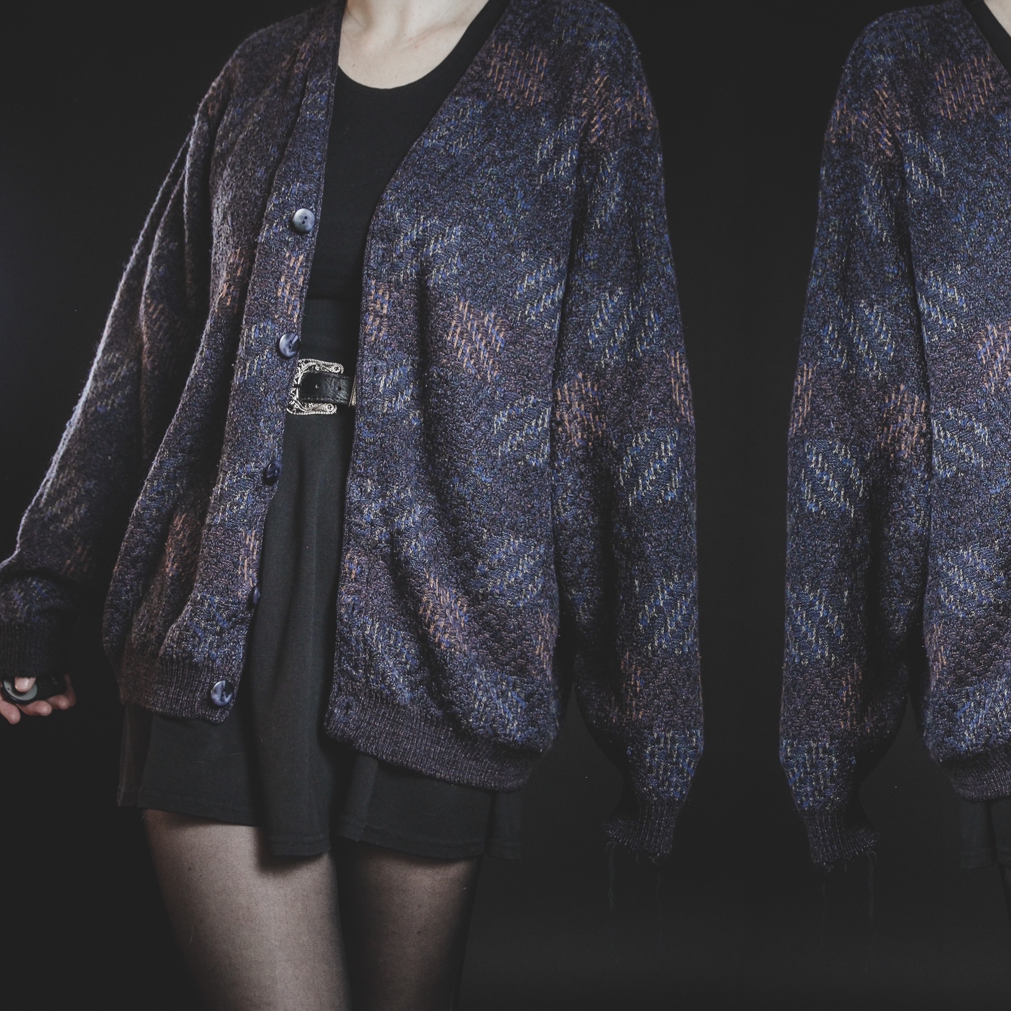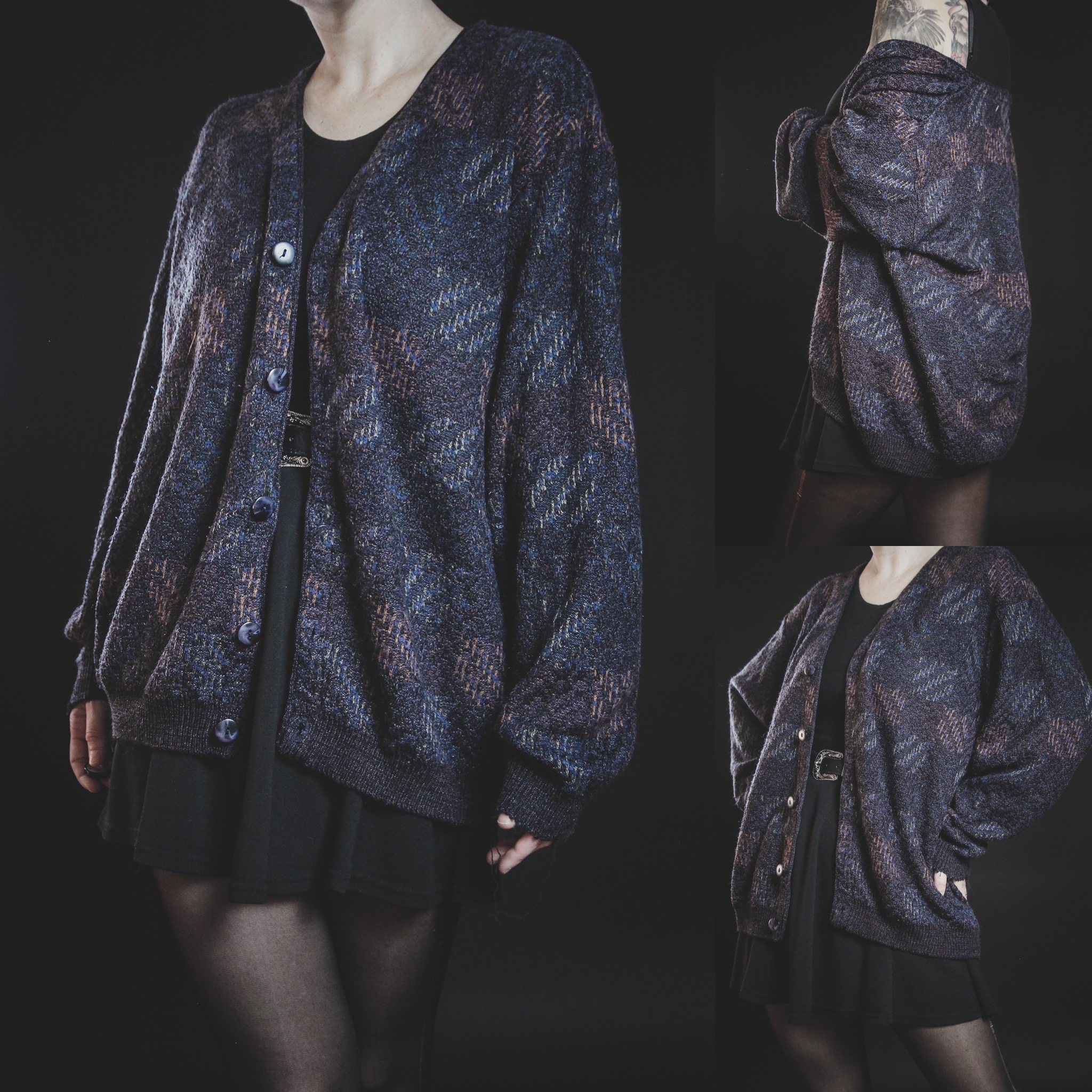 The ultimate cozy fall staple sweater! All Last Rites signature sweaters are one-of-a-kind unisex vintage finds straight out of the 80s and 90s, with unique collars and patterns! This one is a midweight knit with a subtle geo print in shades of navy, purple, orange and olive. Super slouchy, comfy and cozy with loose sleeves.