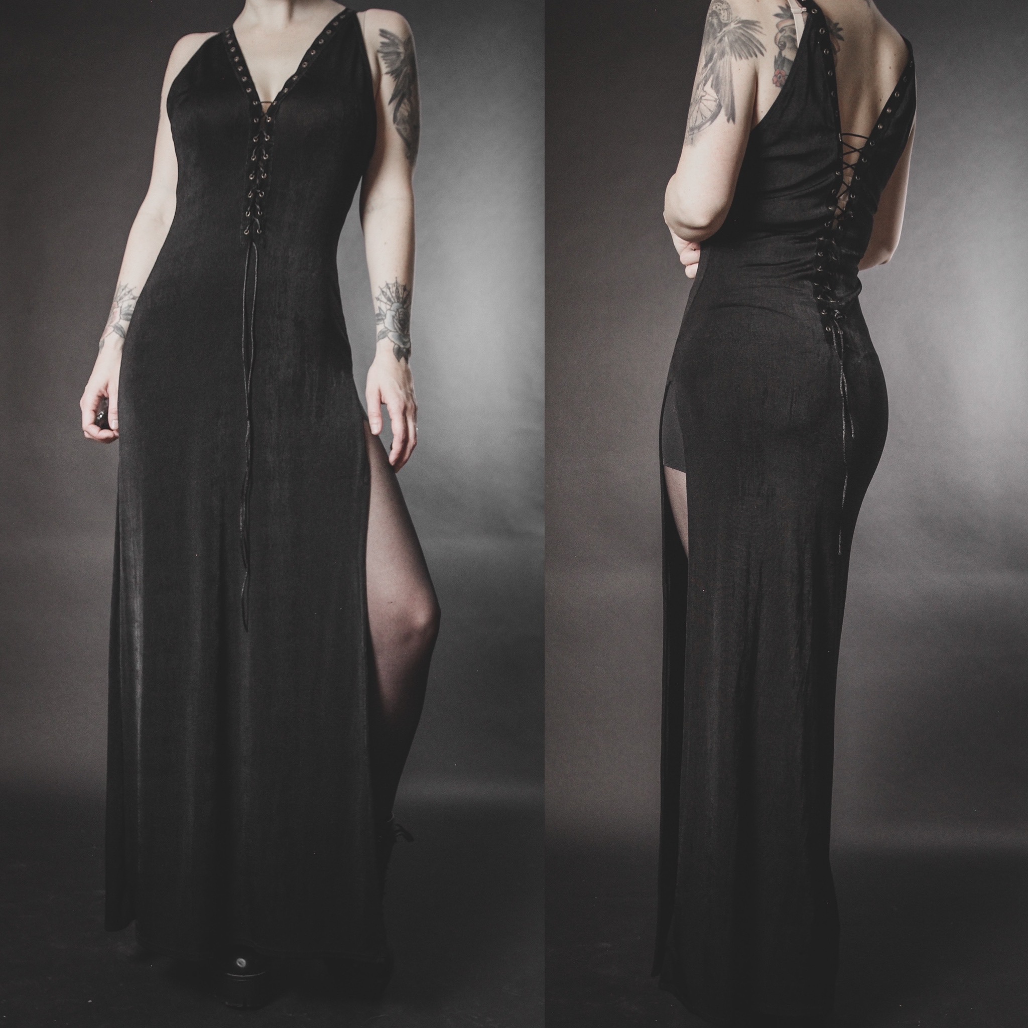 Vintage 90s slinky jersey maxi dress with lace-up detailing. This is a super fun and unique find! Plunging v-neck and v-back with lace-up grommet closure - fully adjustable black satin cord, burnished gold grommets and velvet trim. Grommet detailing continues up and around the shoulders. Main fabric is a slinky, very stretchy, semi-shiny jersey knit. Unlined. Sky-high side slit lets you show some leg! Pull-on style. Fits a busty size Small, or a Medium for a comfy, curve-hugging fit.