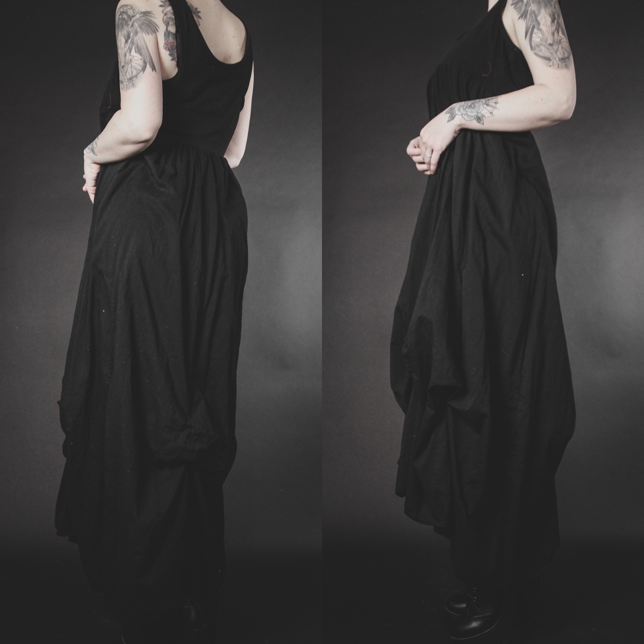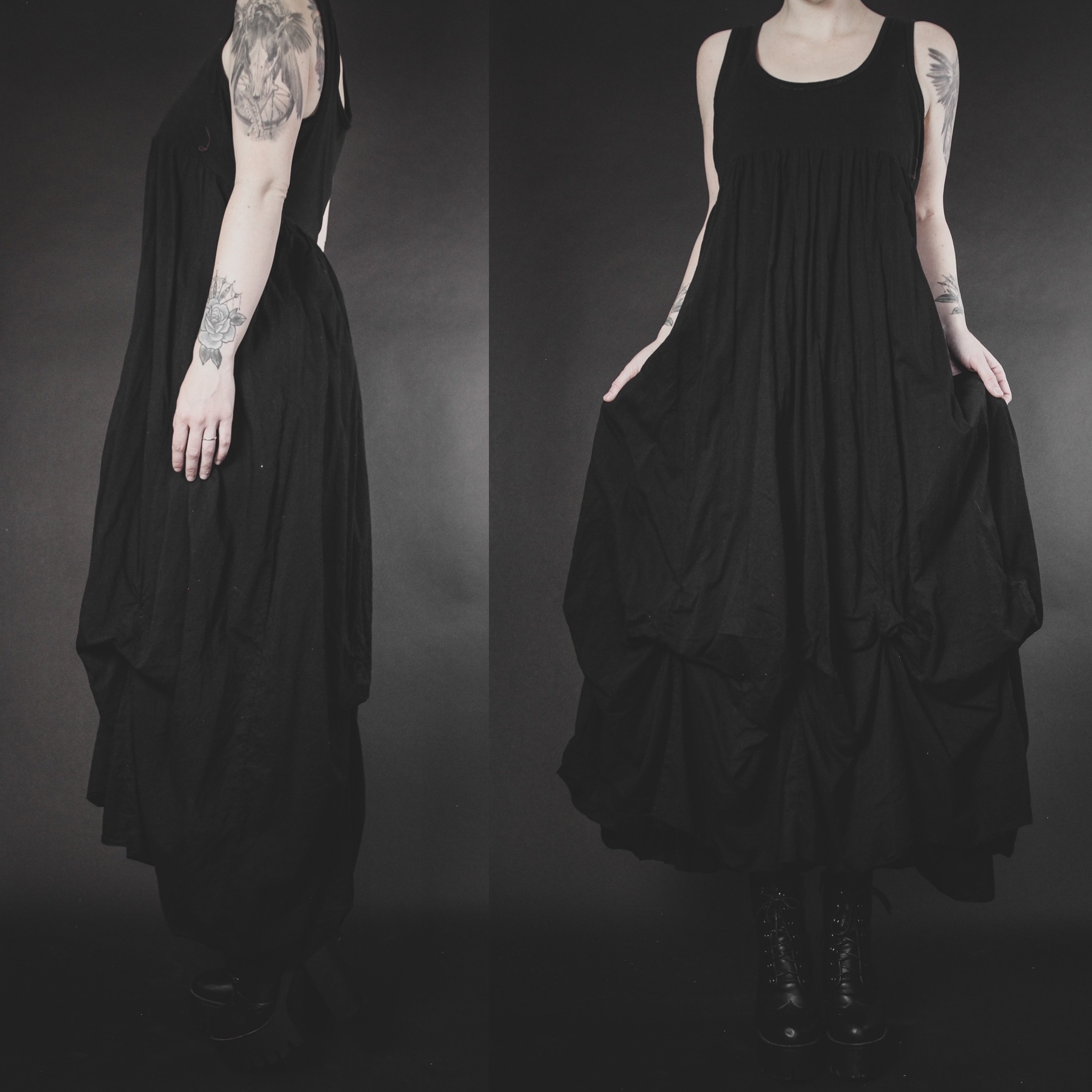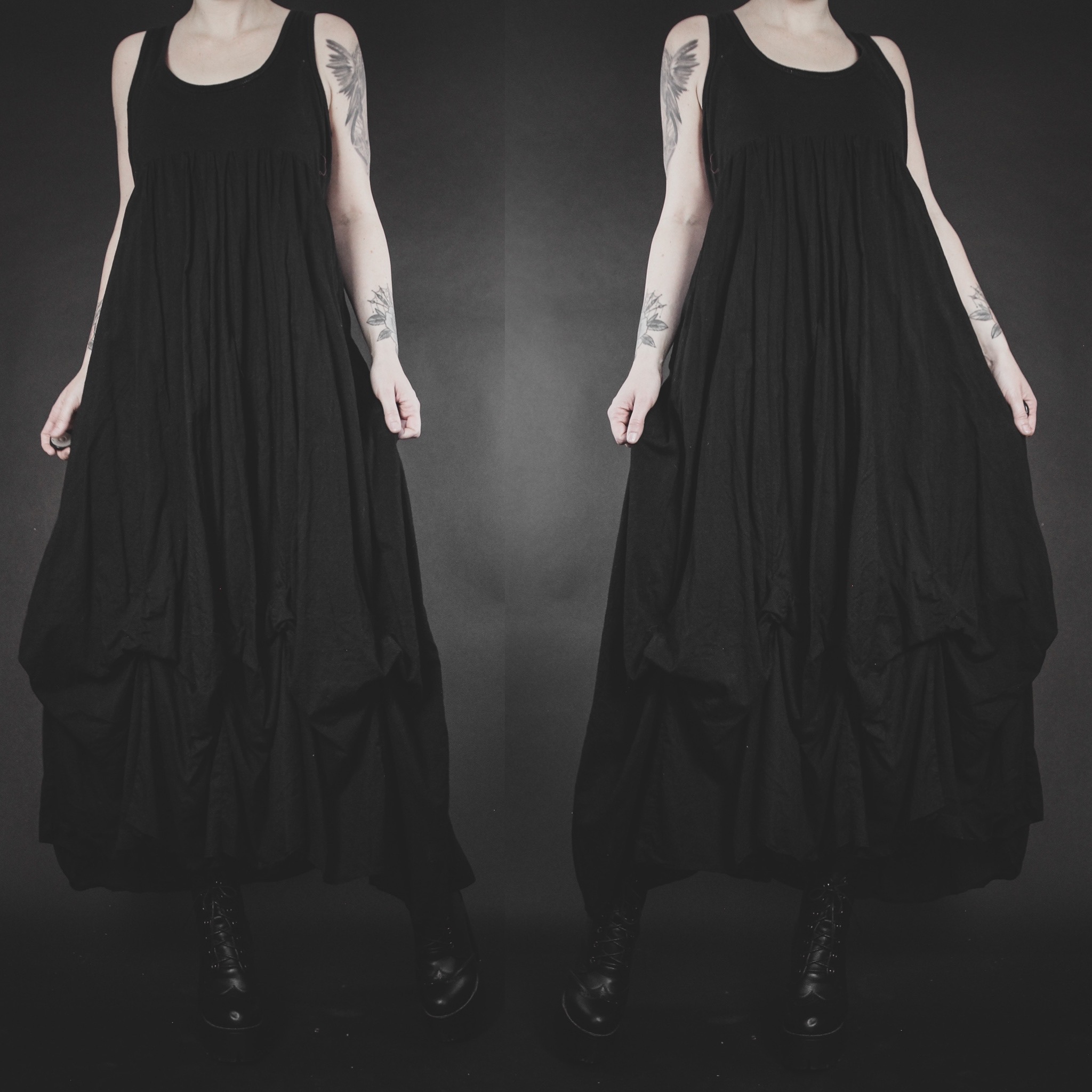 Black draped maxi dress. Tag has been removed, definitely a modern piece. Semi-sheer, super soft cotton blend fabric. Pull-on style, has a bit of stretch at the top. Sleeveless cut, empire waist, hidden built-in liner and tons of amazing gathered draping in the skirt. So fun and versatile. This is the perfect comfy witchy everyday dress.