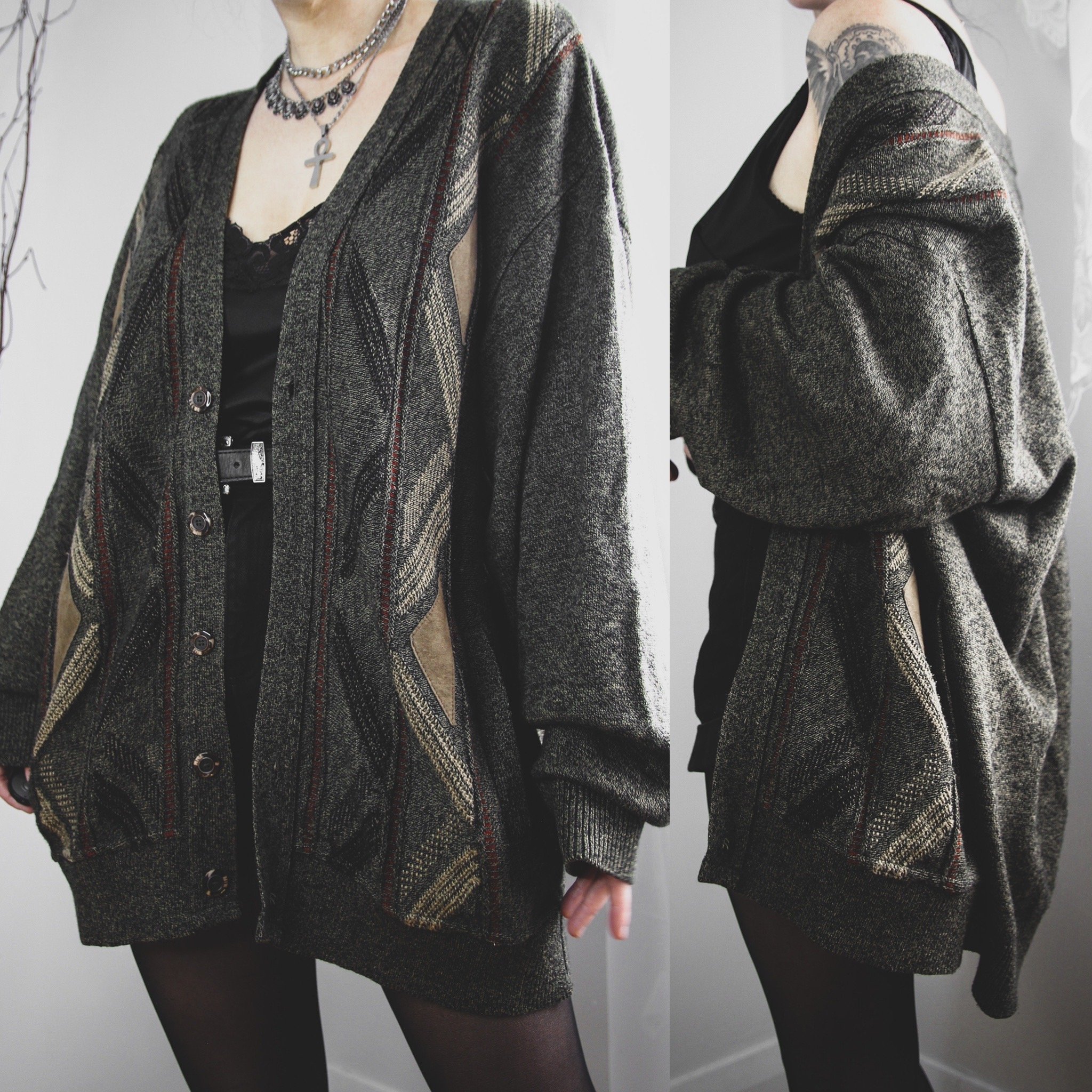 The ultimate cozy fall staple sweater! All Last Rites signature sweaters and cardis are one-of-a-kind unisex vintage finds straight out of the 80s and 90s, with unique collars and patterns! This one is a chunky marled black-and-tan knit. Olive suede 3D accents and geometric details in orange, tan and brown-black. V-neck, tortoiseshell buttons down the front, and pockets! Super slouchy, comfy and cozy with loose balloon sleeves. 50/50 wool-acrylic blend. May have a bit of itch factor if you're sensitive to knits, but layer up with a turtleneck, button down or thermal top underneath and you'll be fine!