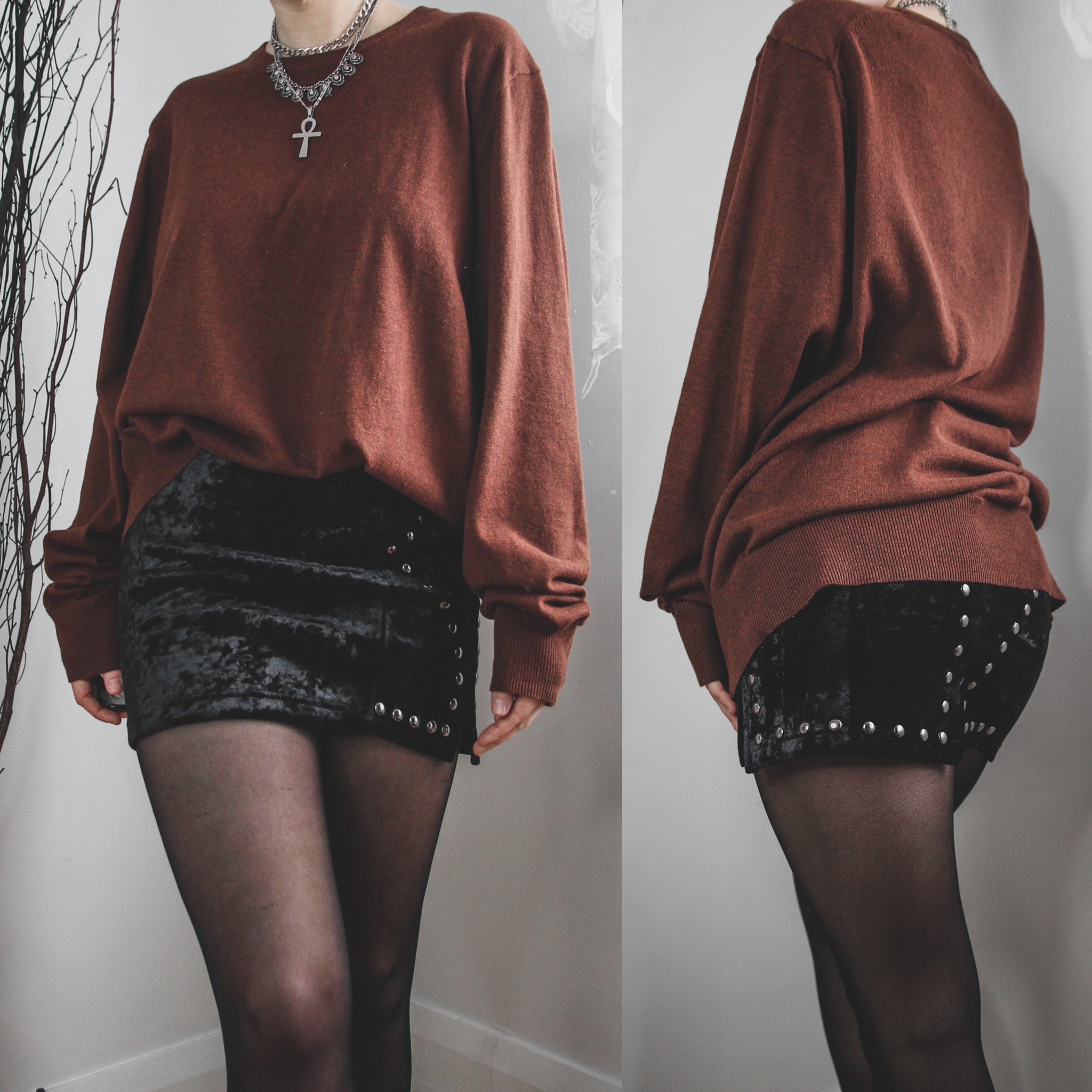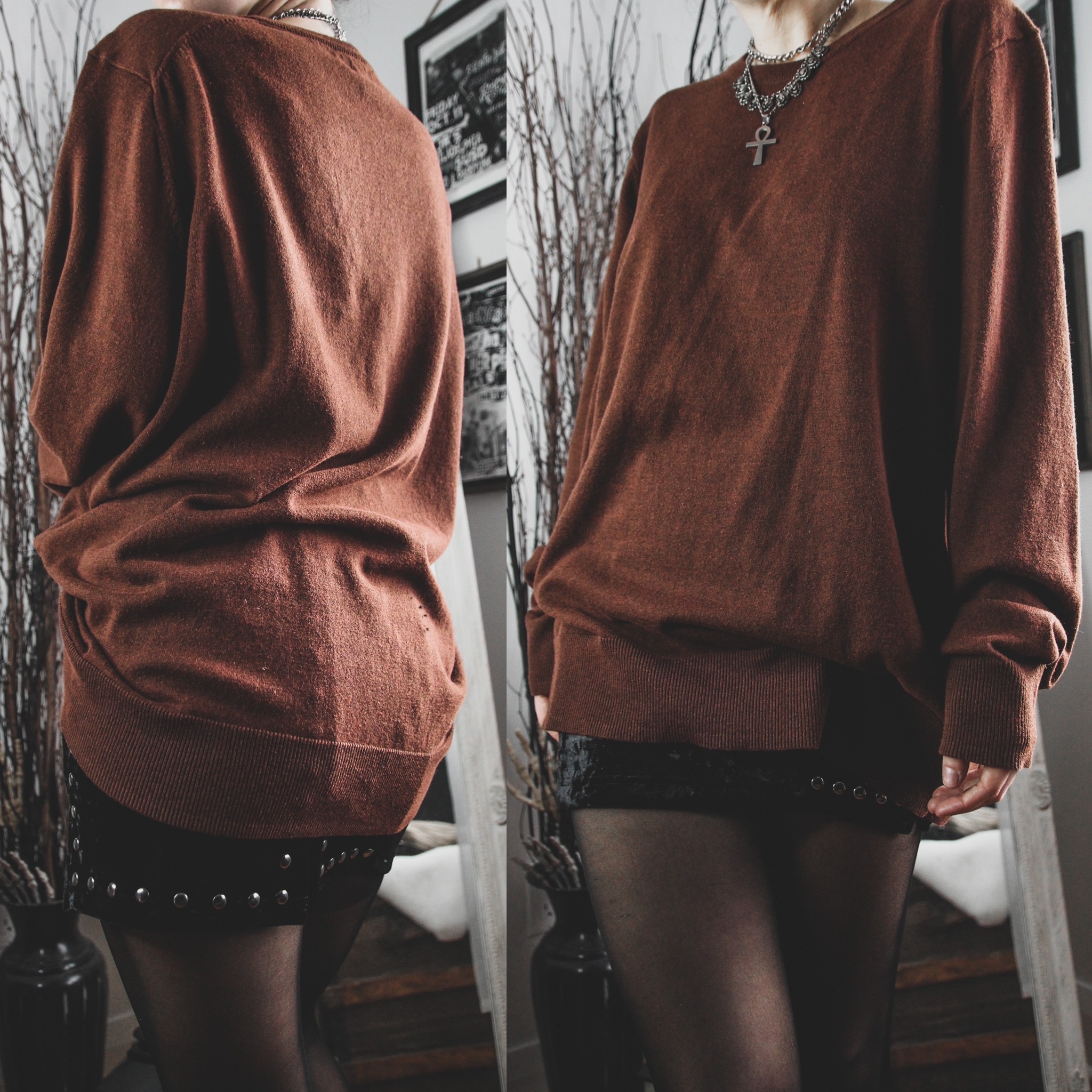 The ultimate cozy fall staple sweater! All Last Rites signature sweaters and cardis are one-of-a-kind unisex vintage finds straight out of the 80s and 90s, with unique collars and patterns! This one is a super-soft thermal knit in a deep rusty pumpkin-brown shade. Longline straight cut with just the right amount of slouch and perfectly broken in. It is on the thinner side, closer to a thermal layering top than a chunky sweater - great for keeping warm without bulk!