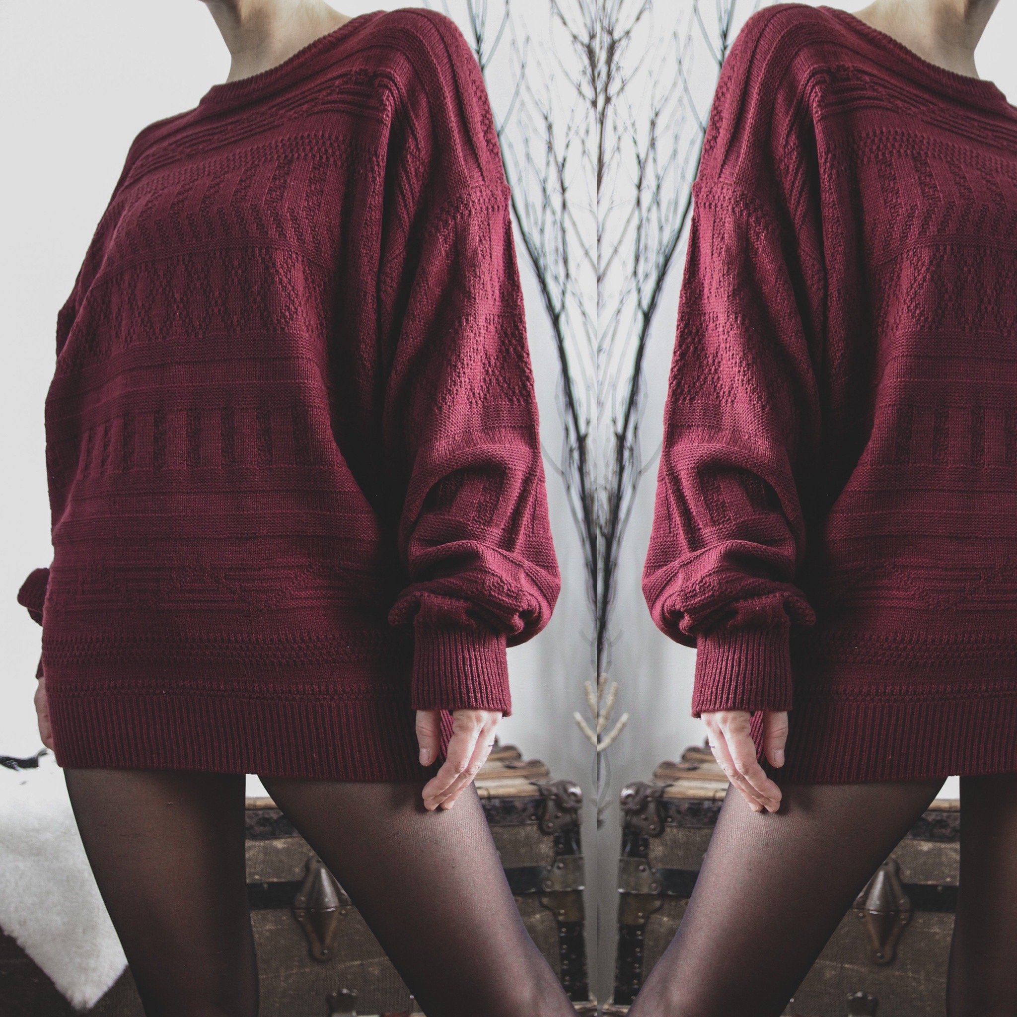 The ultimate cozy fall staple sweater! All Last Rites signature sweaters and cardis are one-of-a-kind unisex vintage finds straight out of the 80s and 90s, with unique collars and patterns! This one is a chunky fair isle knit in a classic burgundy shade - leans more purple than red. 100% acrylic, soft with no itch factor that I can tell! Super slouchy, comfy and cozy with loose balloon sleeves.