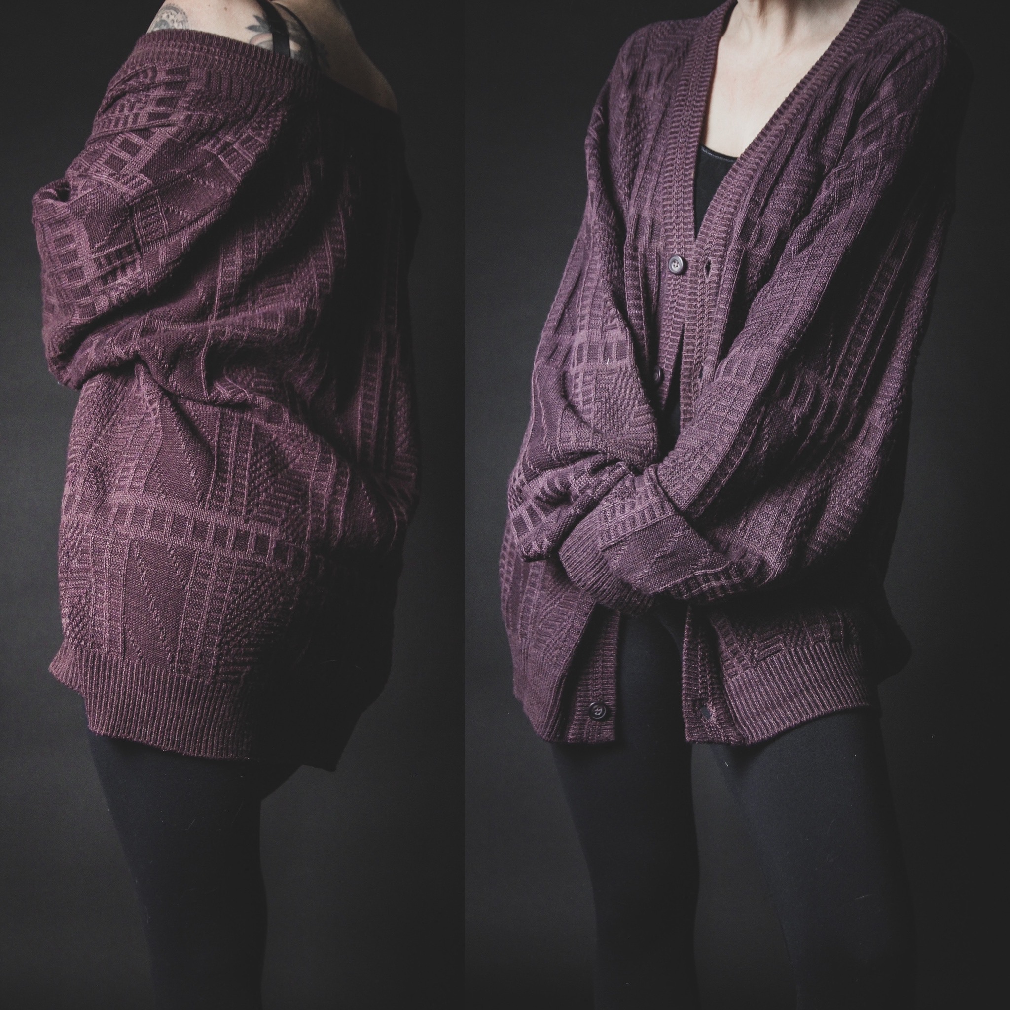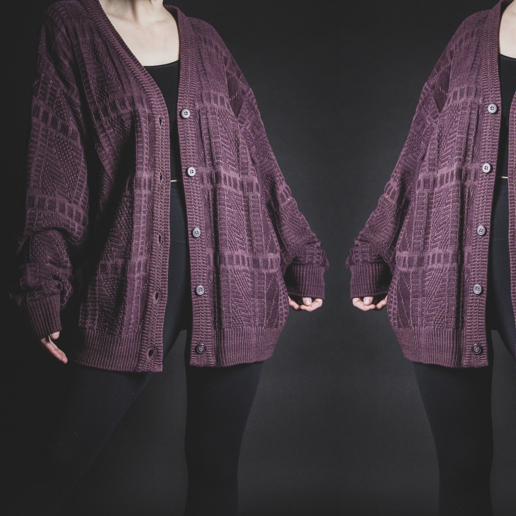 A perfect cozy staple sweater! All Last Rites signature sweaters and cardis are one-of-a-kind unisex vintage finds straight out of the 80s and 90s, with unique collars and patterns! This one is a chunky cable knit in a muted "frosted" burgundy shade (leans more purple than red).Super slouchy, comfy and cozy with loose balloon sleeves. Nylon-acrylic blend. May have a bit of itch factor if you're sensitive to knits, but easy to layer up with a turtleneck, button down or thermal top underneath!