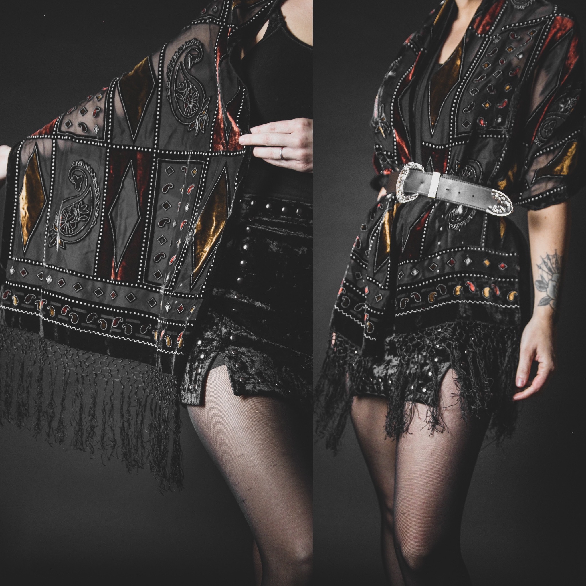 Vintage 80s signature velvet shawl. All Last Rites signature shawls are one of a kind silk blends with unique colors and patterns, no two are alike! This one has sheer black backing with a stained-glass inspired pattern in shades of pumpkin orange, mustard gold, and silver crushed velvet. Serving all the autumn vibes with this color scheme! Thick braided fringe on both ends.