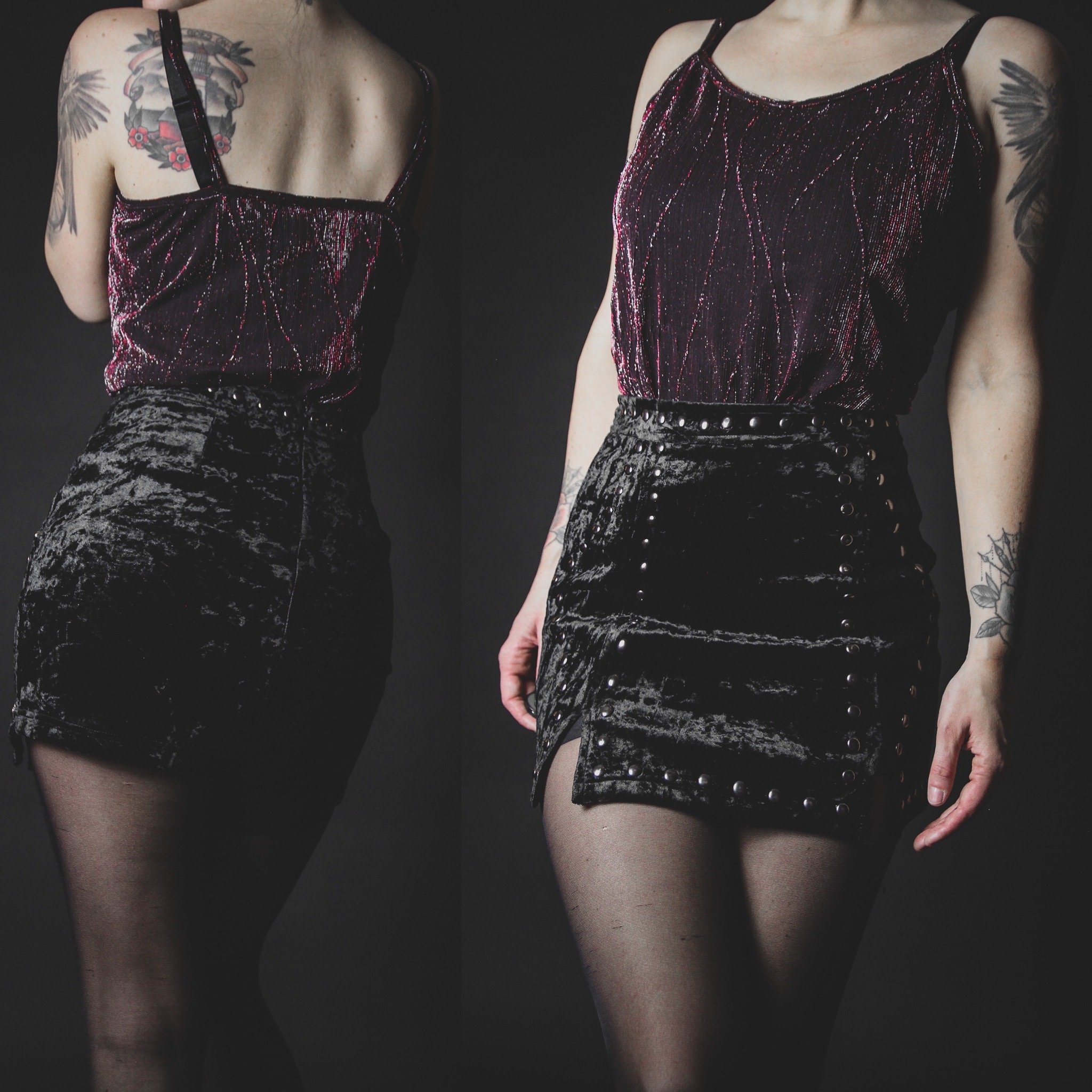 Vintage 90s metallic tank top. A festive find for all your holiday looks! Wavy 3D metallic knit, in shades of silver, cranberry pink and red on black. The glittery threading gives it a cool ~duochrome~ frosted berry look! Stretchy all over, outer metallic layer is semi-sheer with a built in black poly satin liner. Pull-on style, straps are non adjustable. Boxy, straight cut.