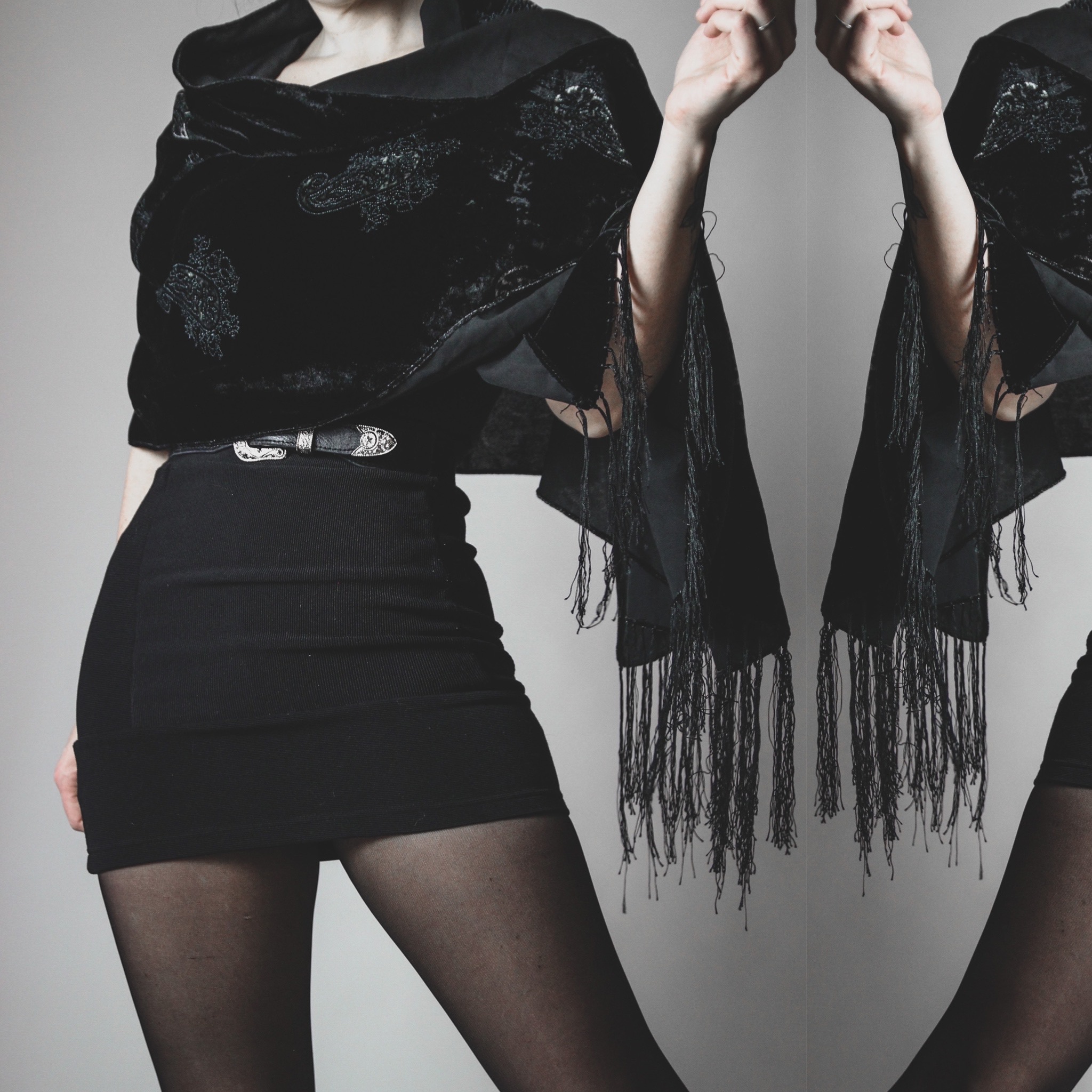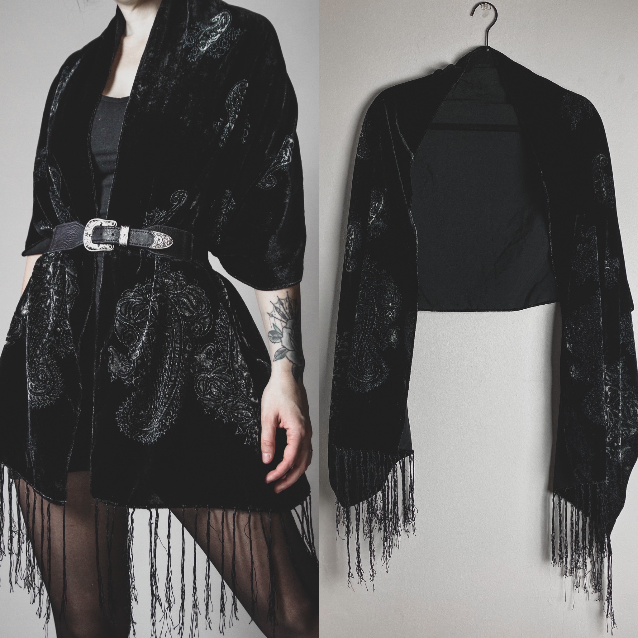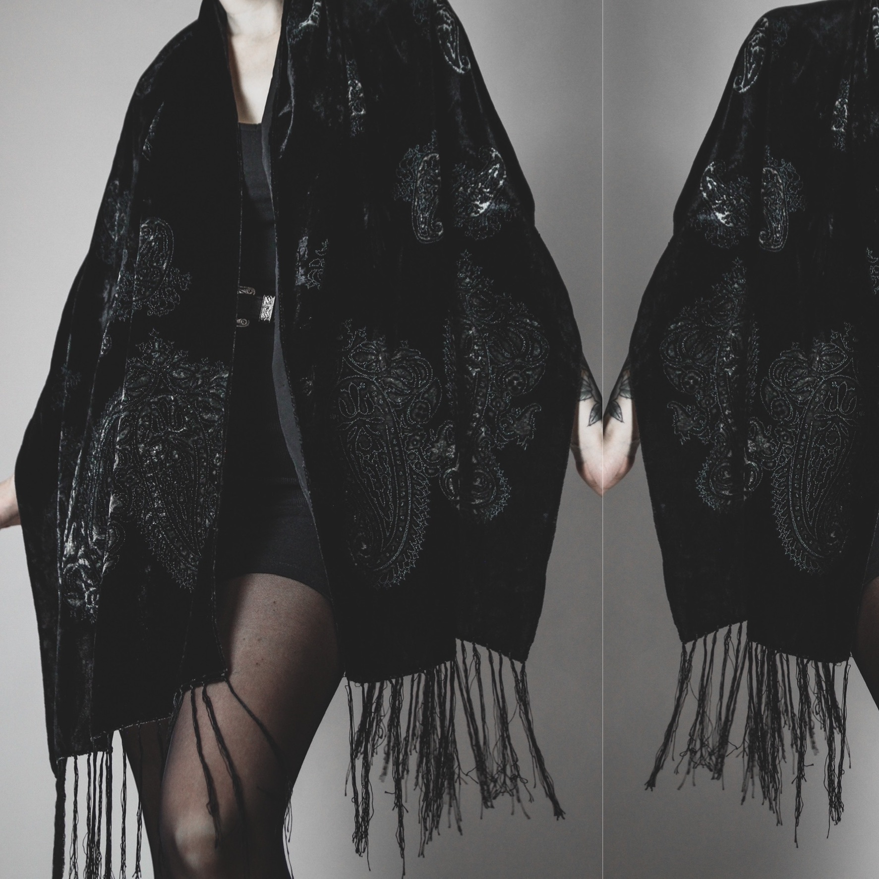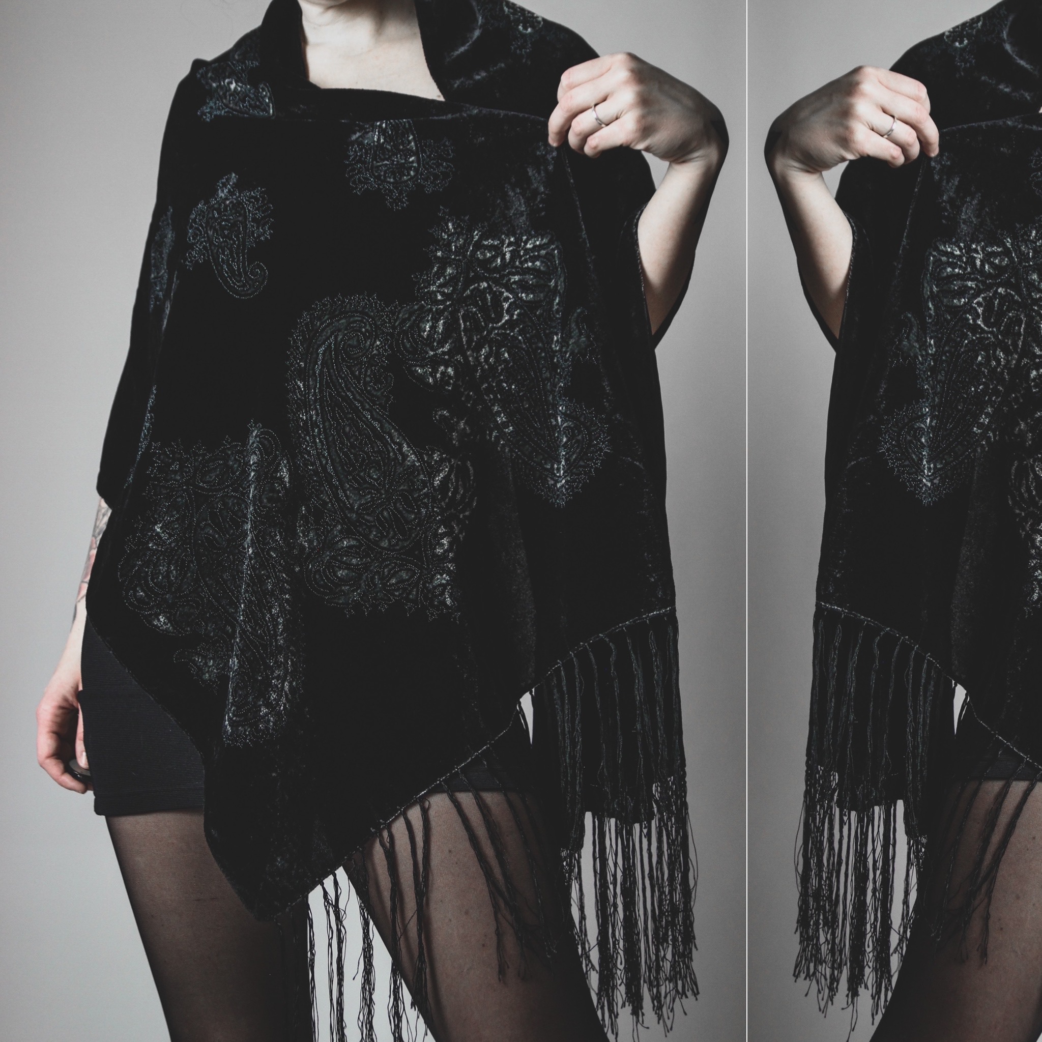 Vintage 80s signature velvet shawl. All Last Rites signature shawls are one of a kind silk blends with unique colors and patterns, no two are alike! This one is black crushed velvet with a gorgeous paisley pattern in shades of silver. Long delicate fringe on both ends.