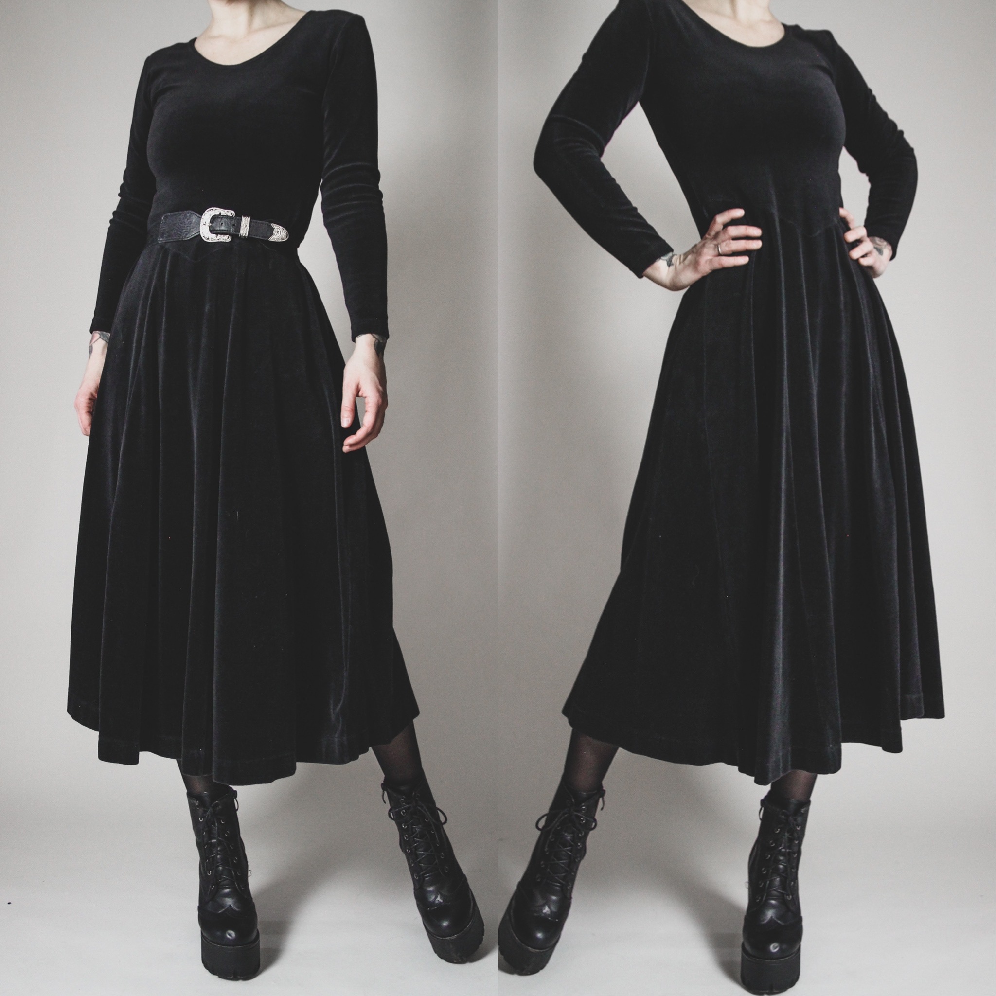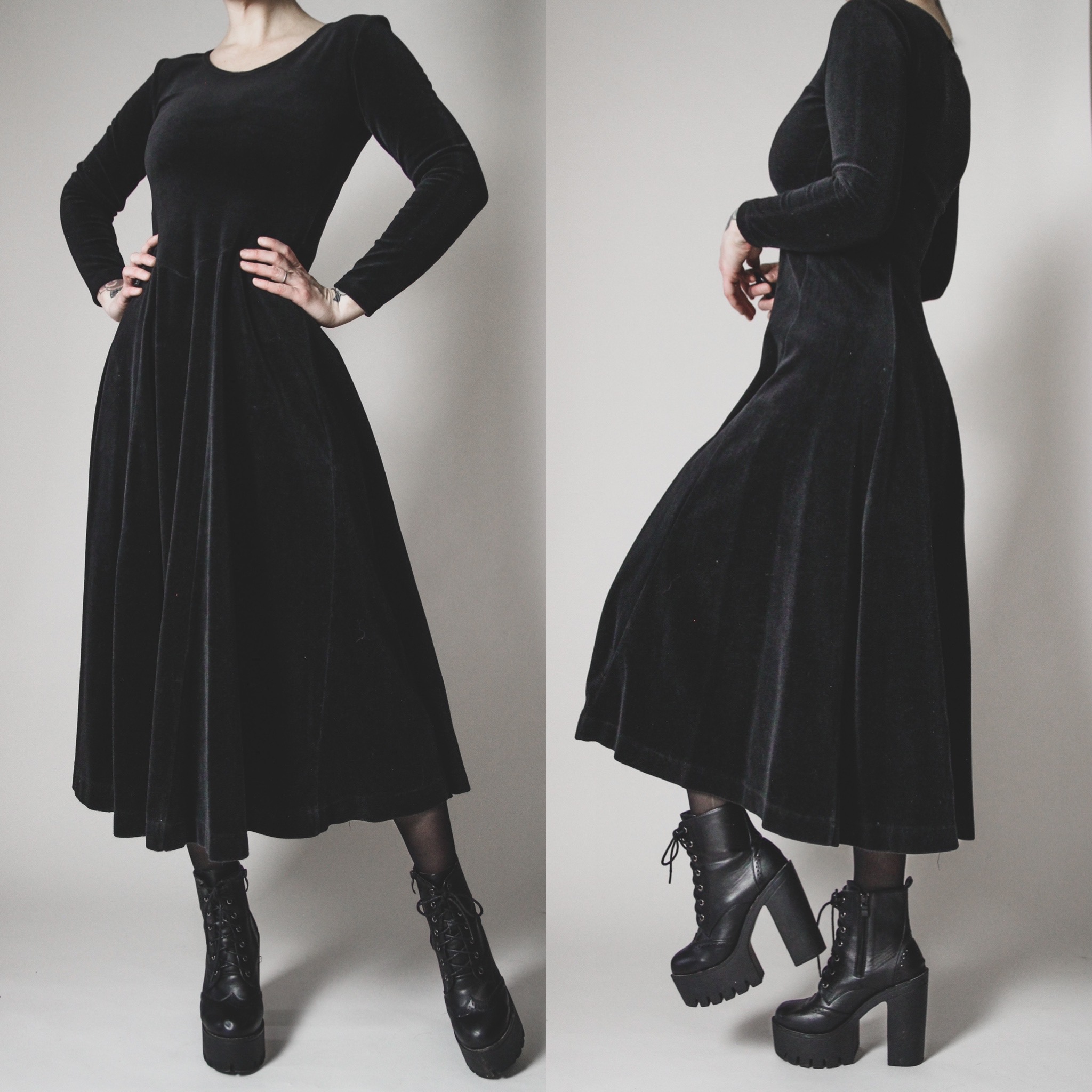 Vintage 90s velour gown. So comfortable and flattering, and ALLL the witchy vibes! Super soft 80/20 cotton-poly blend, not stretchy but does have a bit of "give". Full skirt, medieval-inspired basque waist, fitted sleeves. Pull-on style, unlined.