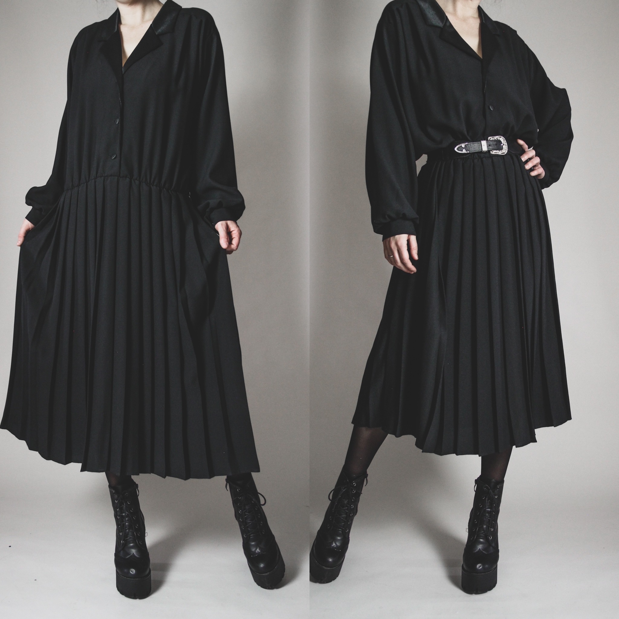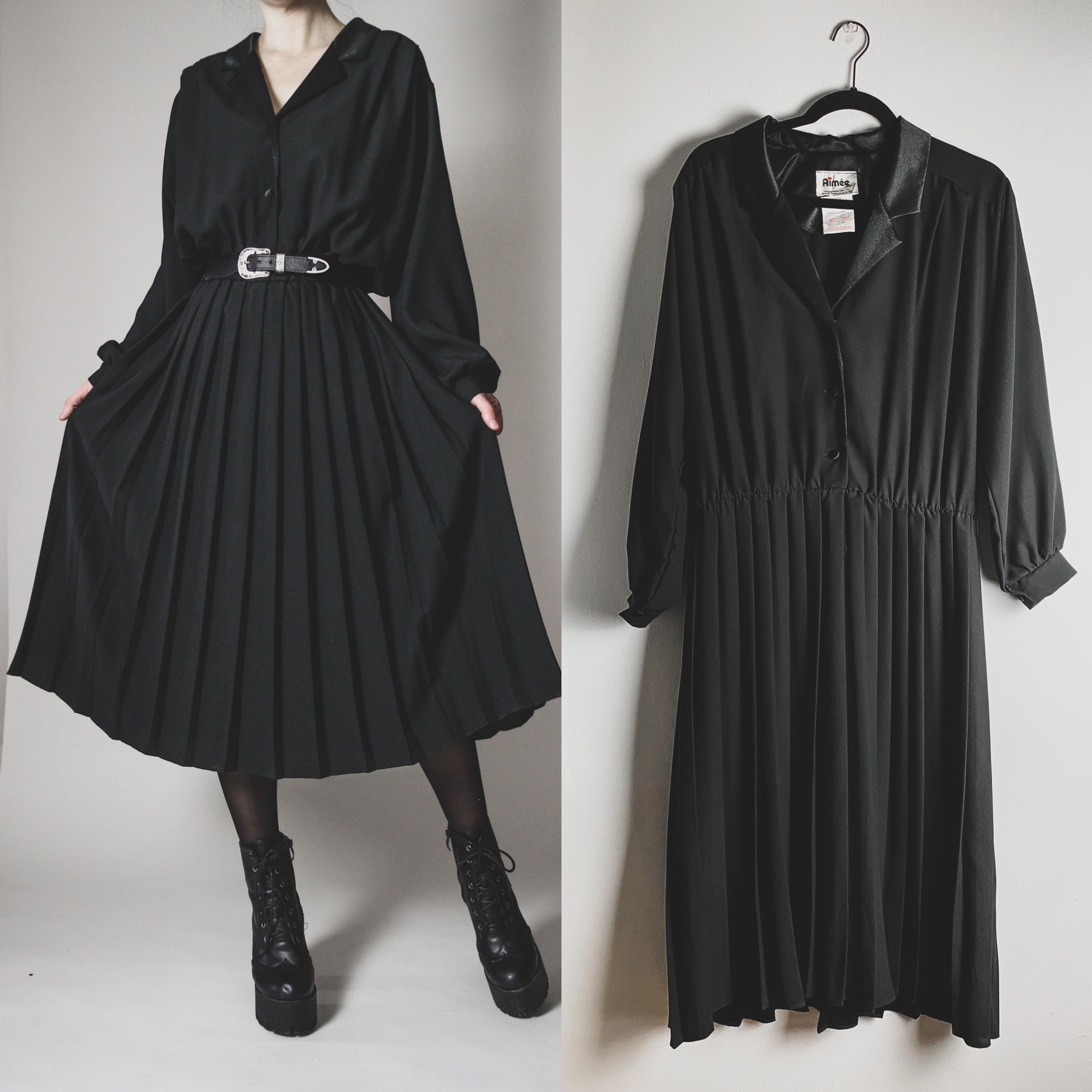 Vintage 70s/80s day dress. So many fun details on this one! Full pleated skirt, slight batwing sleeves, ruched elastic waist, buttons down the front and at the cuffs, and satin lapels and collar. Unlined. 100% smooth, soft polyester, no stretch other than the waist. Cuffs are very fitted when buttoned, with flowy blouse-style sleeves.