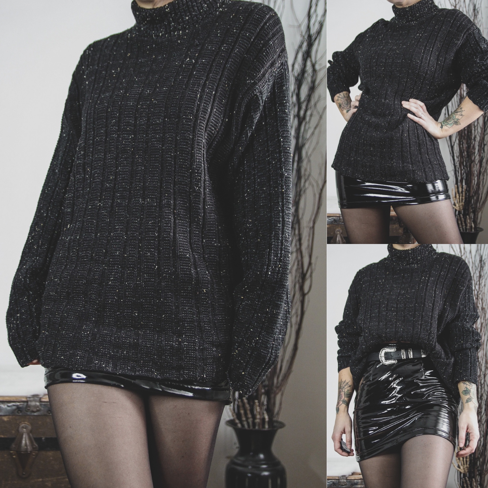 Vintage signature sweater. All Last Rites sweaters are one-of-a-kind unisex finds, straight out of the 70s, 80s and 90s! Chunky, cozy, thick and warm knit, in a tan speckled charcoal black color. Boxy fit with a foldover turtleneck. No fabric tag but feels like 100% cotton or possibly a cotton/acrylic blend. Perfectly broken in with little to no itch factor, unless you're very sensitive to knits.
