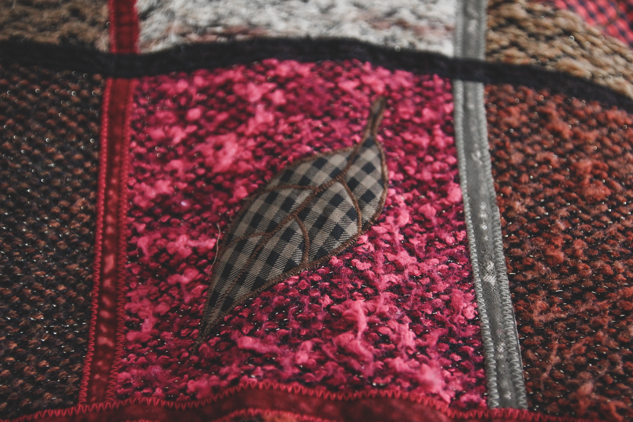 Mixed media knit with calico fall leaf appliques, metallic threading, contrasting faux suede trim, and a wide foldover cowl neck.